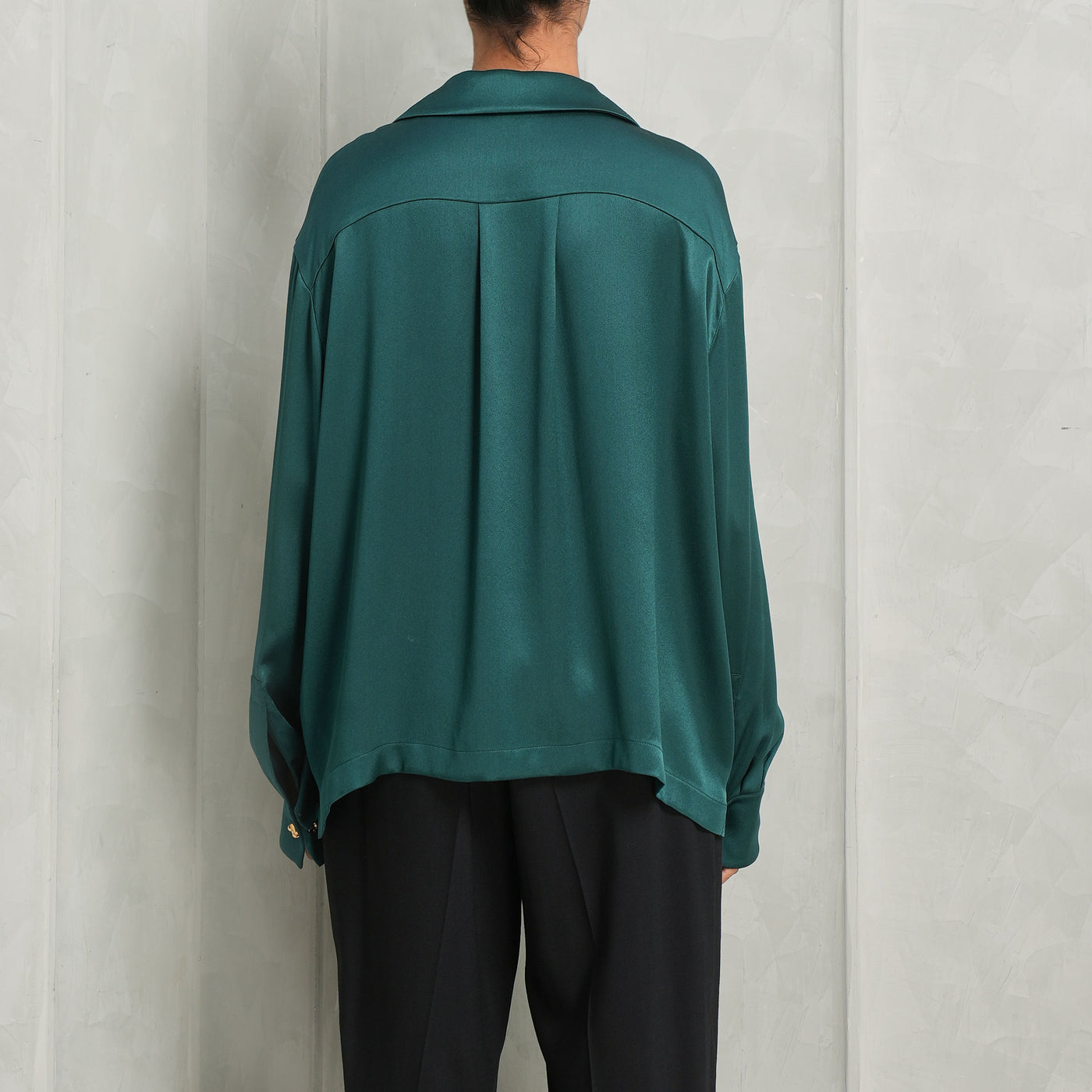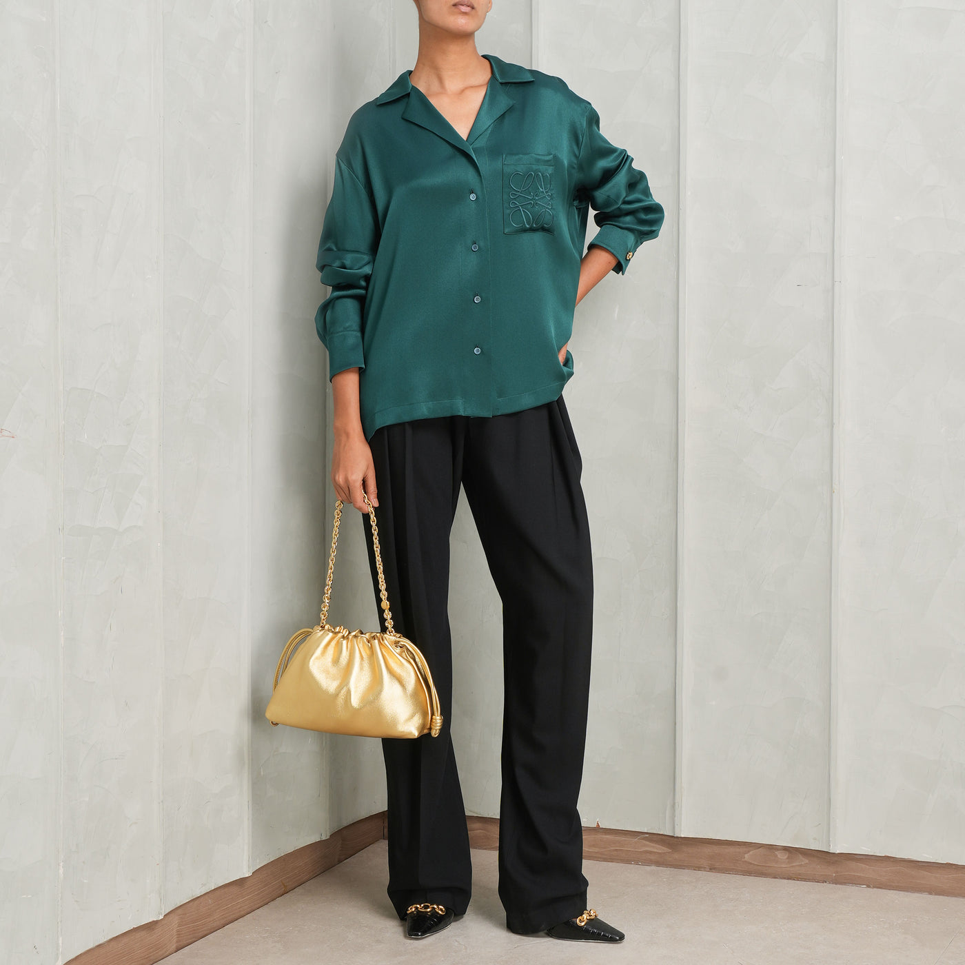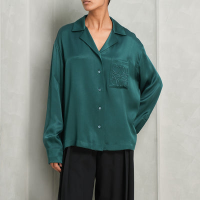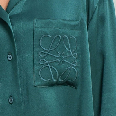 Tailored from a lustrous silk in a refined green hue, the Loewe Anagram Pyjama Blouse exudes ease. This relaxed fit shirt features a discreet Anagram motif embroidered on the left chest pocket, adding a signature accent. Finished with a classic button-down front and cuff, it offers timeless versatility and elevated comfort.