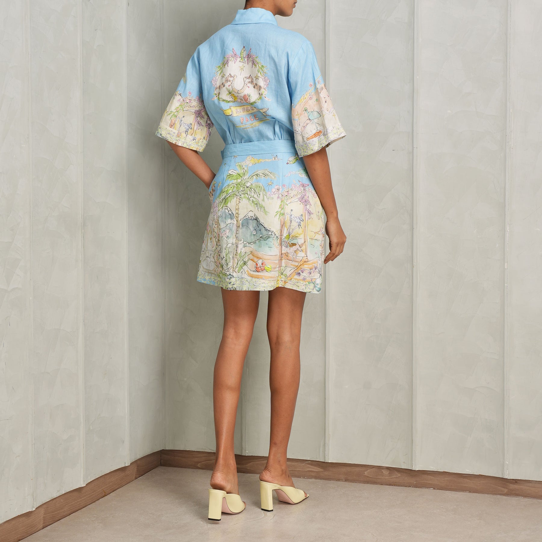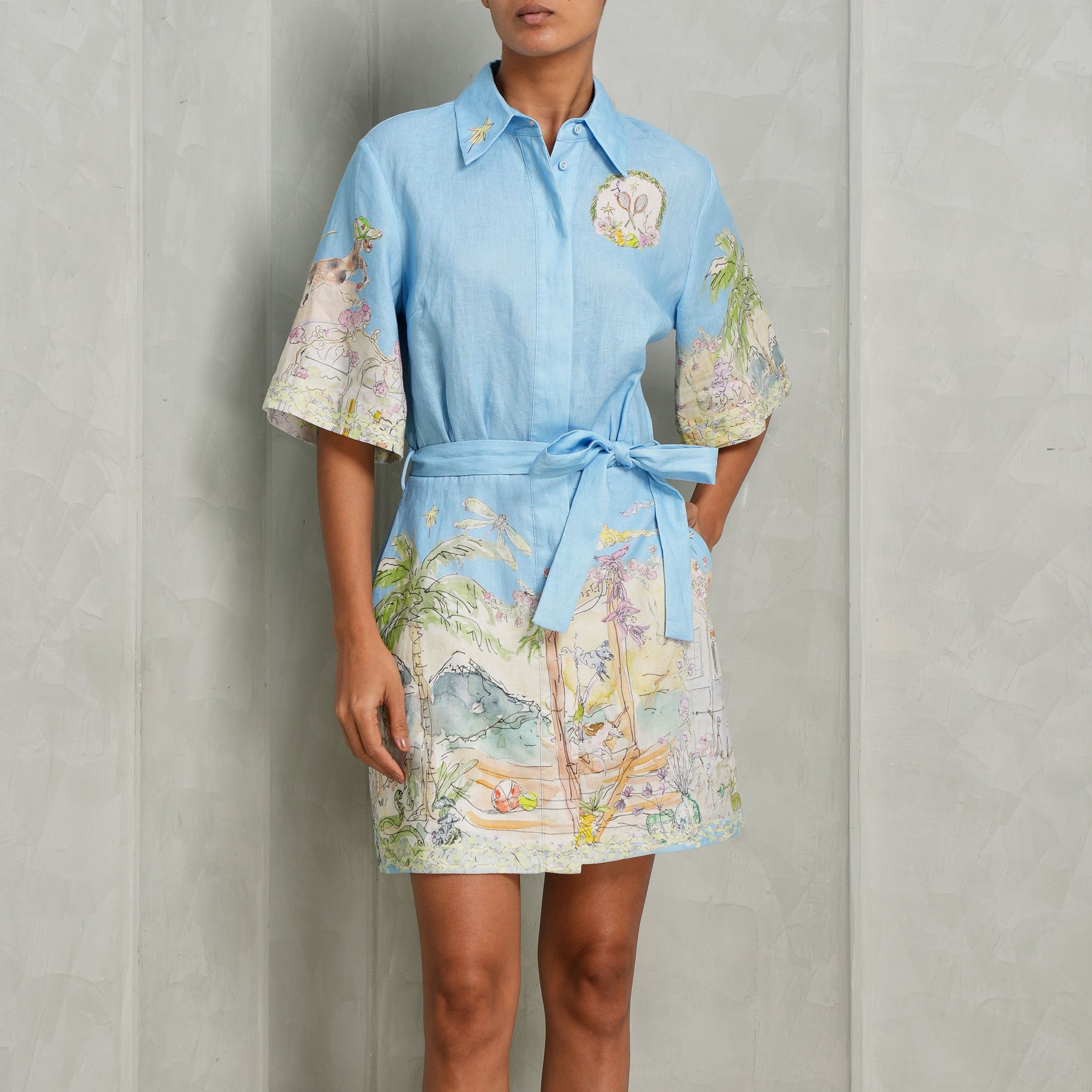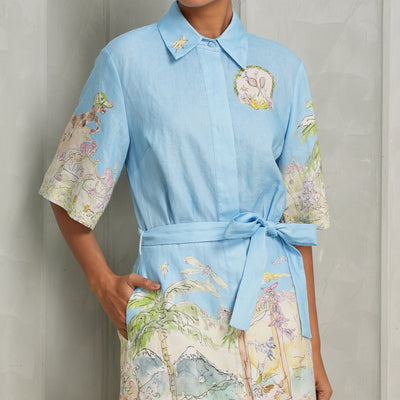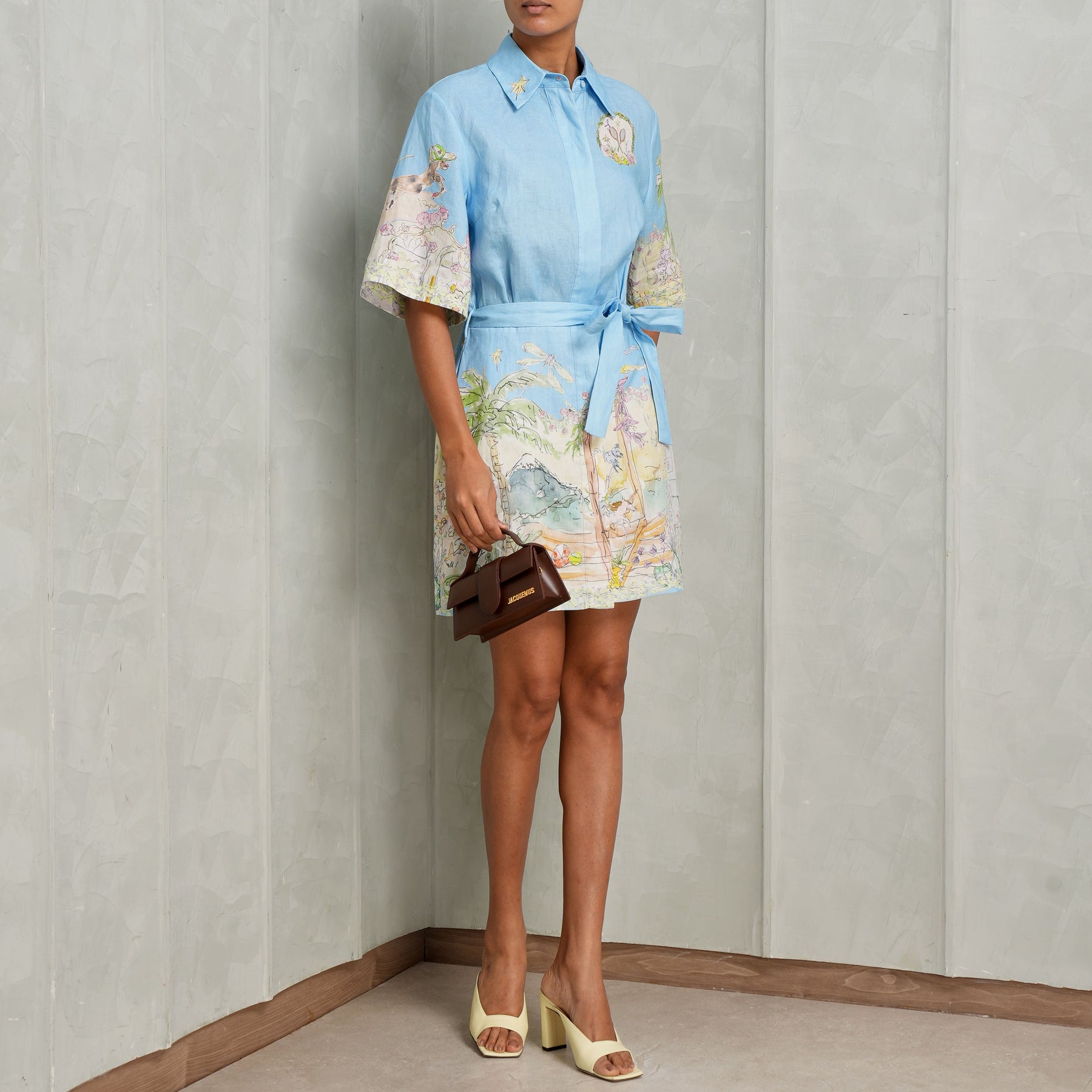 Where art meets tailoring - discover the Alémais Anouk Mini Dress featuring exclusive hand-drawn artwork by Anouk Colantoni. This dress reimagines the classic shirtdress with playfulness. The straight mini silhouette is detailed with a crisp point collar and is accompanied by a concealed placket and delicate shell buttons. The sleeves are finished with soft tucks and elasticated cuffs for a voluminous touch, while the self-tie belt defines the waist with ease. Complete with inseam pockets and a lined skirt, this dress is crafted for everyday expression. Pair it with...