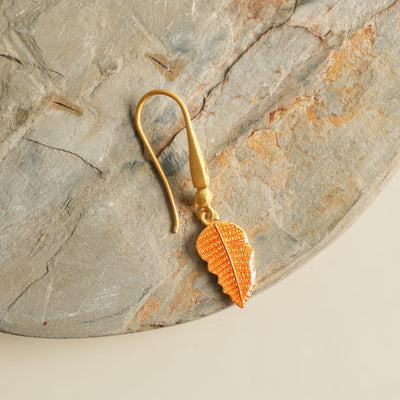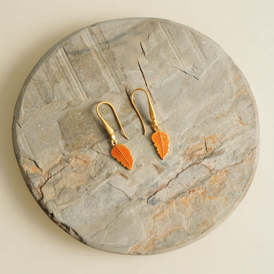 Hand-painted in a warm orange enamel, these Autumn Enamel Earrings from Akansha Sethi capture the richness of the seasonal palette. These leaf drop earrings feature an intricate underlay detailing that adds depth and texture to its contemporary silhouette. Set in 18K gold vermeil, these earrings are a vibrant yet understated ode to the season's beauty.