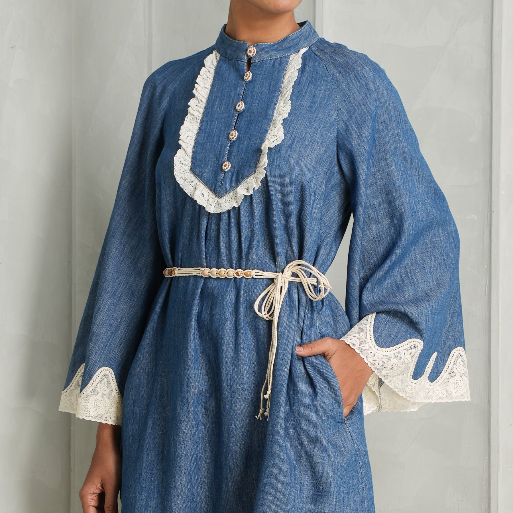 classic denim, featuring a fitted bodice, button-down centre front and a playful A-line skirt. Finished with subtle topstitching and a flattering silhouette, it balances casual ease with refined tailoring. Style this with...