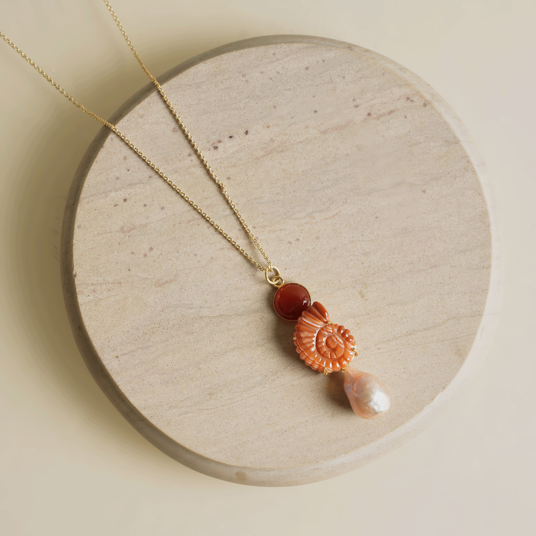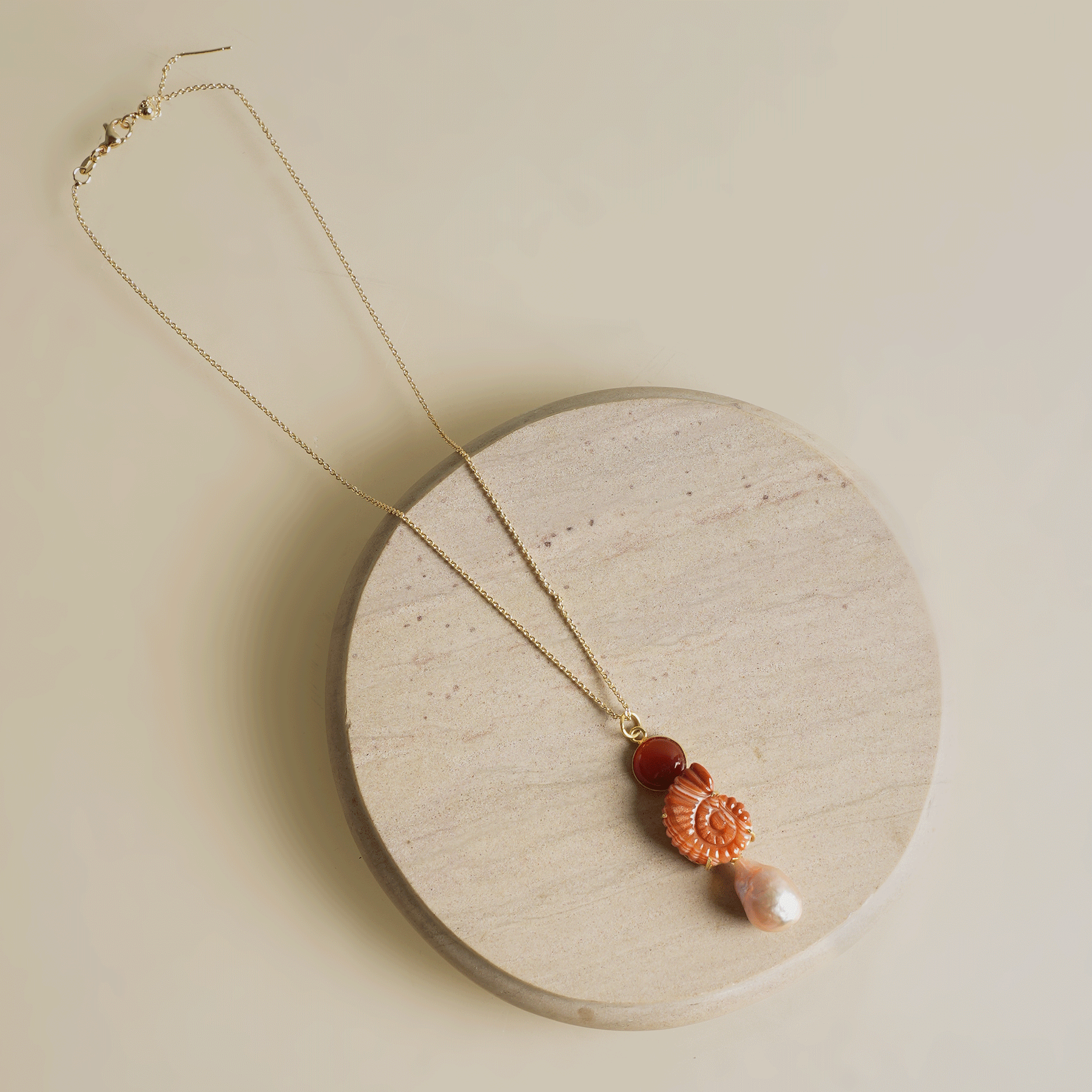 Grounding yet effortlessly playful, the Aarelle Carnelian Necklace mixes warm carnelian with a hand-carved agate pendant shaped like a nautilus shell. A baroque pearl adds a soft glow - imperfect, unique, and special in its own way. It’s a piece for those who feel most themselves by the ocean - steady like the shoreline, curious like the tides. A necklace that reminds you of where you’re headed, and where you came from.