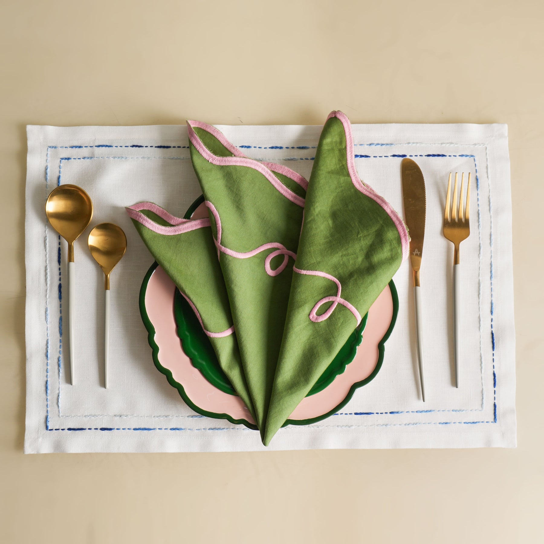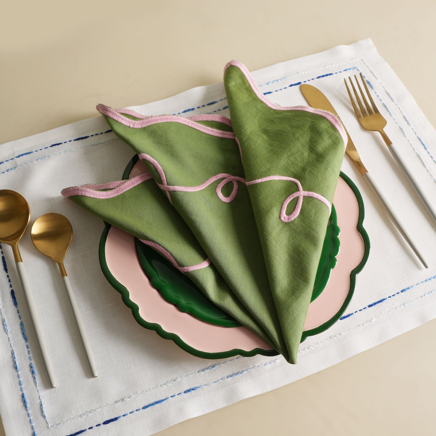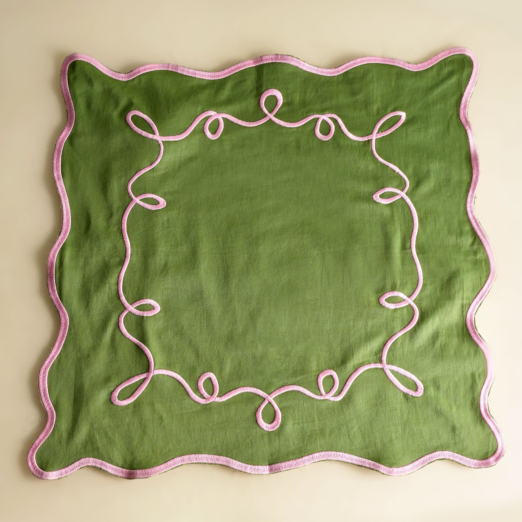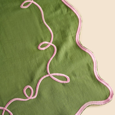 The Patchou Carnival Napkin is woven from cotton silk and is delicately hand-embroidered with Resham. A green base framed with a pink border accentuates this piece, making it graceful, tactile, and versatile enough for every setting.