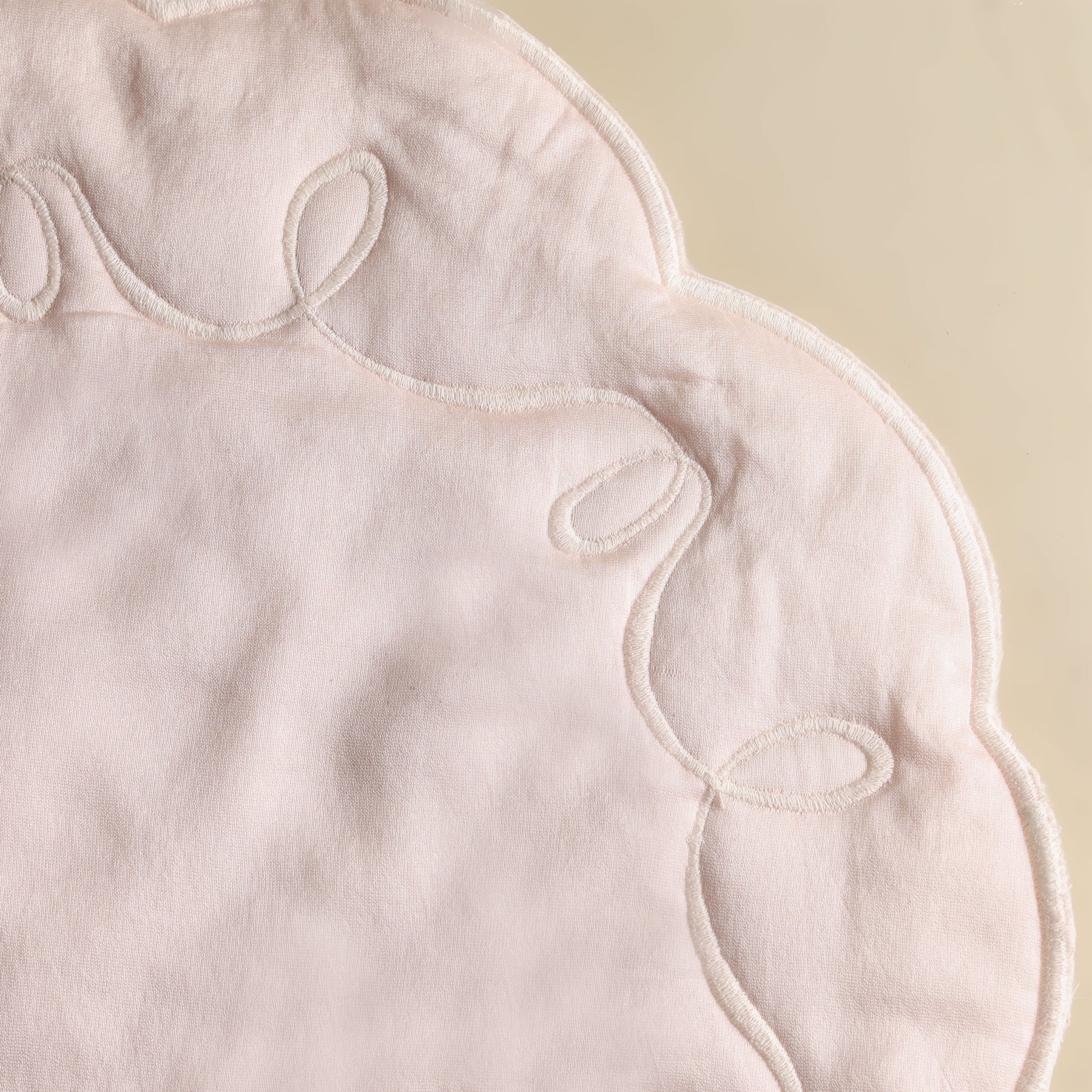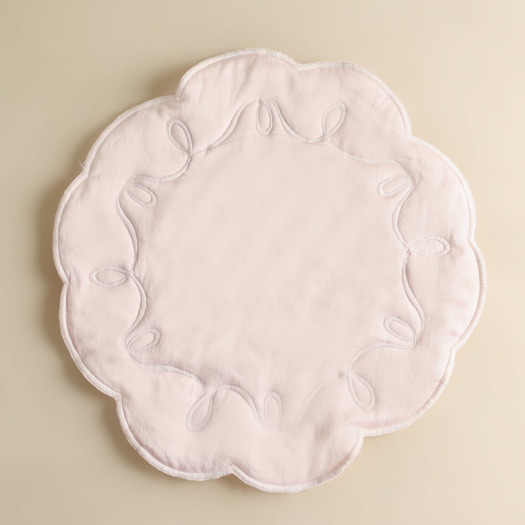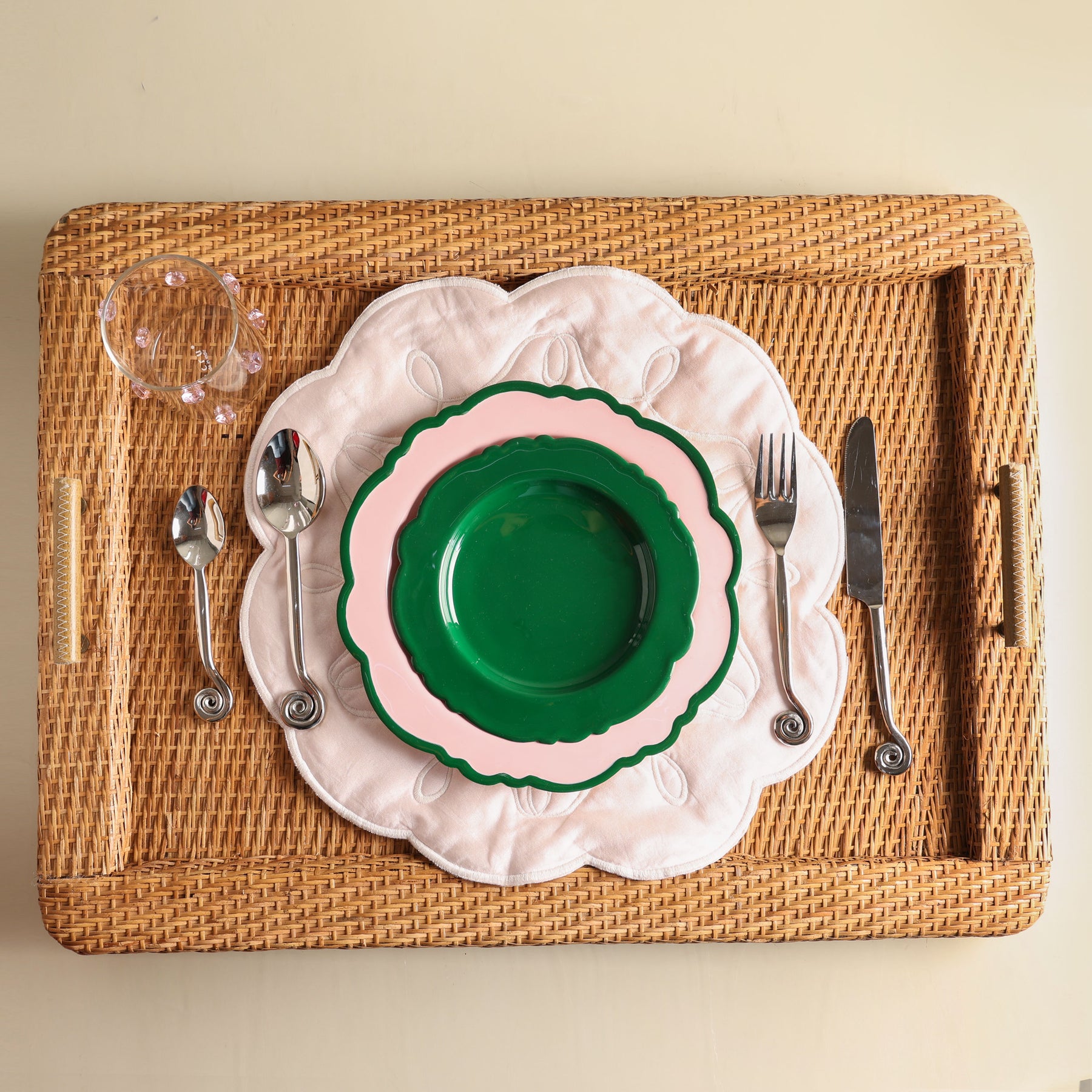 The Patchou Carnival Napkin is woven from cotton silk and is delicately hand-embroidered with Resham. A green base framed with a pink border accentuates this piece, making it graceful, tactile, and versatile enough for every setting.