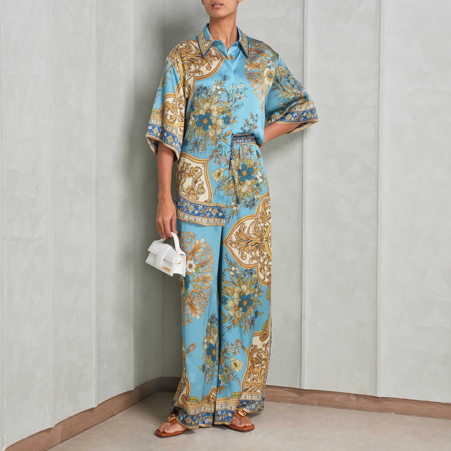 The Cassie Silk Pant from Alémais feature a relaxed jogger silhouette with an elasticated waistband, adjustable ties and bespoke toggle ends. Finished with functional in-seam pockets for ease and comfort these pants pai well with Alémais Cassie Silk Shirt and Bambino Jacquemus bag.