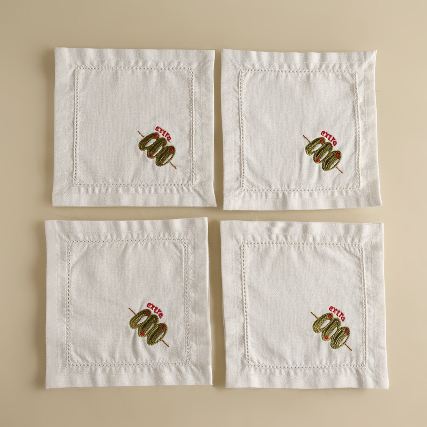 Crafted in white cotton-linen and detailed with intricate threadwork embroidery, Patchou's Cheeky Garnish Cocktail Napkins bring a playful yet refined charm to any setting. Designed to add a touch of whimsy to your table, they’re perfect for elevating evening drinks or laid-back gatherings alike.