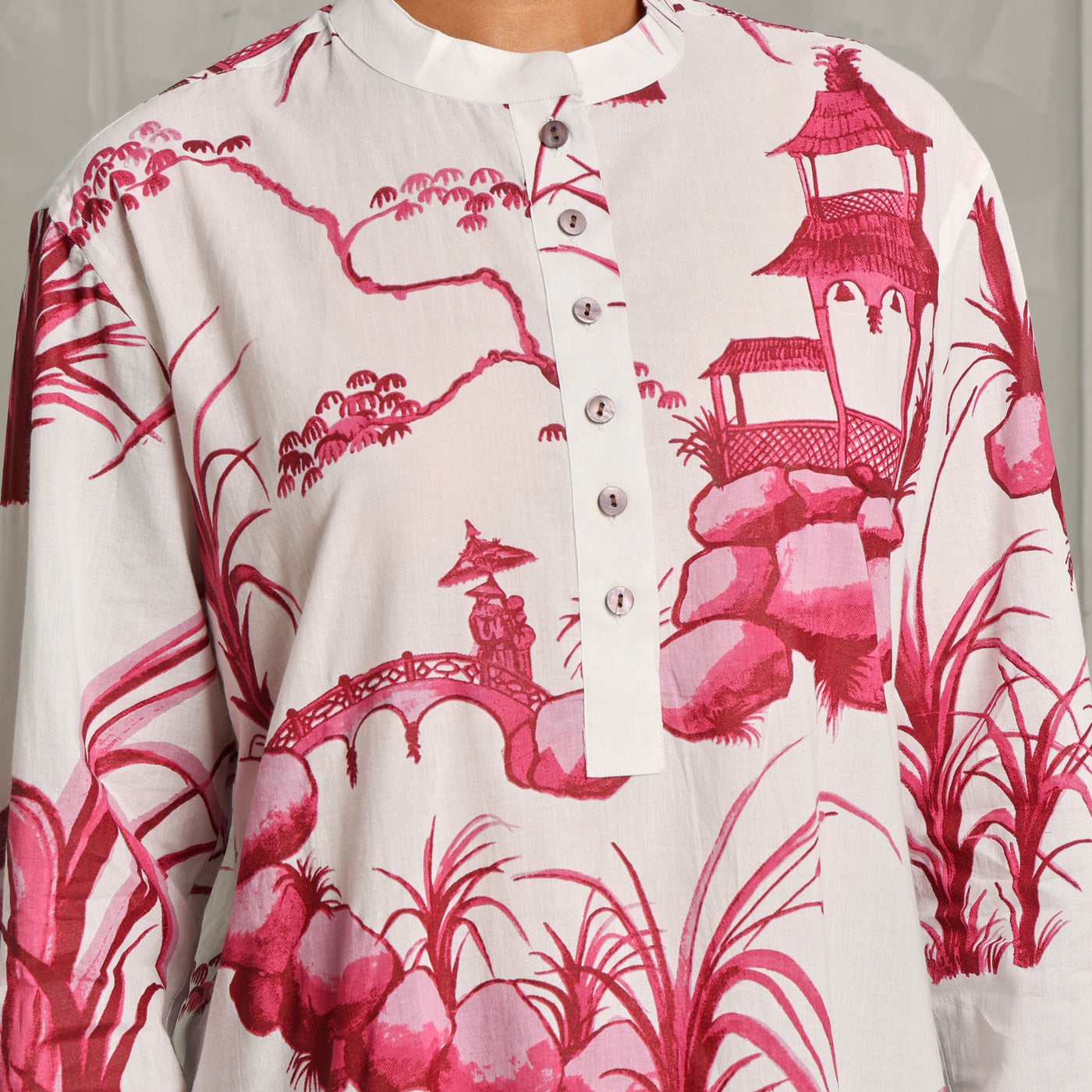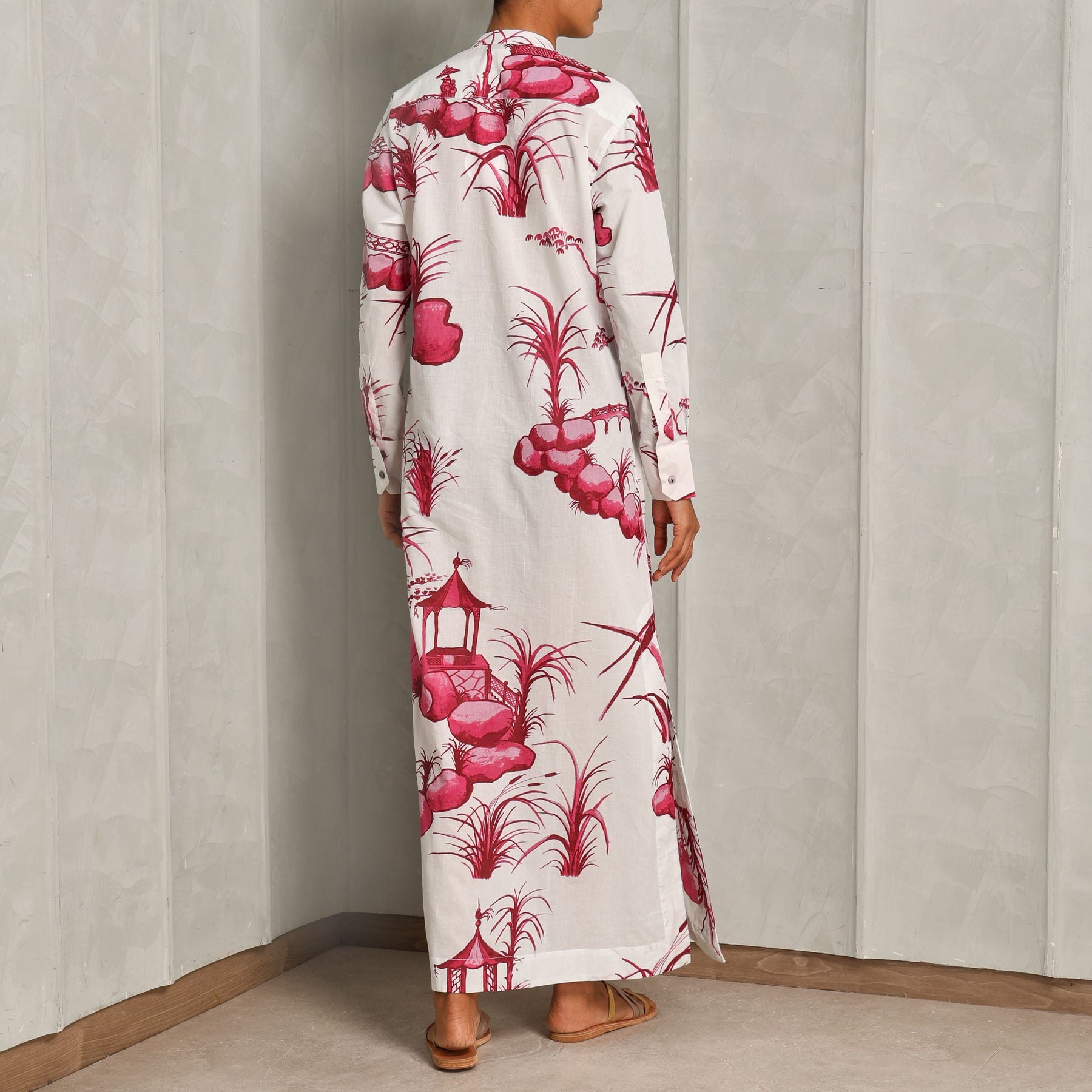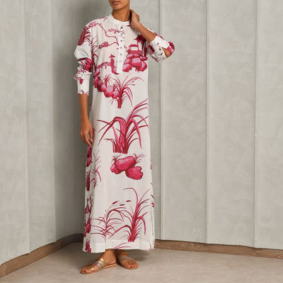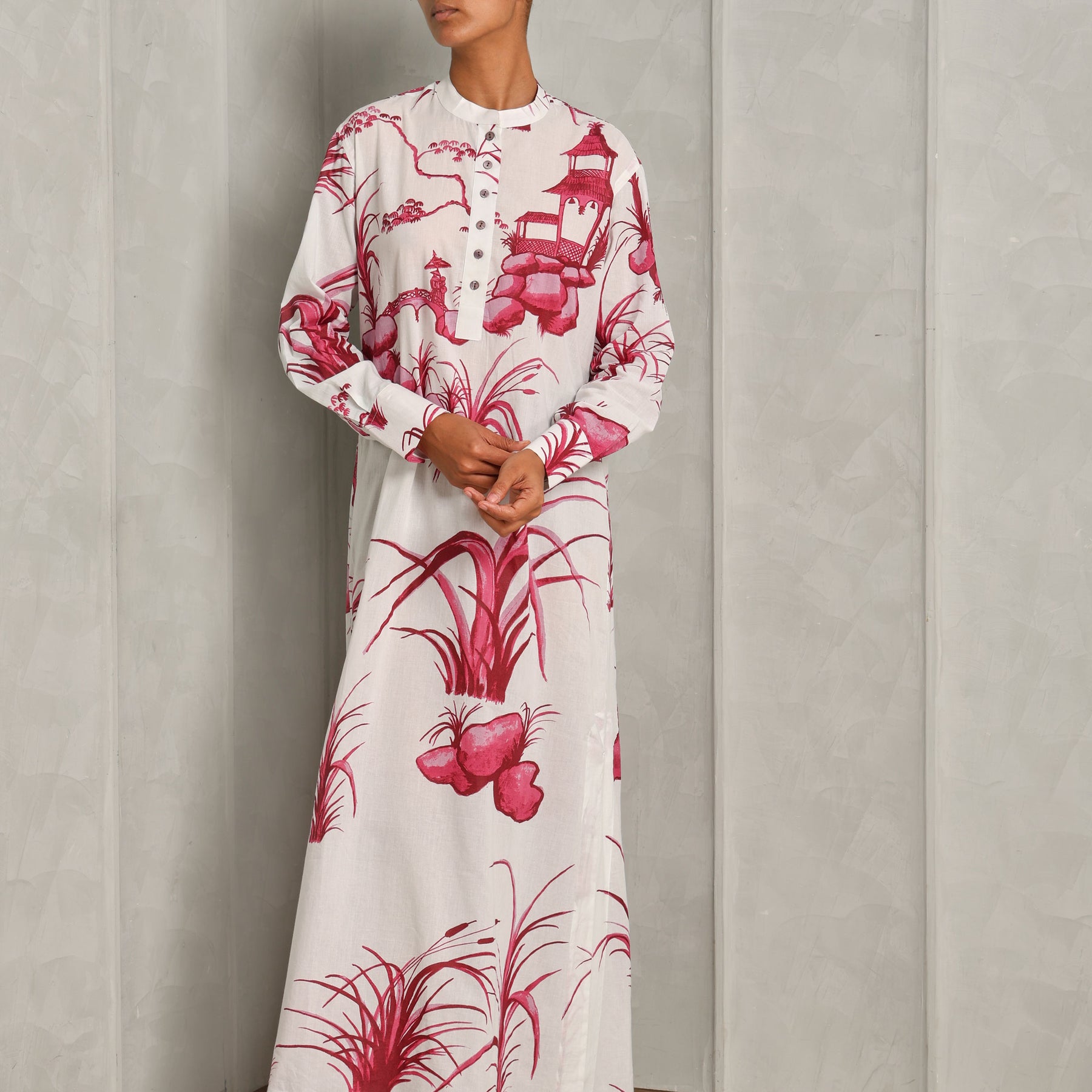 The Chinese Print Long Dress from Idli By Thierry Journo features an interplay of pink and white hues. This long-sleeved dress is crafted from breathable cotton and boasts a gentle drape with refined details that make it perfect for both daytime and evening affairs. Style it with...