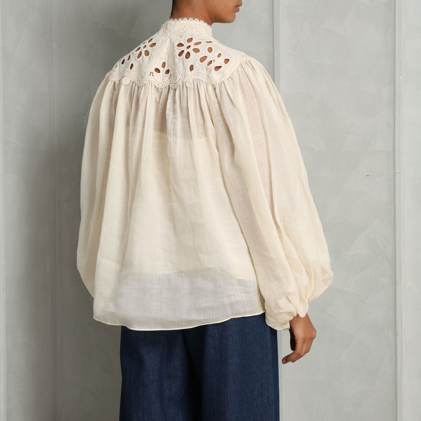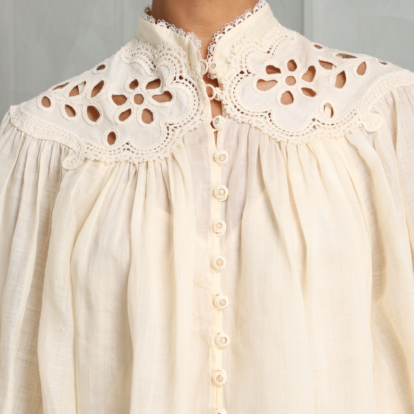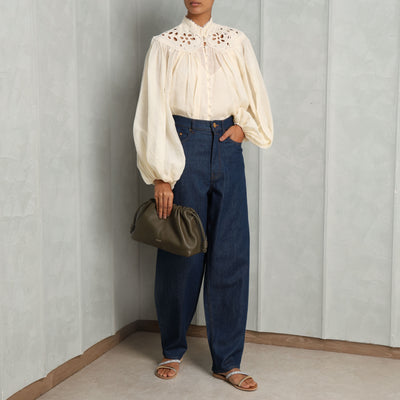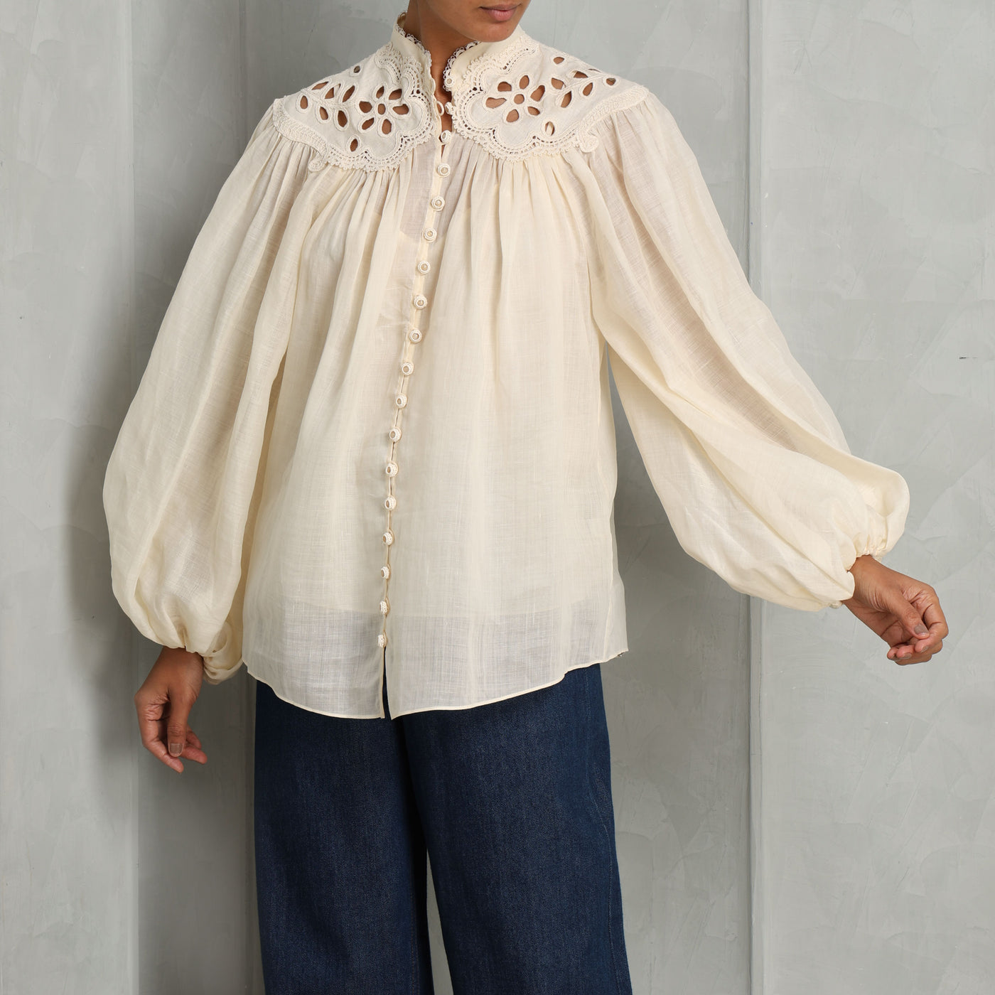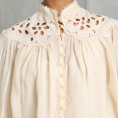 The Coco Embroidered Blouse from Zimmermann is defined by its voluminous billow sleeves and structured stand collar trimmed with scalloped lace. The bodice is softly gathered for shape, while the self-rouleau loops and delicate buttons trace the center front. The elasticated cuffs create subtle volume through the sleeve, and the yoke detailing at the shoulders lend tailored definition to this airy silhouette. Light, textured, and thoughtfully detailed - style this with Zimmermann's Barrel Jeans.