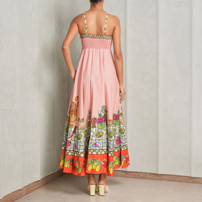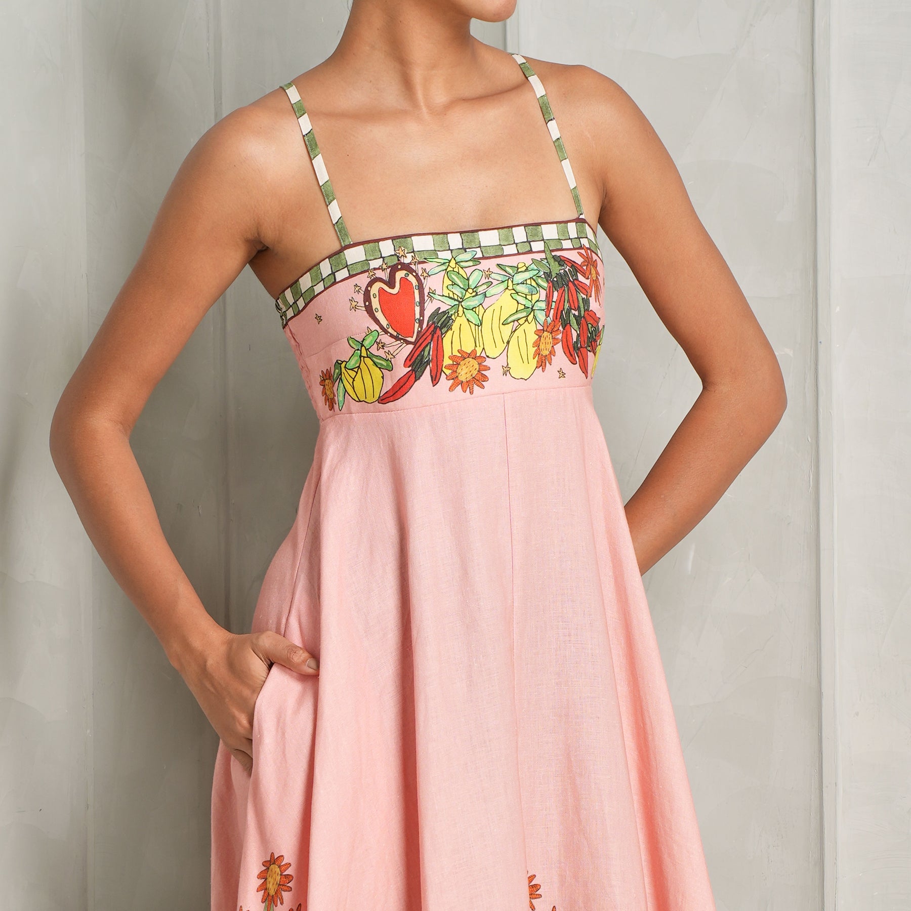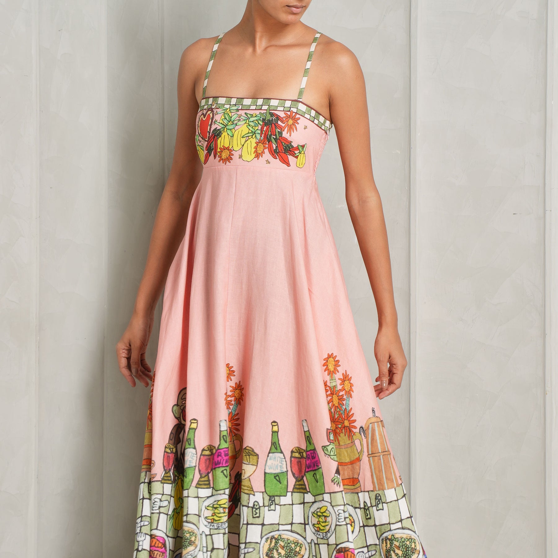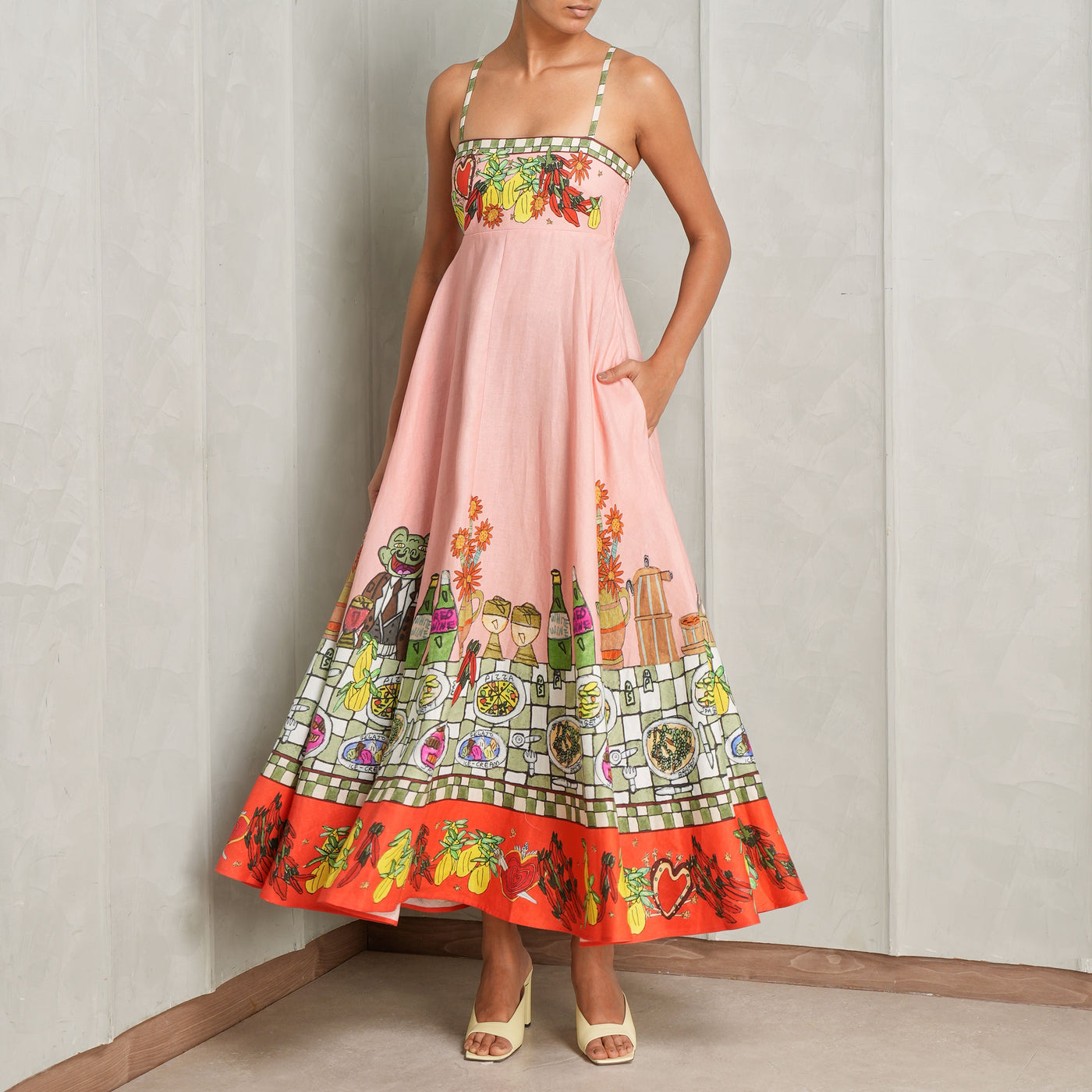 The Alémais Contessa Sundress features exclusive artwork in collaboration with Greg Sindel of Studio A. This dress is designed in a midi sundress silhouette with adjustable straps, a shirred back panel for comfort, and an invisible side zip for a seamless fit. It is finished with practical inseam pockets for ease and wearability.