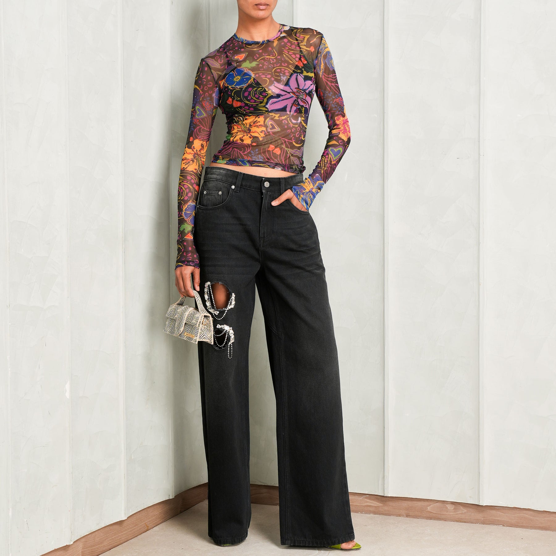 The Crystal Chain Cutout Relaxed Jean from Area blends a soft, easy silhouette with statement crystal-chain cutouts that illuminate the design with light-catching movement. A refined balance of comfort, edge, and artistry. Complete your look Hotfix Printed Tulle Long Sleeve Top and Bambino bag from Jacquemus.