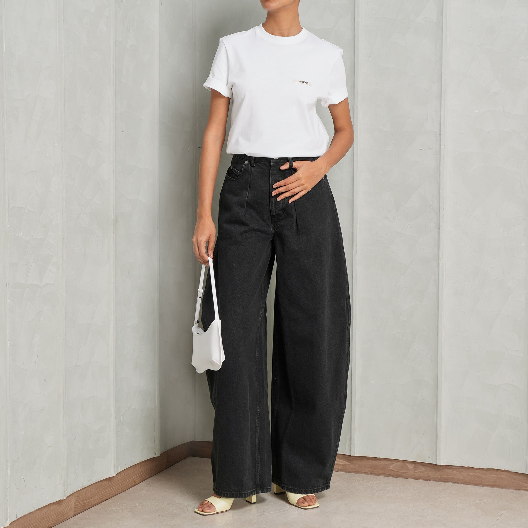 Elevate everyday dressing with the Jacquemus Curved-Leg Jeans - crafted from raw denim and cut with exaggerated, curved legs that create a sculptural silhouette. Finished with a high-rise waist, they bring an effortless statement shape to casual looks. Style them with Gros Grain Logo T-shirt and Le Bisou Shoulder Bag by Jacquemus.