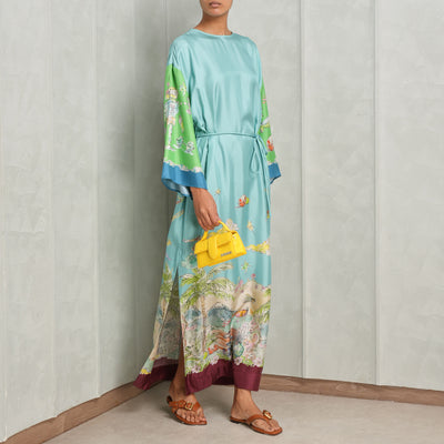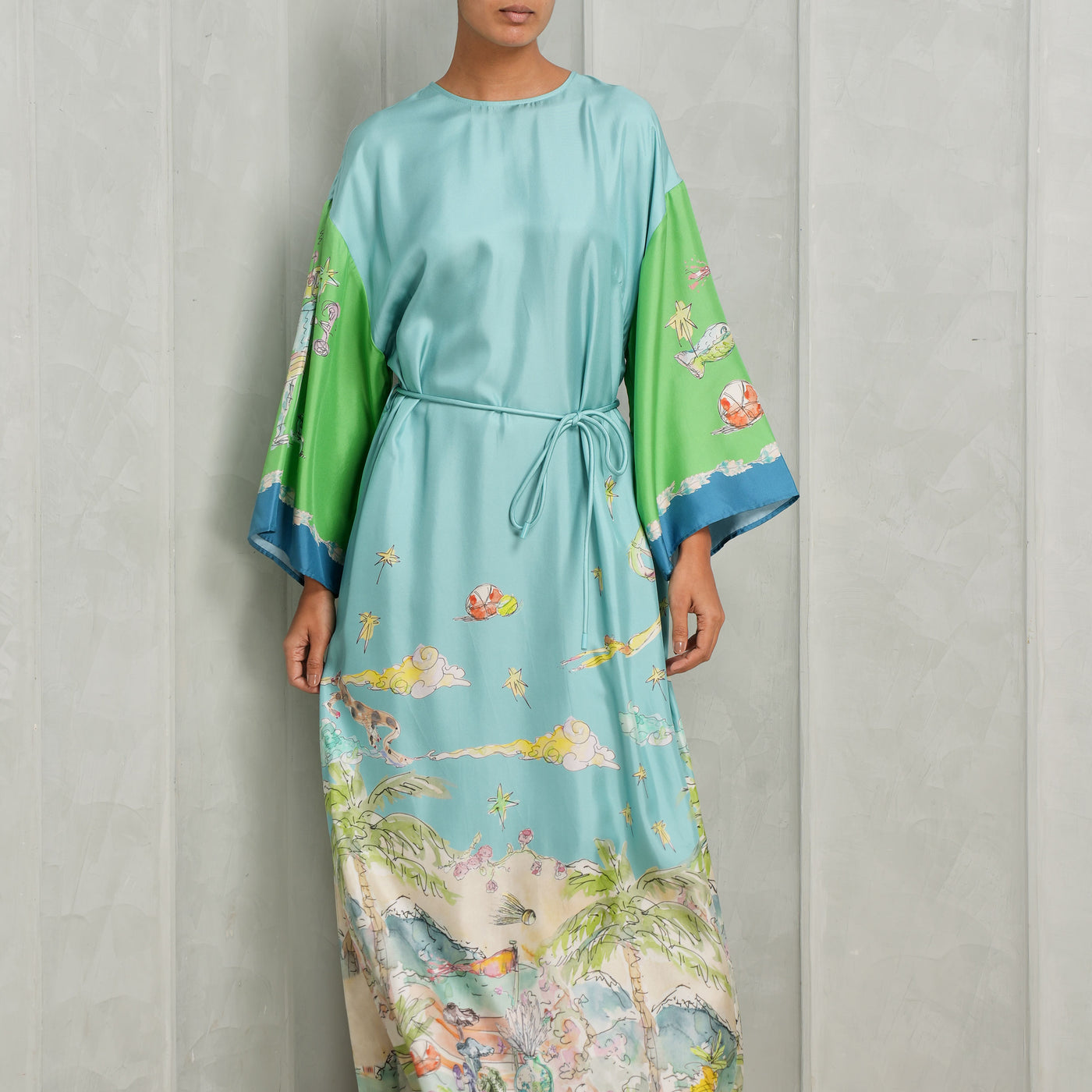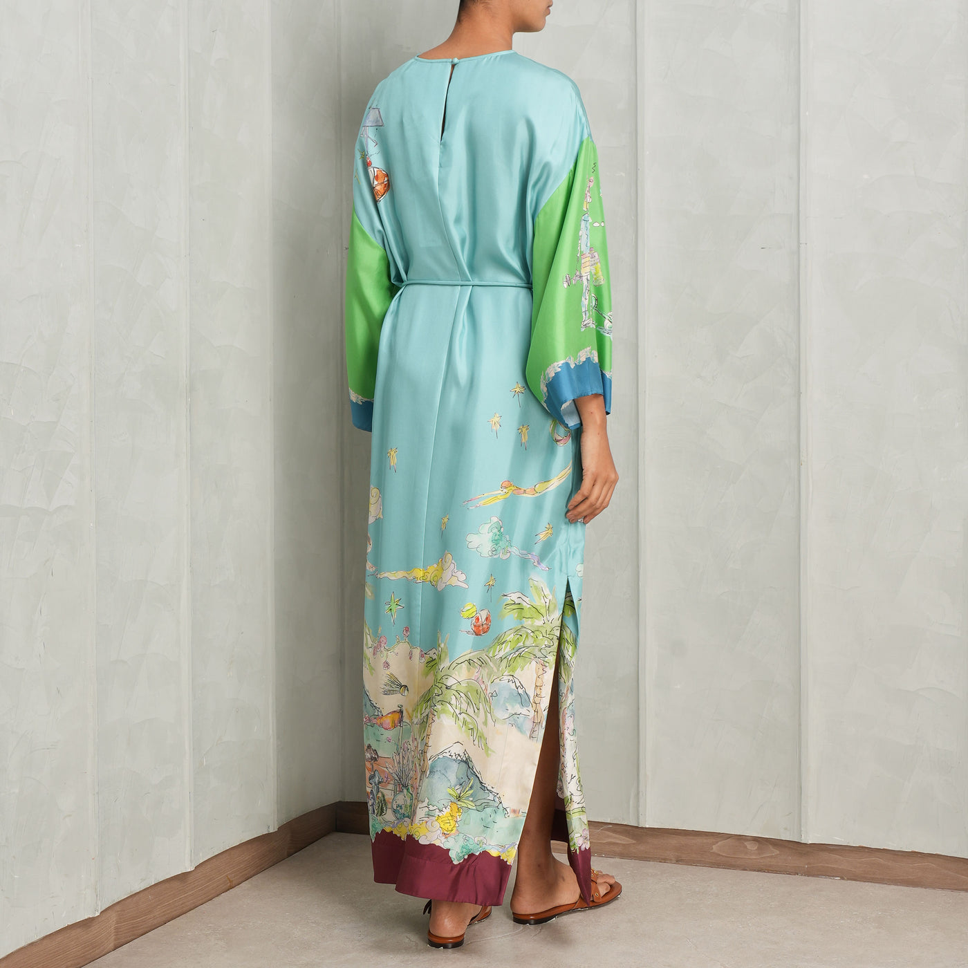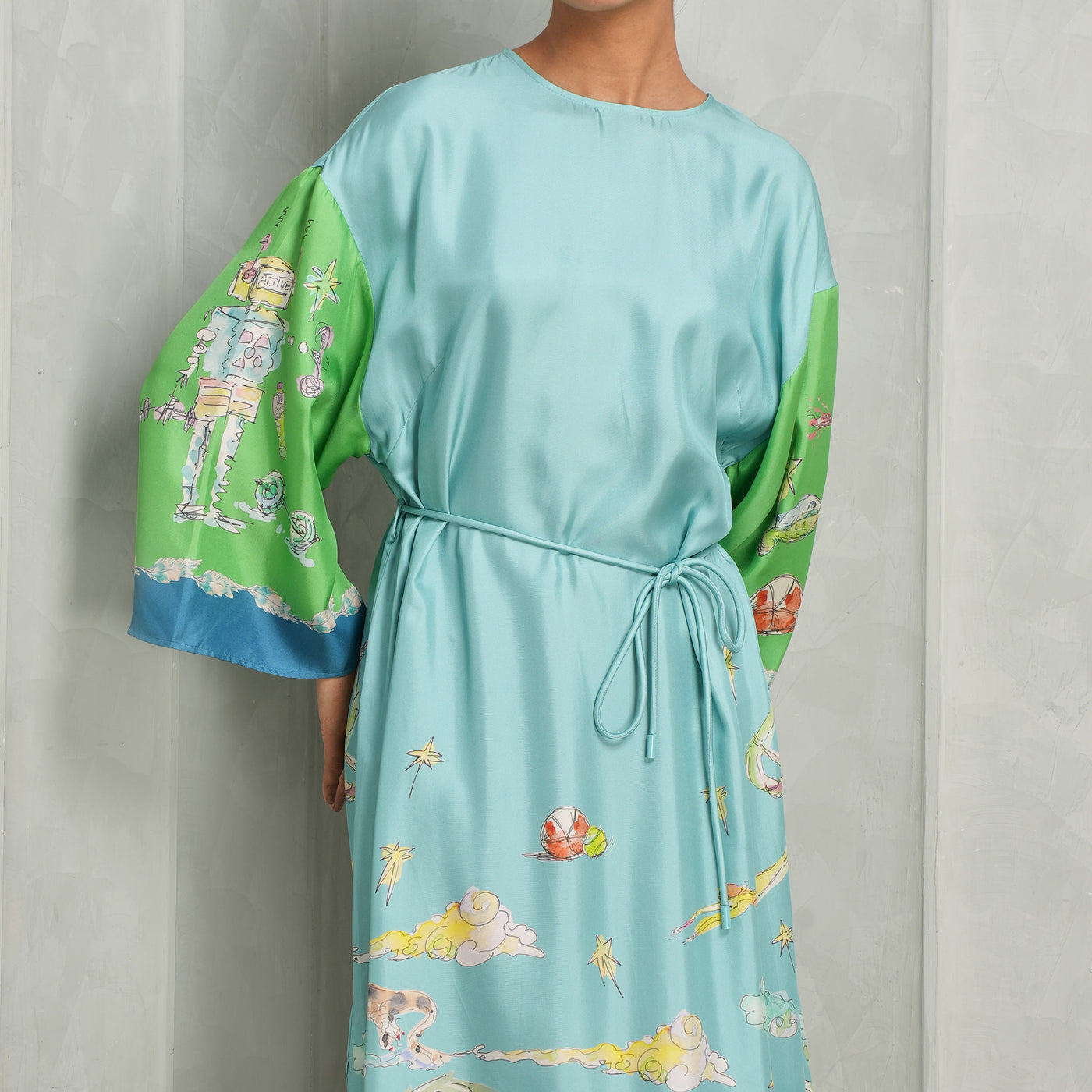 A canvas of wearable art - introducing the Daria Silk Midi Dress from Alémais. This dress showcases exclusive hand-drawn artwork by Anouk Colantoni. Designed in a relaxed silhouette with a classic round neckline and straight sleeves, this dress is both functional and elevated. With a loop-and-button closure at the back, a side split, and a self-rouleau belt, this dress is crafted with ease. Style it with...