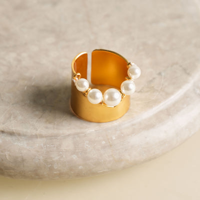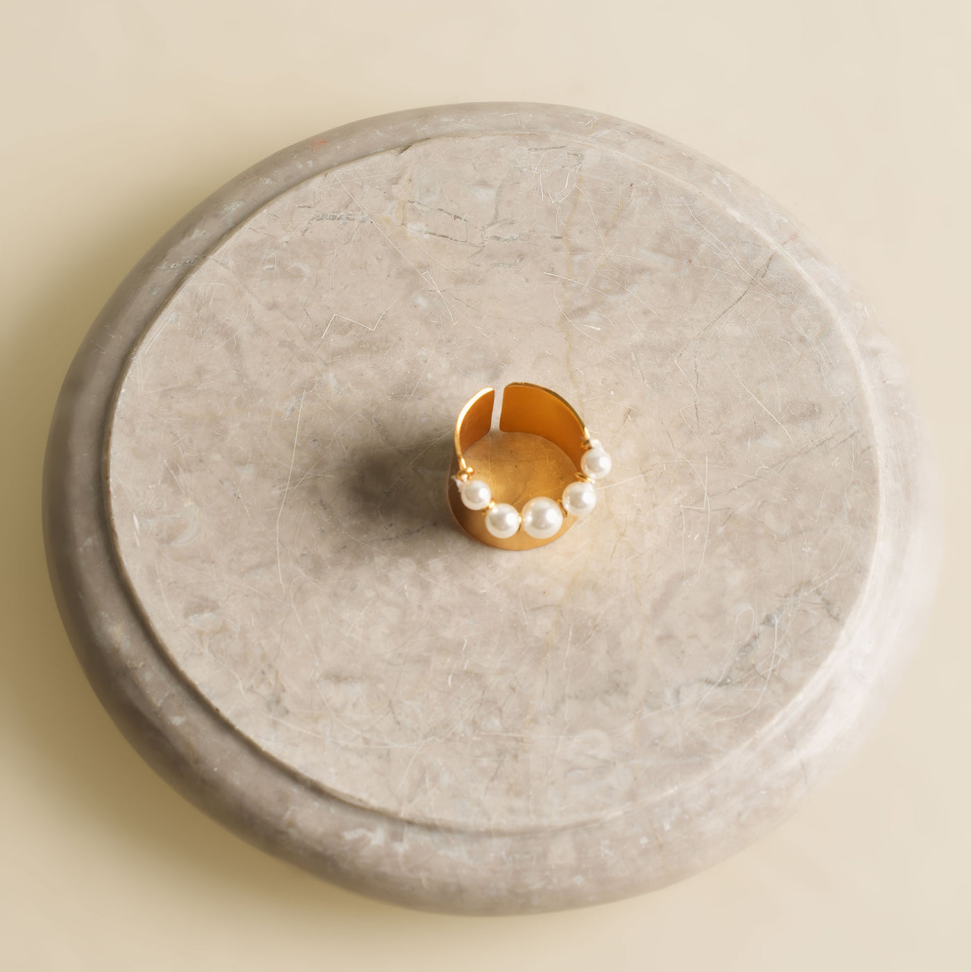 A modern ode to timelessness, the Edge Ring from Anāash features a trio of luminous pearls in delicate sizes. Their soft white radiance is perfectly balanced by a base of hypoallergenic brass, finished with 22k gold plating. Designed for versatility, this ring's adjustable fit ensures comfort while maintaining a sleek, minimal silhouette. Whether worn alone or layered for a bolder statement, this piece embodies classic charm.