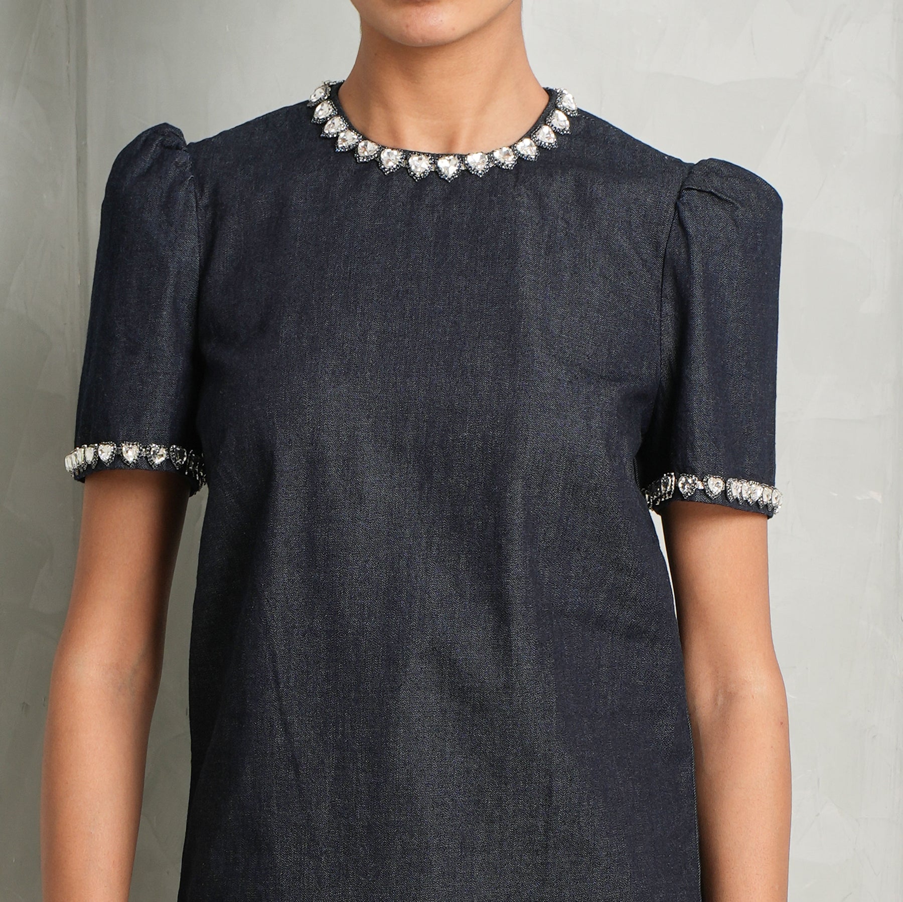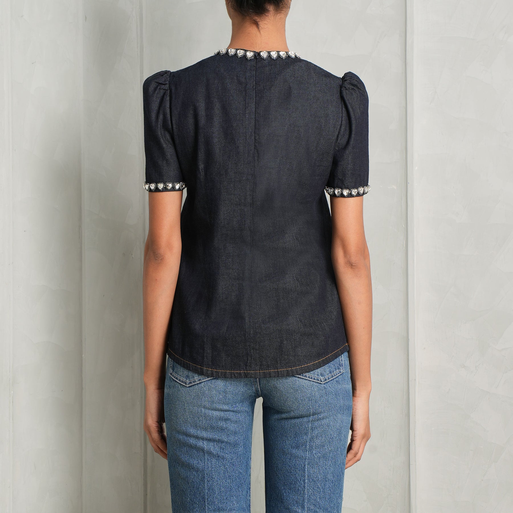 Zimmermann's Embellished Denim Top is reimagined with delicate embellishment. Crafted from cotton denim, it features heart-shaped crystal trims that glisten along the neckline and sleeves. The gathered shoulders create a soft, puffed silhouette, balanced by structured short sleeves with tulle inserts for subtle volume. Finished with an invisible zip at the back for a seamless close, this top pairs well with Bambino bag by Jacquemus.