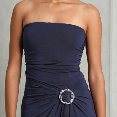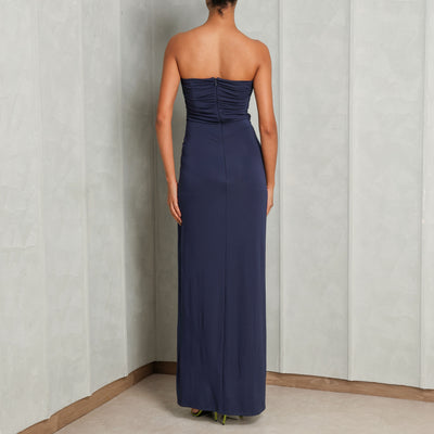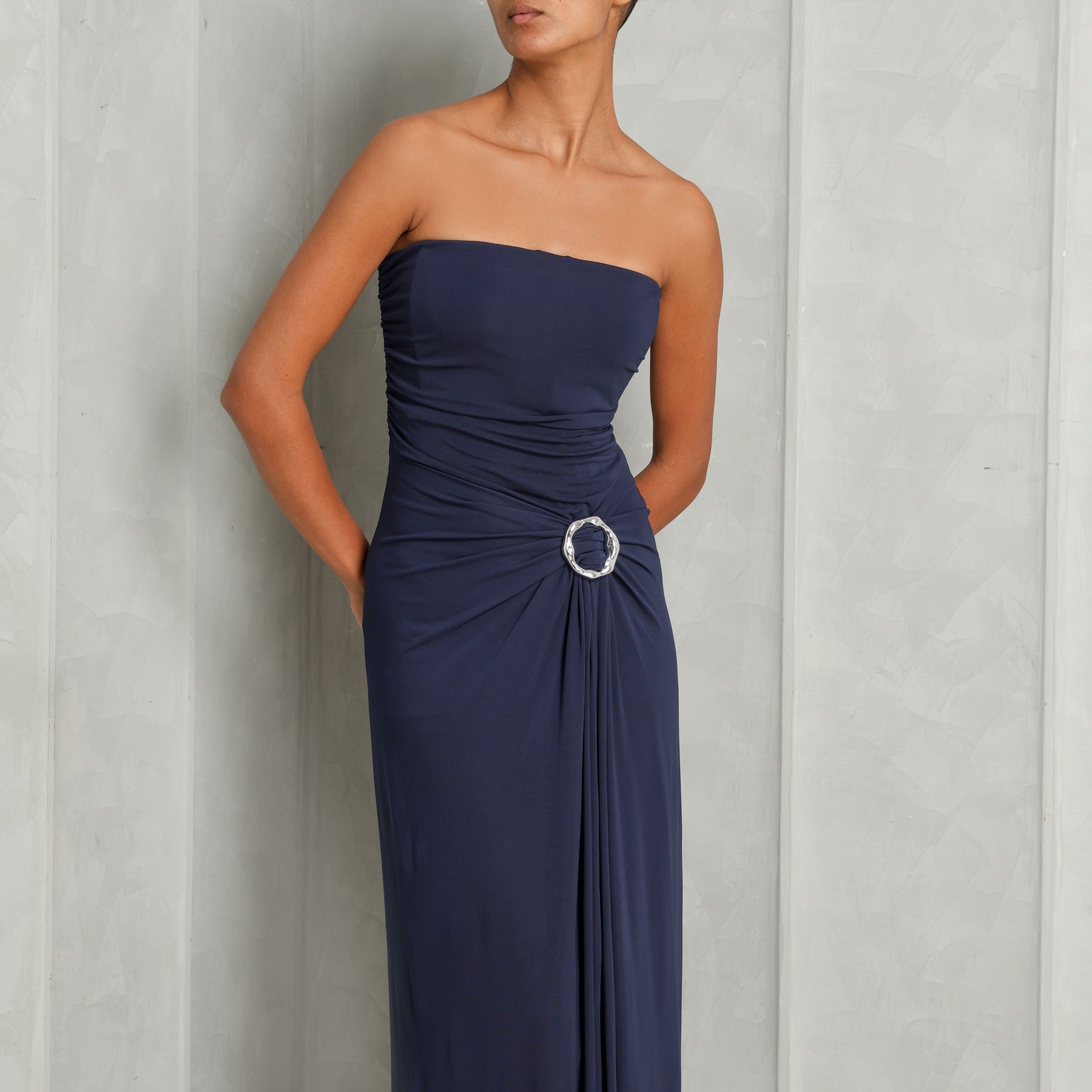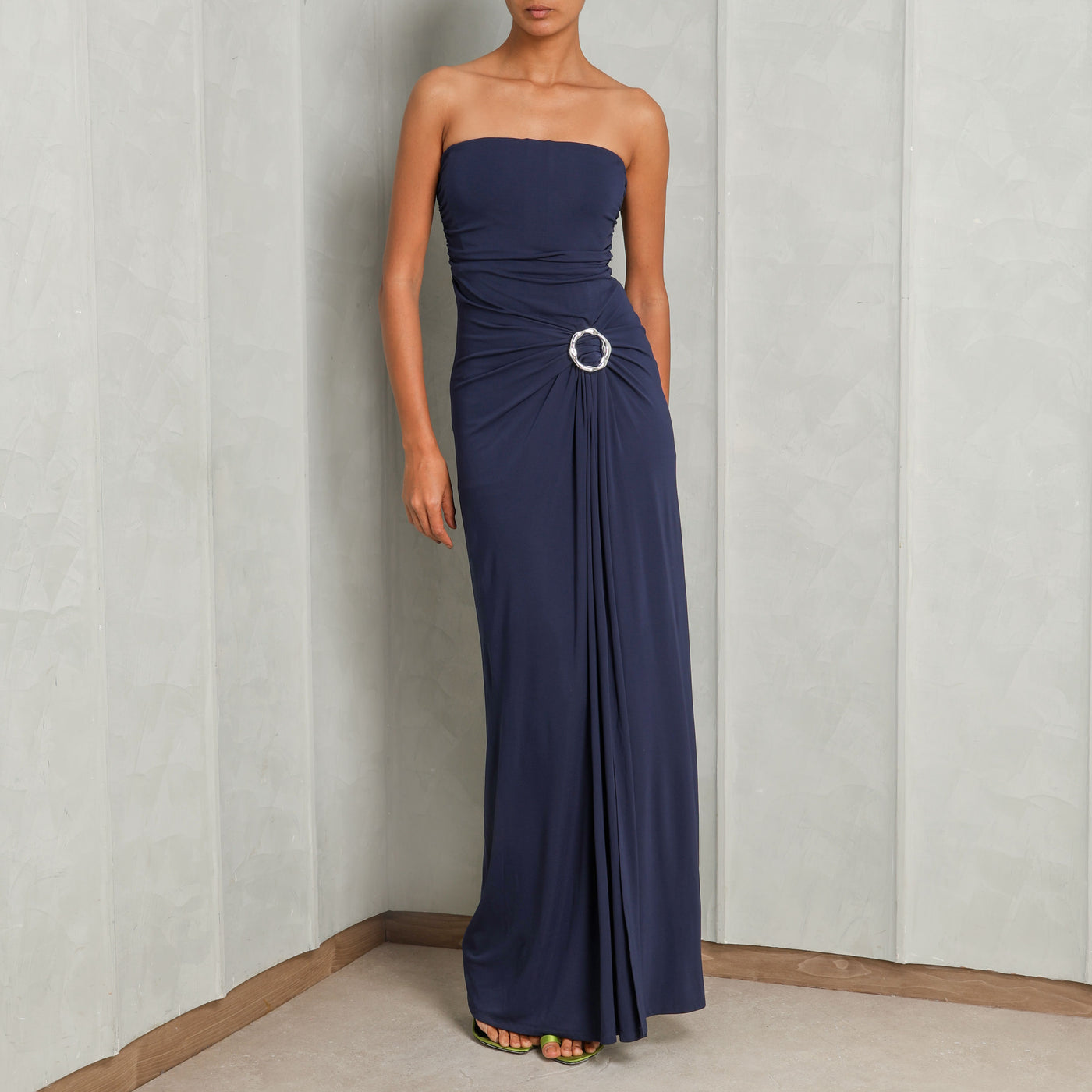 Crafted in sumptuous jersey, the Emma Jersey Strapless Gown from Simkhai sculpts the form with fluid draping that gathers with ease. An asymmetrical hardware detail punctuates the silhouette, balancing softness with a modern edge.