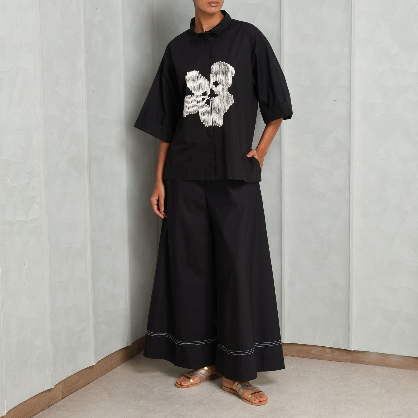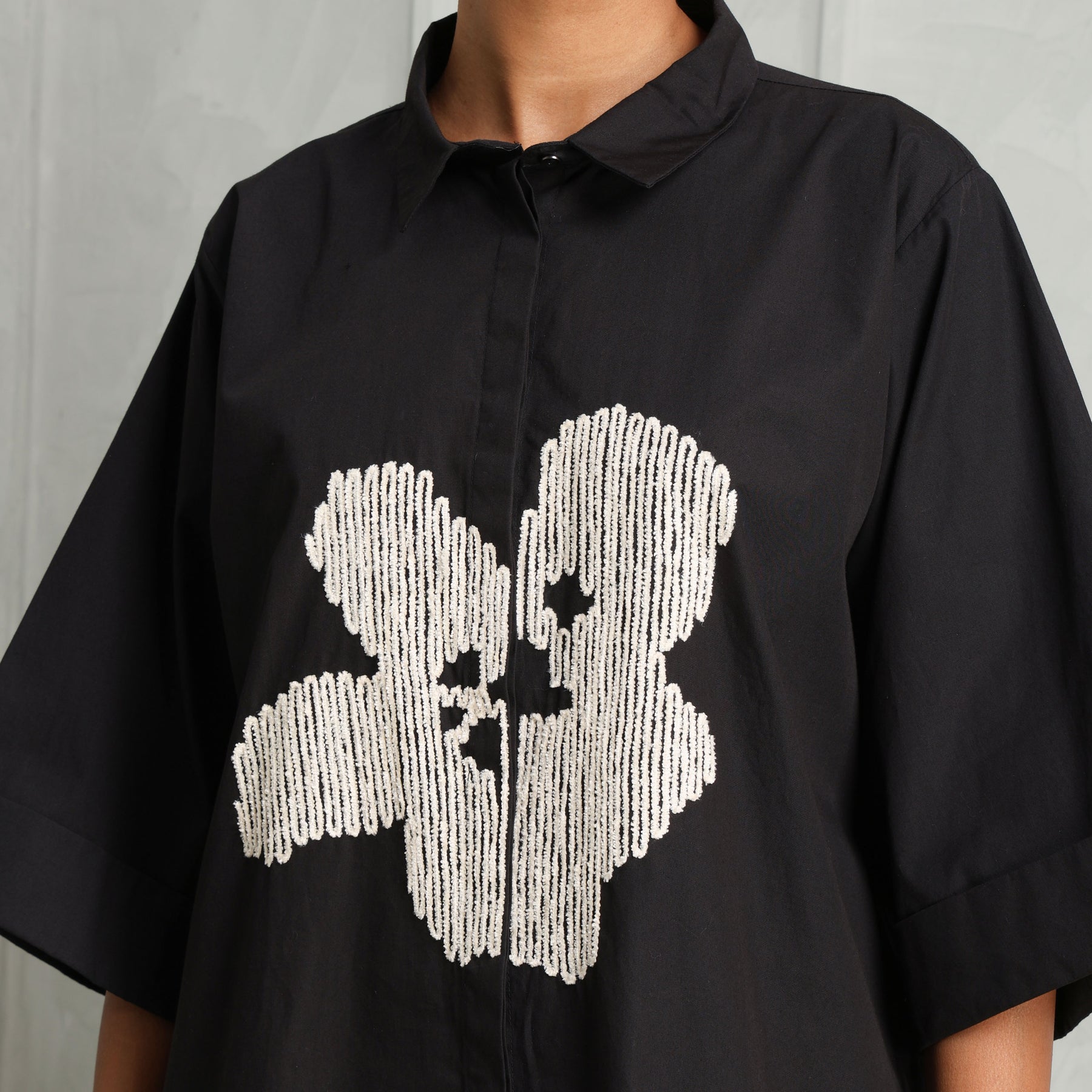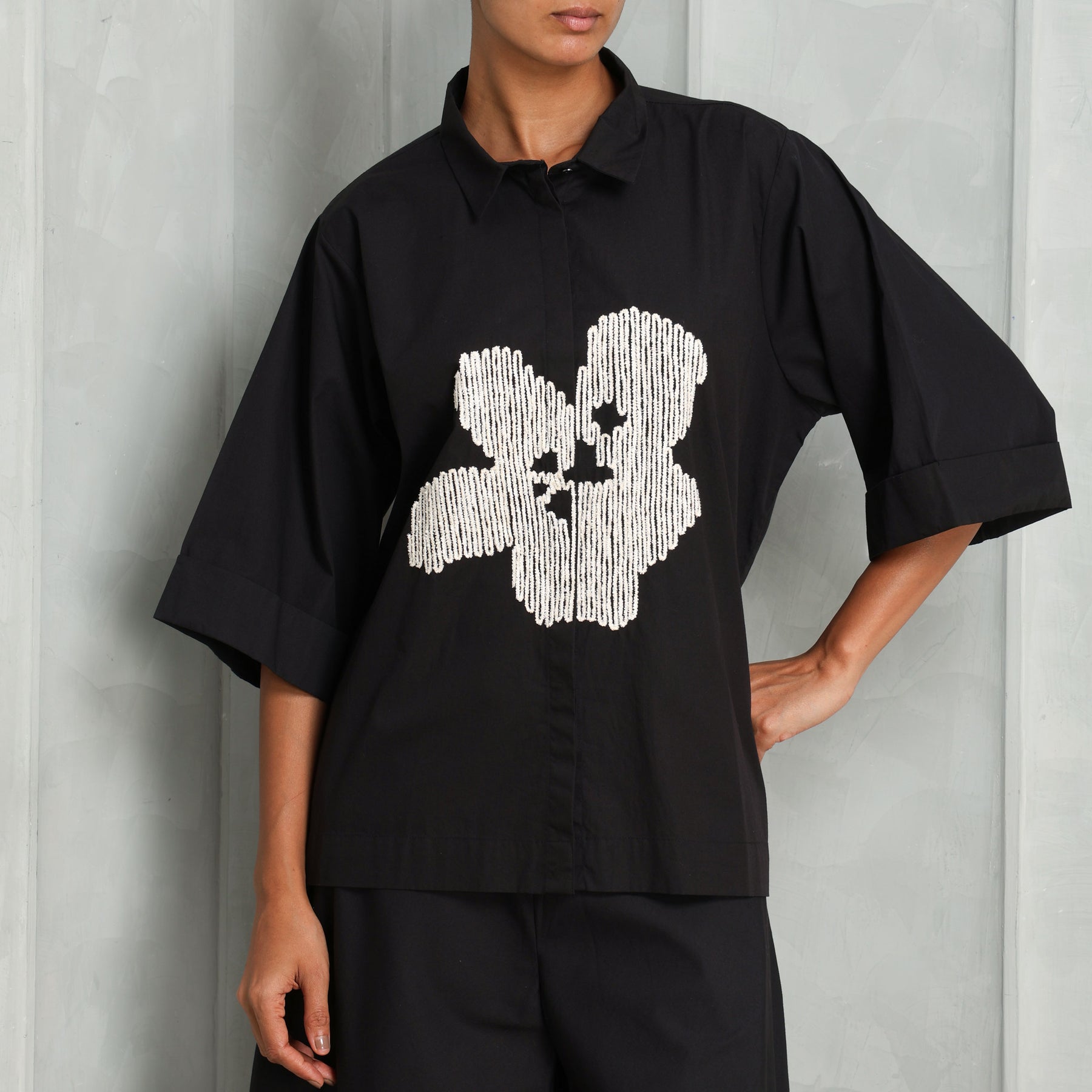 The Floral Embroidered Shirt from Three is floral but not fragile — the black cotton poplin shirt is a juxtaposition of floral delicacy and a structured silhouette. The intricate embroidery contrasts against the dark base, adding texture and detail to a relaxed silhouette. Ideal for both desk-to-dinner and artfully undone styling.
