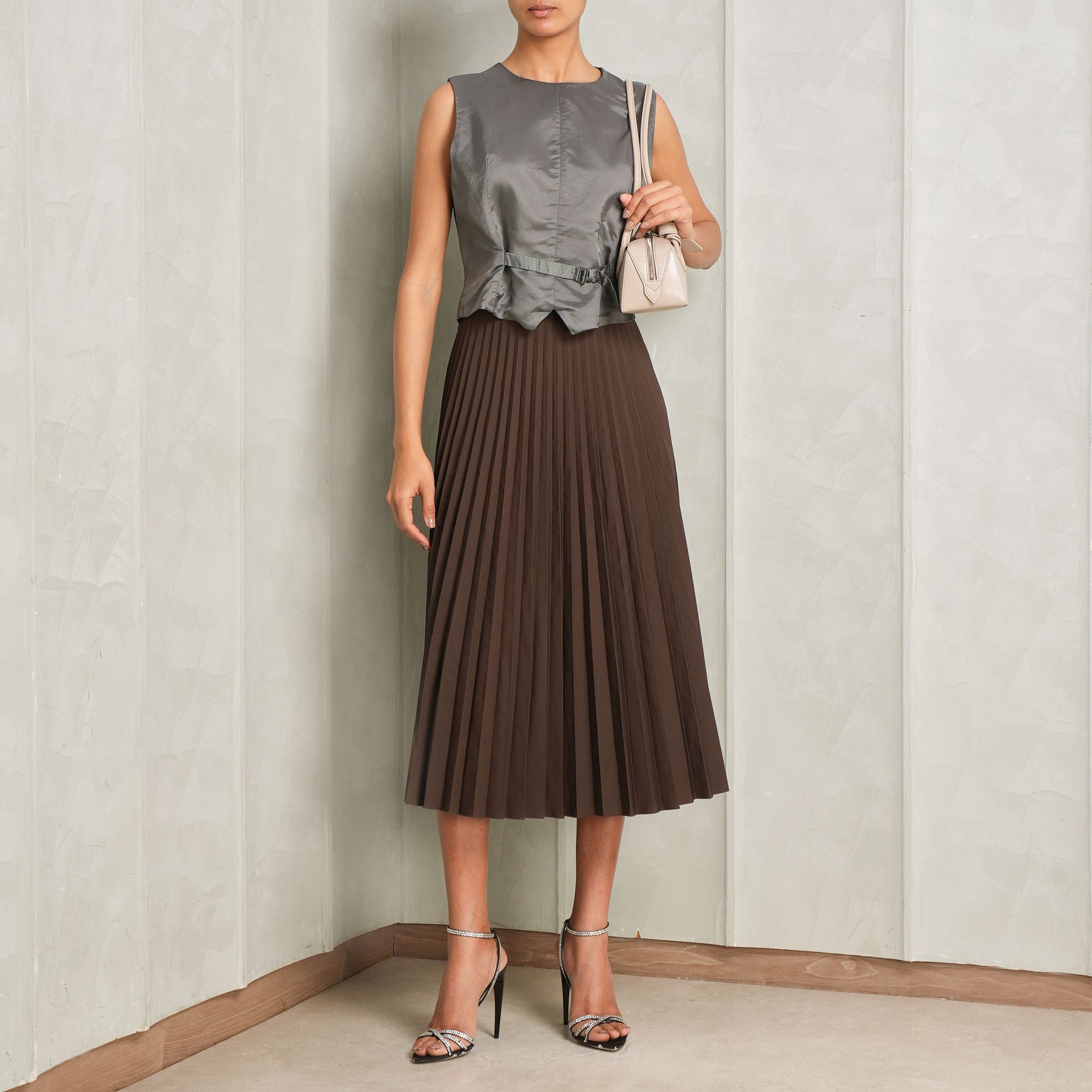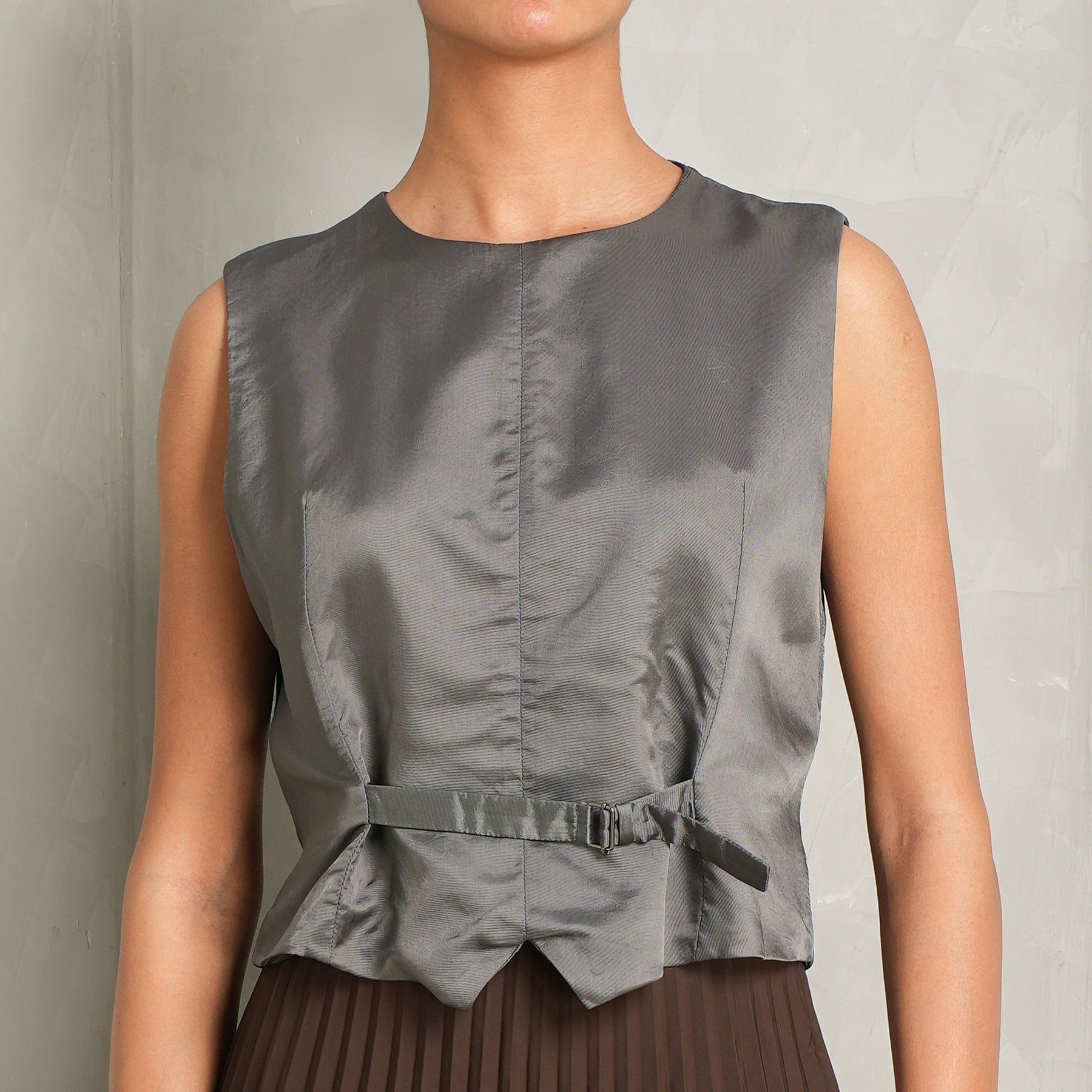 The Viscose Belt Detail Gilet from MM6 Maison Margiela is presented in grey and features a structured silhouette enhanced by a distinctive belt detail that defines the waist. The design balances tailoring with modern styling, offering a versatile layering piece that reflects the label’s experimental approach to contemporary fashion. Pair it with Pleated A-Line Midi Skirt.