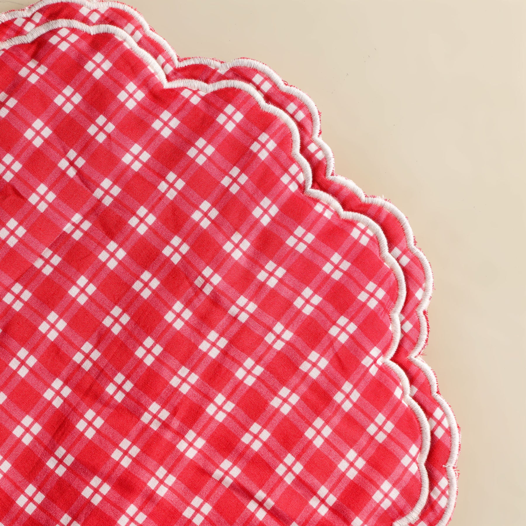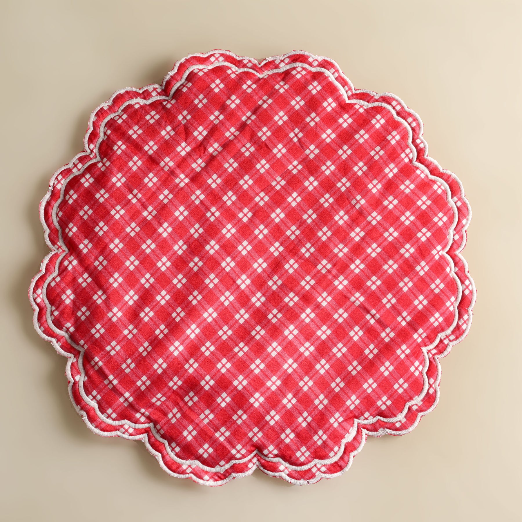 Patchou's Gingham Route Placemat is a journey in pattern and detail. It is crafted in printed silk and is framed with a scalloped embroidered trim in deep red. Its soft sheen and delicate edges bring a sense of quiet charm to the table, merging nostalgia with refinement.