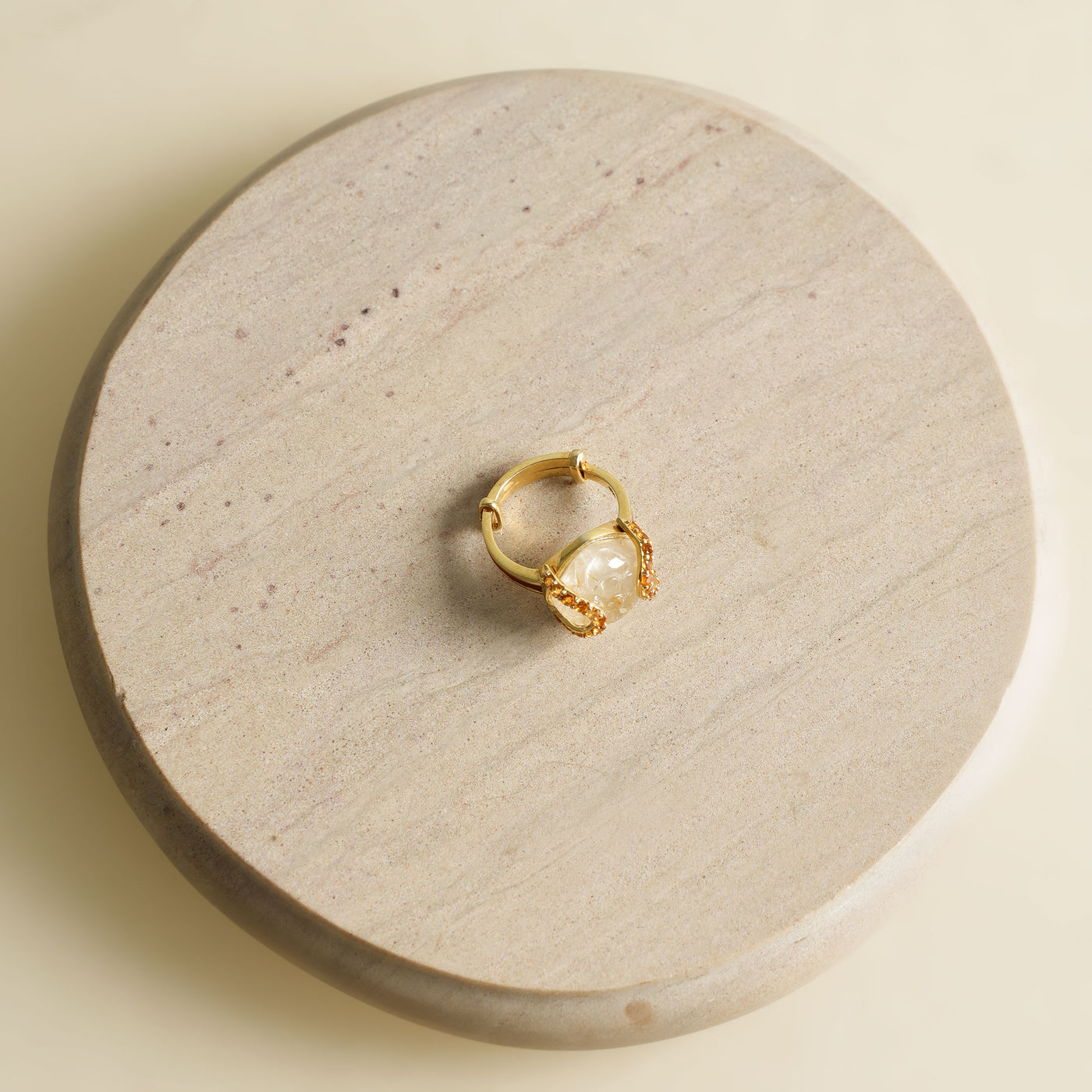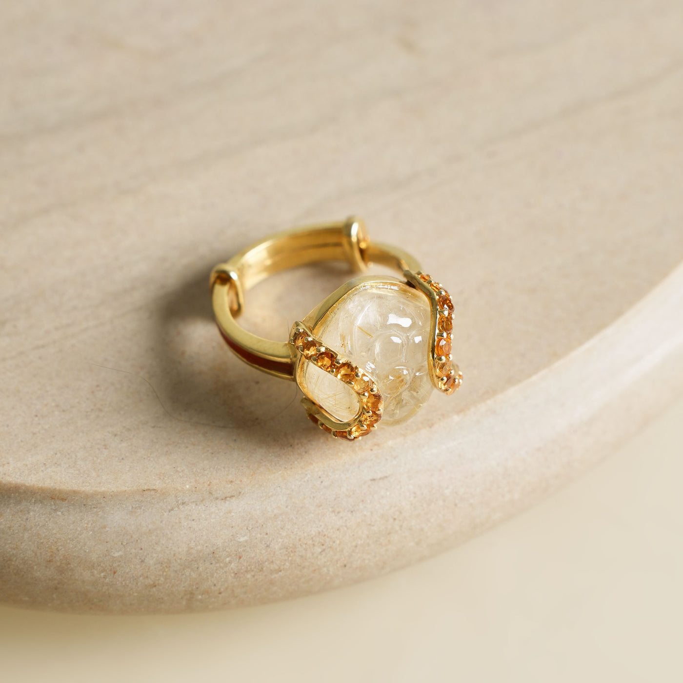 A reimagining of Akansha Sethi's most-loved designs - meet the Gold Aparna Ring. This ring features a captivating gold rutilated quartz, prized for the delicate golden strands suspended within its depths. Accented with a citrine detail and a vibrant cherry red enamel touch along the band, it is handcrafted in 18K gold vermeil - a timeless statement piece with a