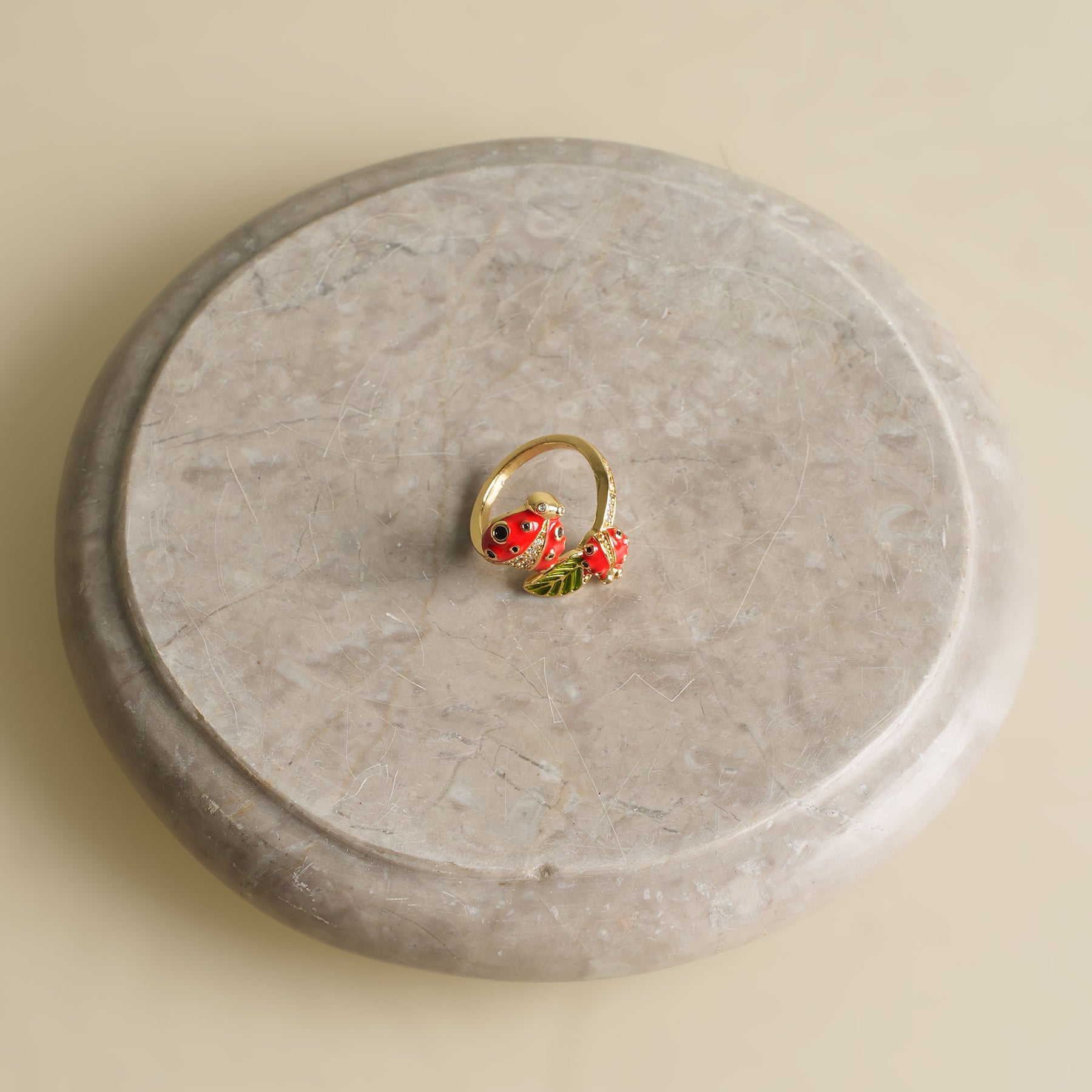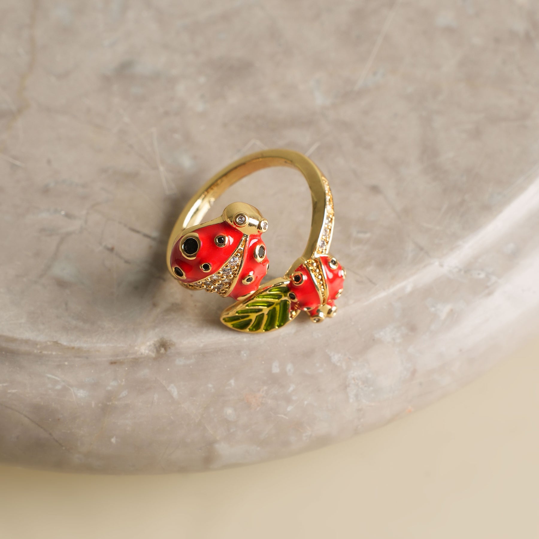 Named after the Egyptian goddess of love, beauty, music, and joy, the Hathor Ring from Aarelle is a radiant symbol of femininity and fortune. Crafted in brass with 18k gold plating, it features a ladybug motif adorned with CZ stones and rich red enamel details. A fusion of ease and whimsy, this statement ring celebrates the joy of adornment and the charm of good luck.