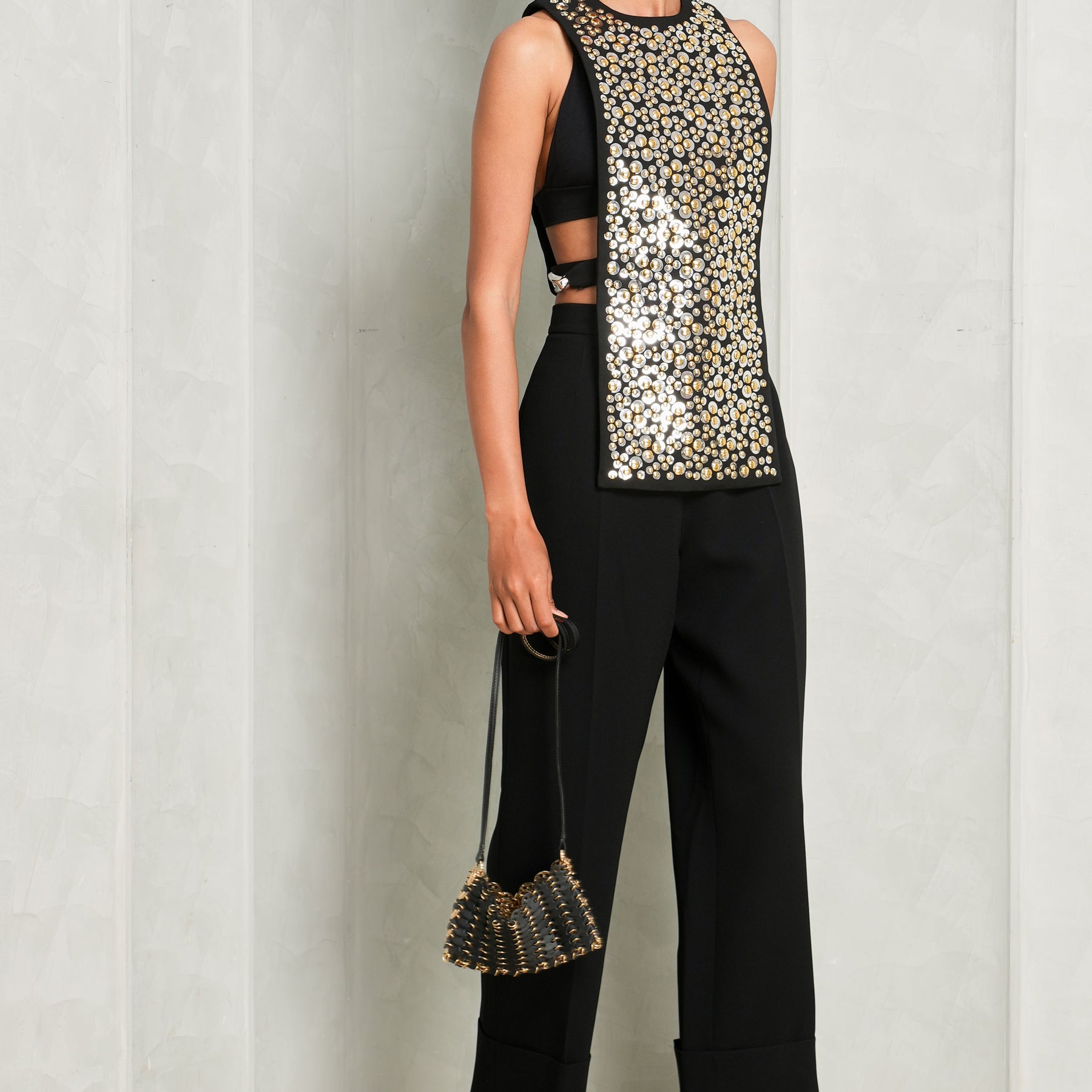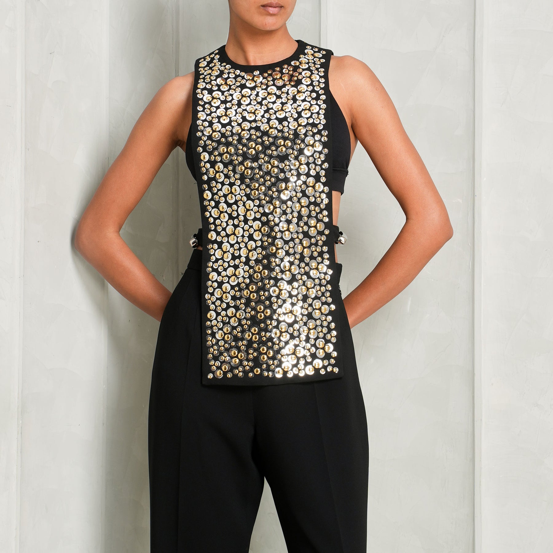 The Haut Tank Top from Rabanne is a modern take on a classic sleeveless silhouette, designed in black with a relaxed yet refined fit. The tank is elevated by a statement front panel that adds texture and visual contrast, while the clean neckline and streamlined cut keep it sharp and contemporary. Effortlessly versatile, it moves easily from day to evening without losing its edge. Style this with...
