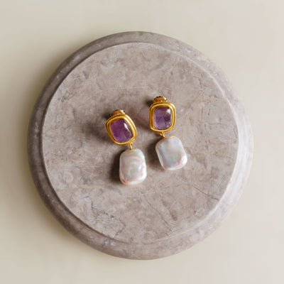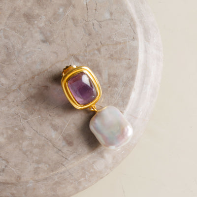 Poised, powerful, and softly radiant - the Hera Amethyst Earrings from Love Letter are crafted in 18kt gold-plated brass and feature a refined pairing of deep amethyst and luminous freshwater pearls. The purple tones are balanced by the soft glow of the pearls, creating a composition that feels both grounded and ethereal.