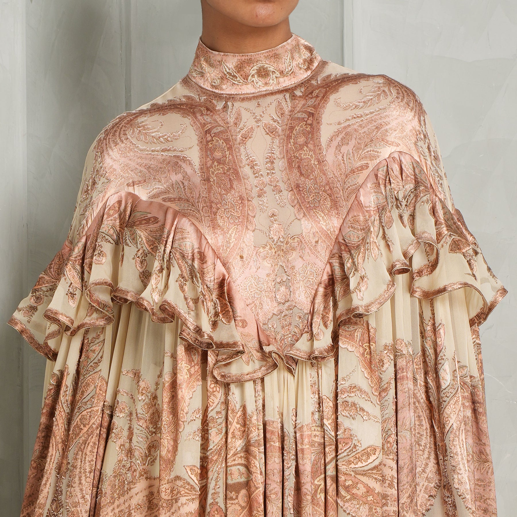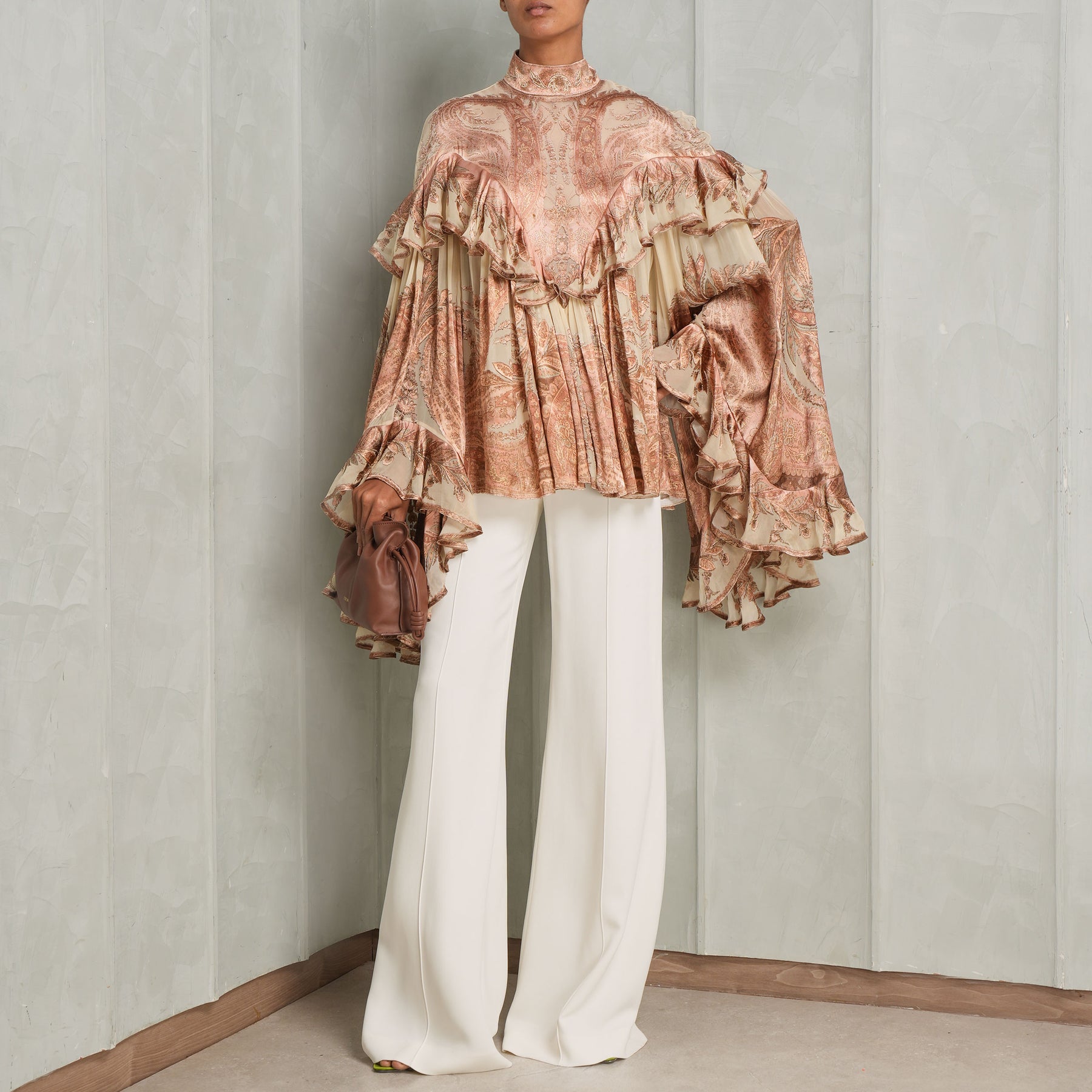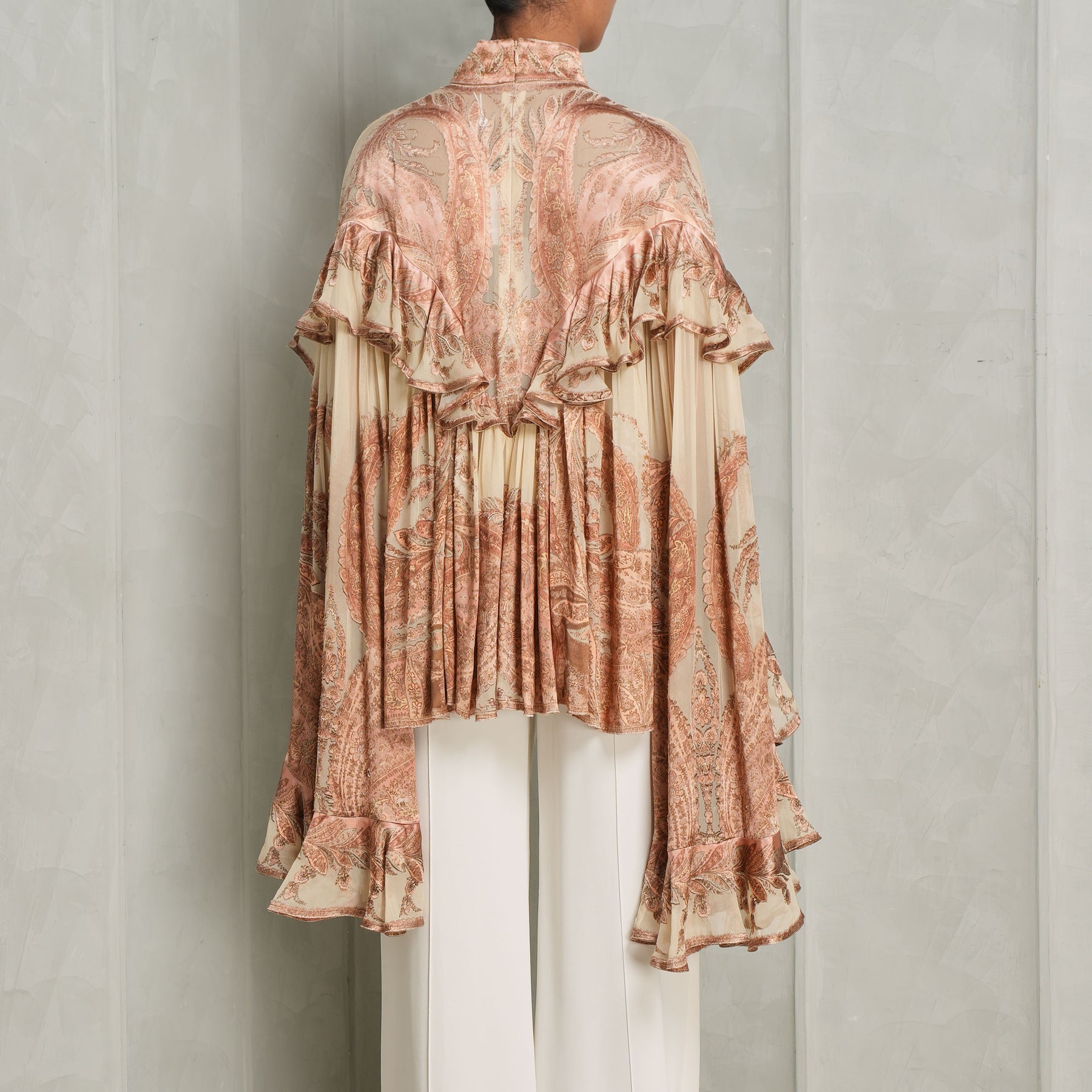 Ethereal and expressive, this Zimmermann Hypnotic Burnout Blouse features gathered frills tracing the chest and hem, adding soft dimension to its sheer texture. Designed with a high neckline and voluminous sleeves that extend into exaggerated cuffs, it fastens at the back with an invisible zip for a seamless finish. Pair this piece with...