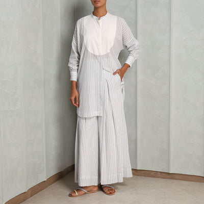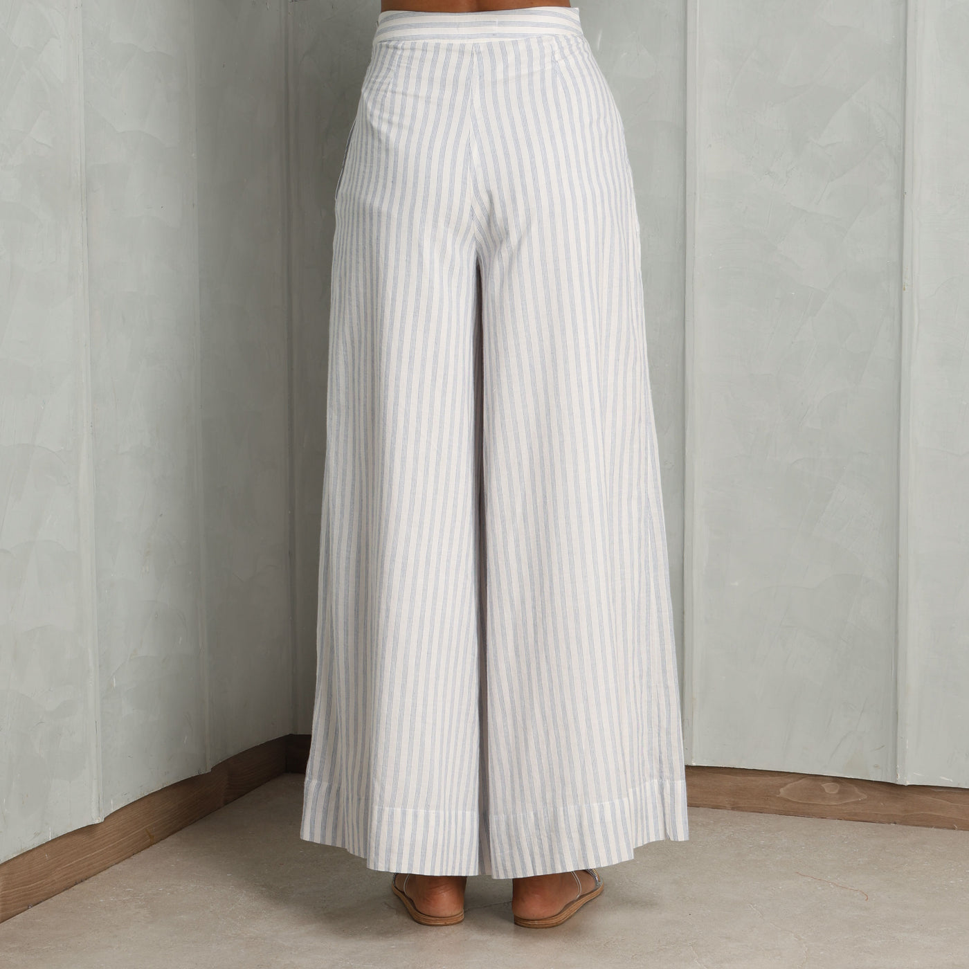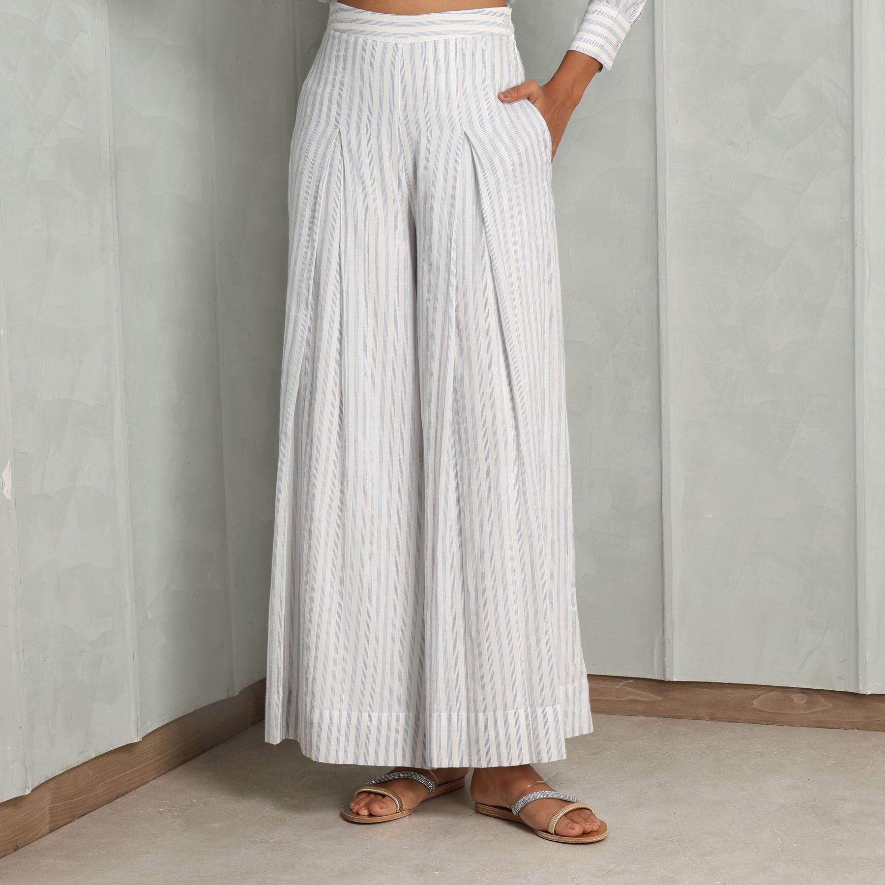 Tailored in handwoven cotton, the Inverted Box Pleat Bottoms from Three blend sharp lines with gentle volume. The white-blue stripes lend a breezy sensibility, while the inverted pleats and deep pockets keep them grounded in functionality. Pair it with the U-Yoke Shirt of the same print and fabric.