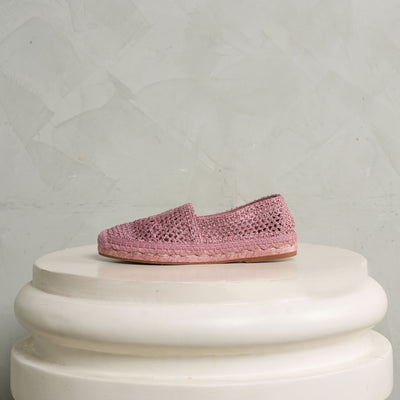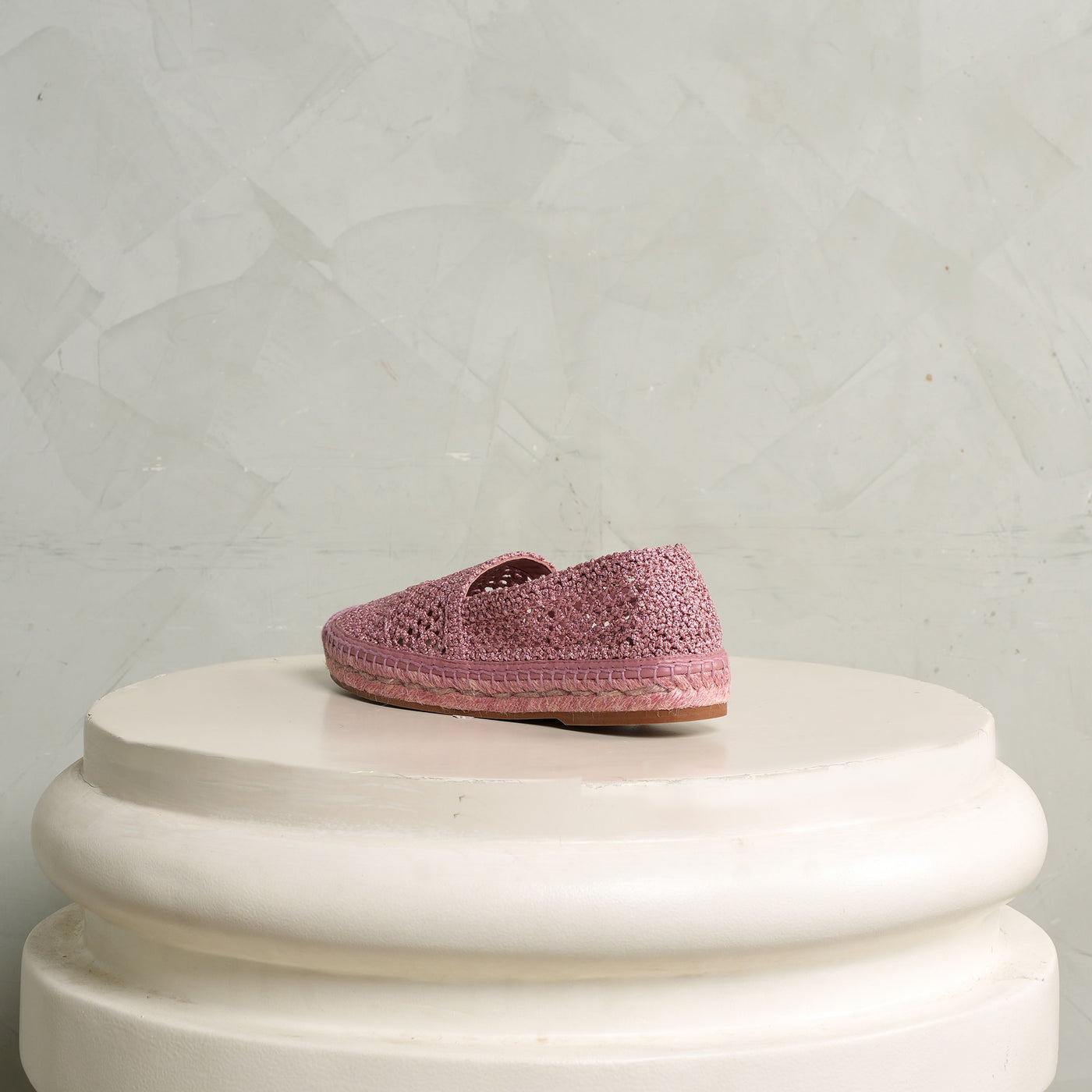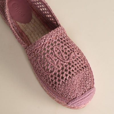 Chloé's Isla Logo Embroidered Crochet Espadrilles are crafted in crochet and rest on a natural cord sole. The front showcases an embroidered handwritten signature, inspired by a classic vintage Chloé belt, in a soft pink hue. Whether day or night, this pair is ideal for casual and elevated affairs alike.