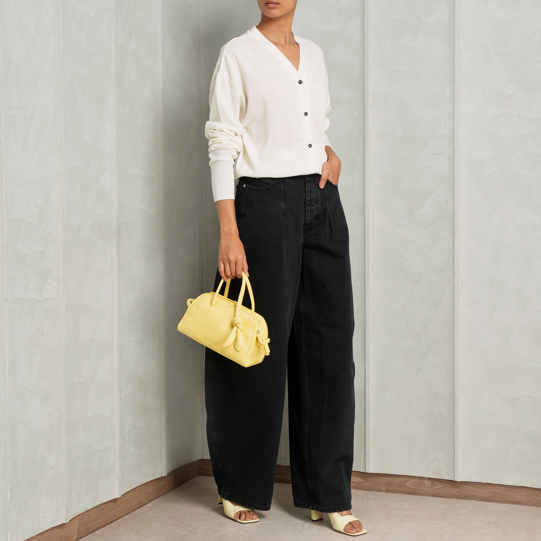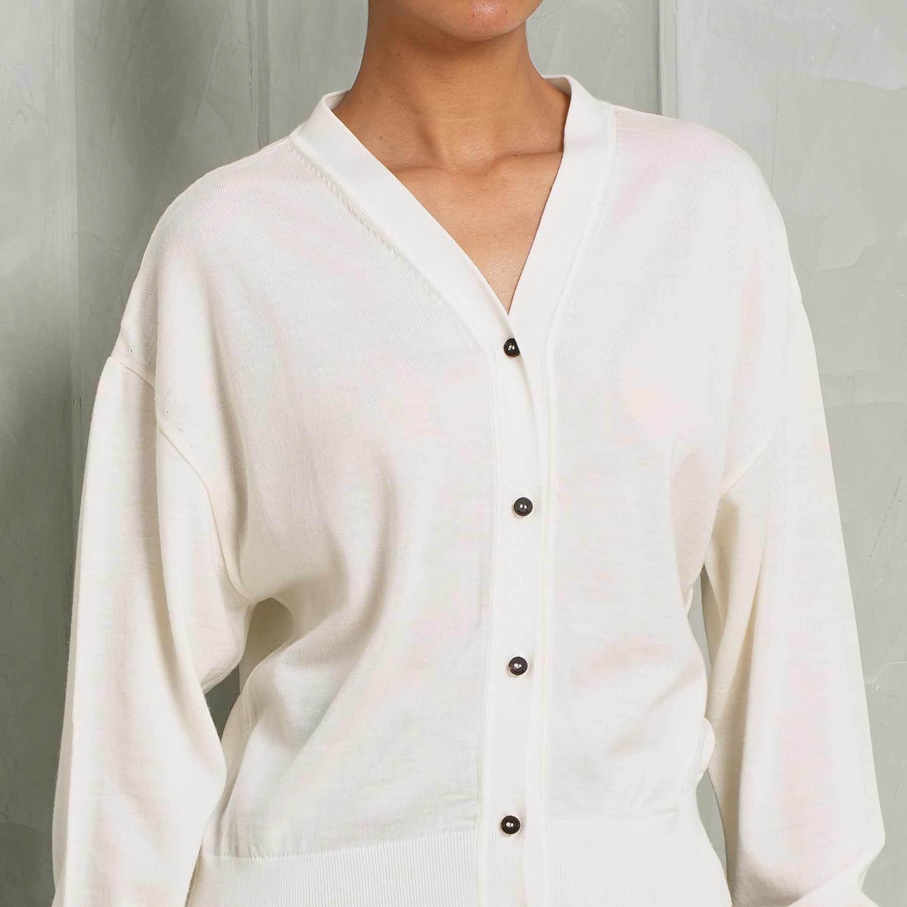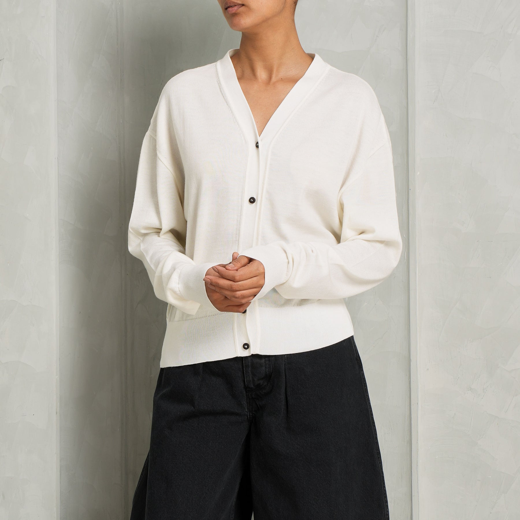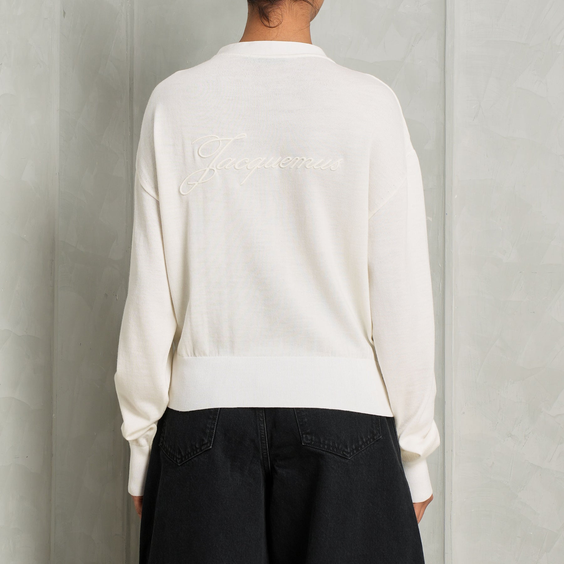 Introducing the Logo Embroidered Wool Cardigan from Jacquemus - a fine knit wool-blend cardigan with a relaxed V-neck silhouette and softly dropped shoulders. Designed with ribbed trims for structure and finished with subtle logo embroidery at the back, this piece is an elevated essential with effortless Jacquemus ease. Style it with Curved-Leg Jeans and Small Turismo Bag from Jacquemus.