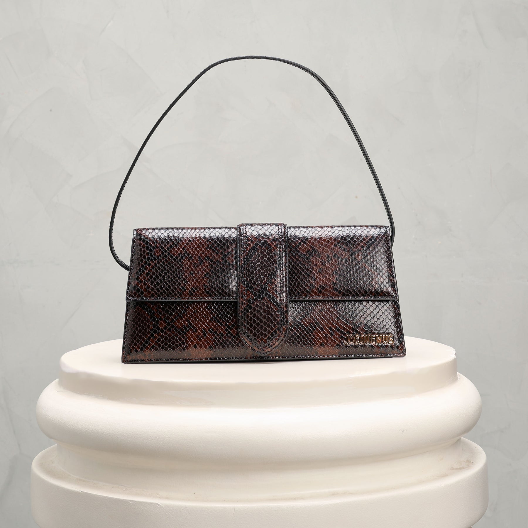 Jacquemus reimagines its signature top-handle silhouette in a sleek elongated profile with the Long Bambino Bag. Crafted in smooth Brown leather, the structured form is softened by a curved crossbody strap and tonal stitching. The magnetic flap closure conceals a cotton-lined interior sized for essentials, while the gold logo detail adds a subtle glint. Its a minimalist statement and is a versatile styling piece.