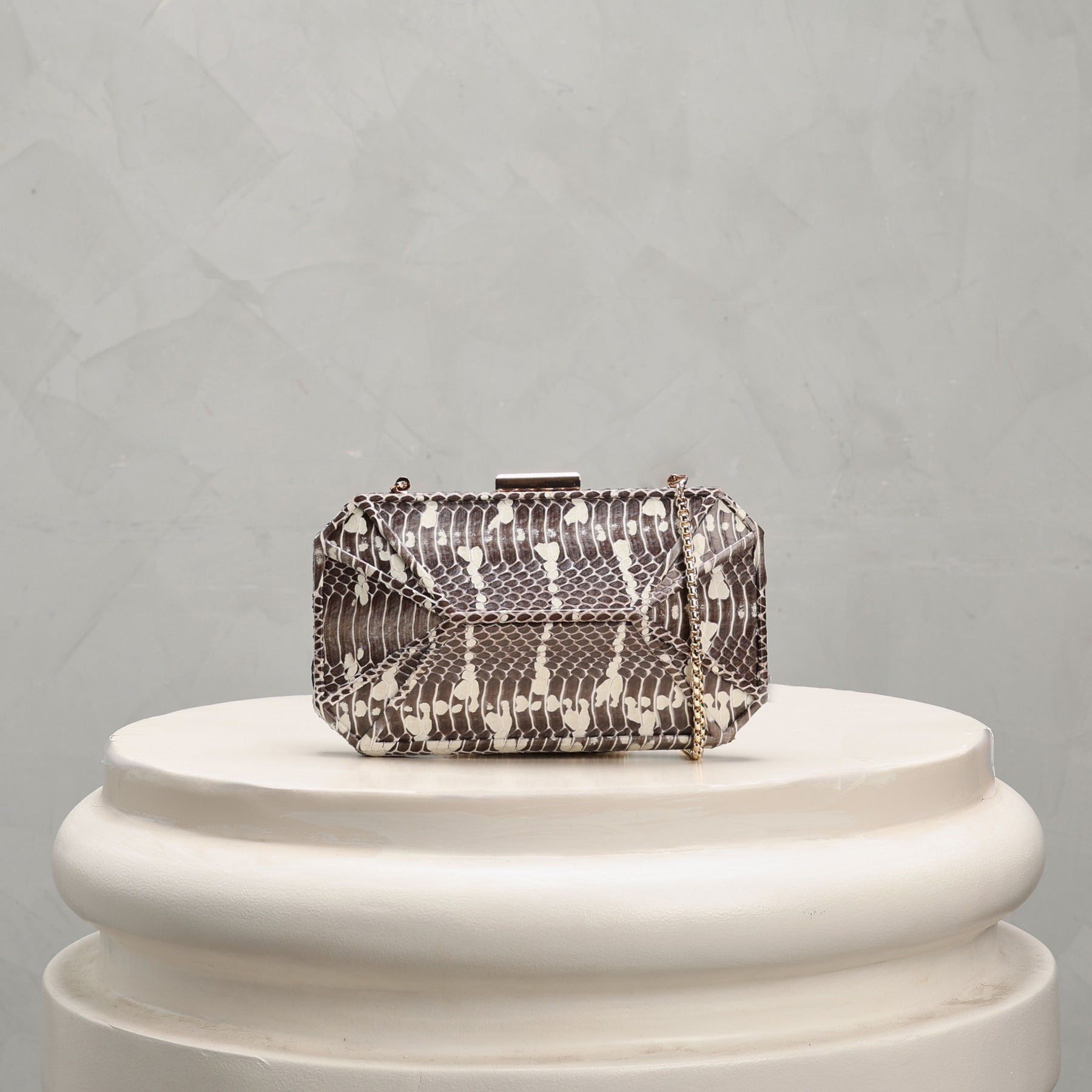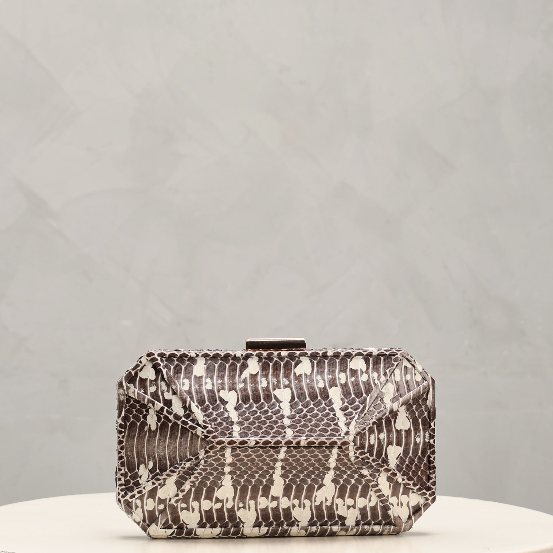 The Madison Minaudière is Ahikoza's signature clutch. Geometric hinge details perfectly reflect Ahikoza's main inspiration for geometry and balance. It is intricately handcrafted to bring symmetric art to life. Wear it over your shoulder or tuck the chain strap inside to style it as an evening clutch. A red carpet favorite, the Madison Minaudière remains Ahikoza's most coveted bag.