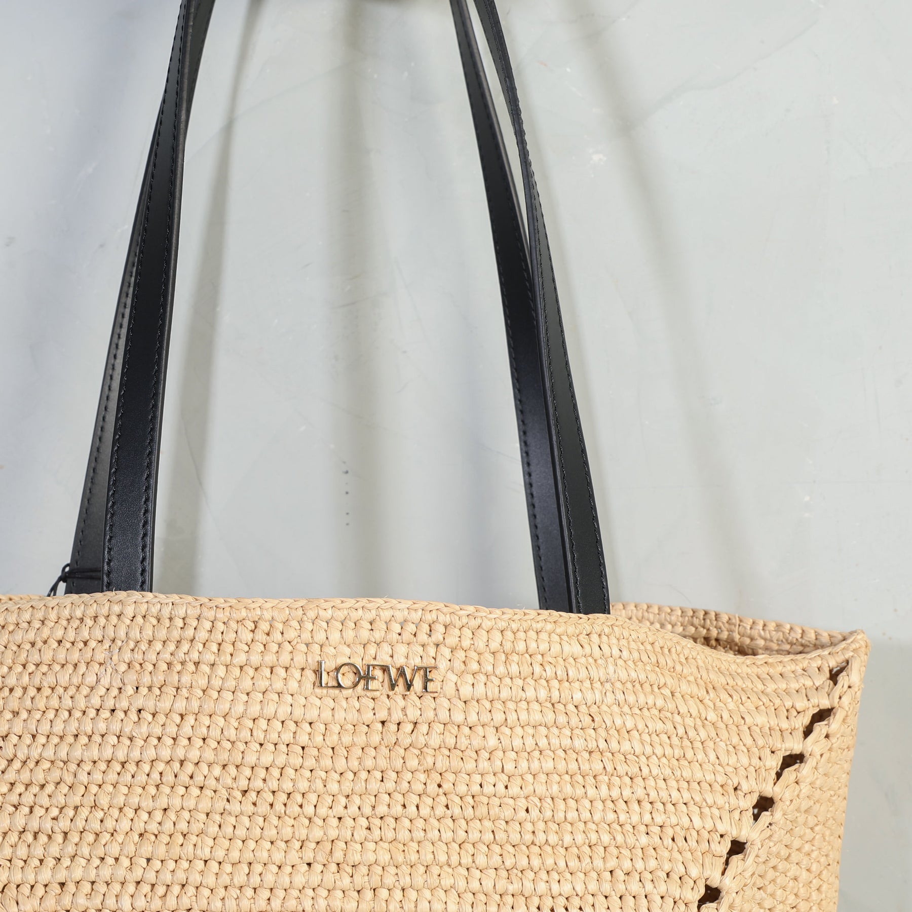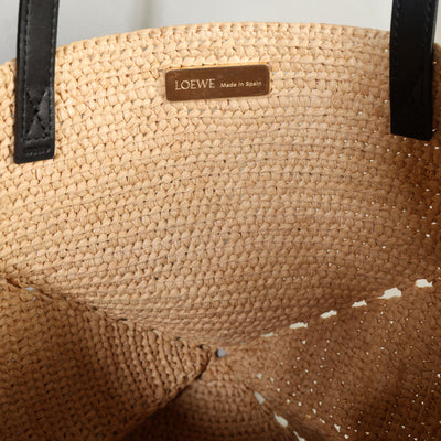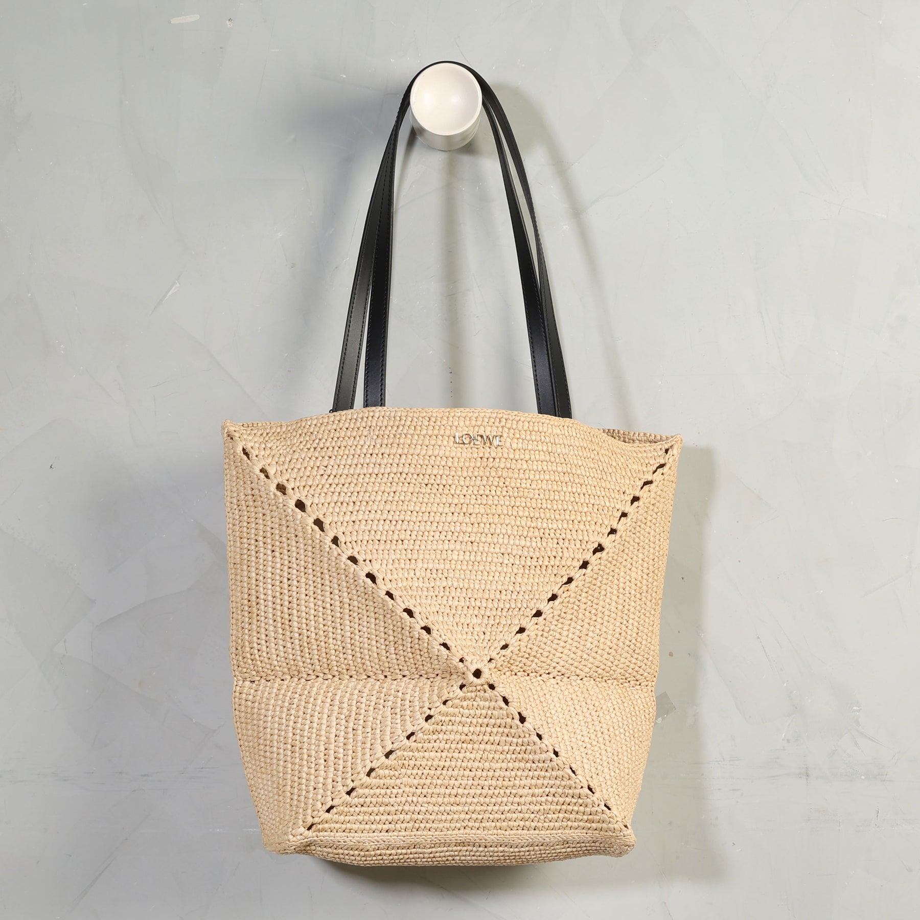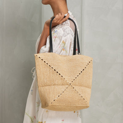 The Medium Puzzle Fold Tote from Loewe reimagines practicality with elevation. Its geometric silhouette is engineered to fold completely flat, making it the ultimate travel companion. This medium edition is crafted from raffia, sustainably cultivated in Madagascar and intricately handwoven by local artisans before being finished in Spain. The striking mix of stripes lends a modern graphic rhythm, while the lightweight structure ensures ease without compromise on refinement.