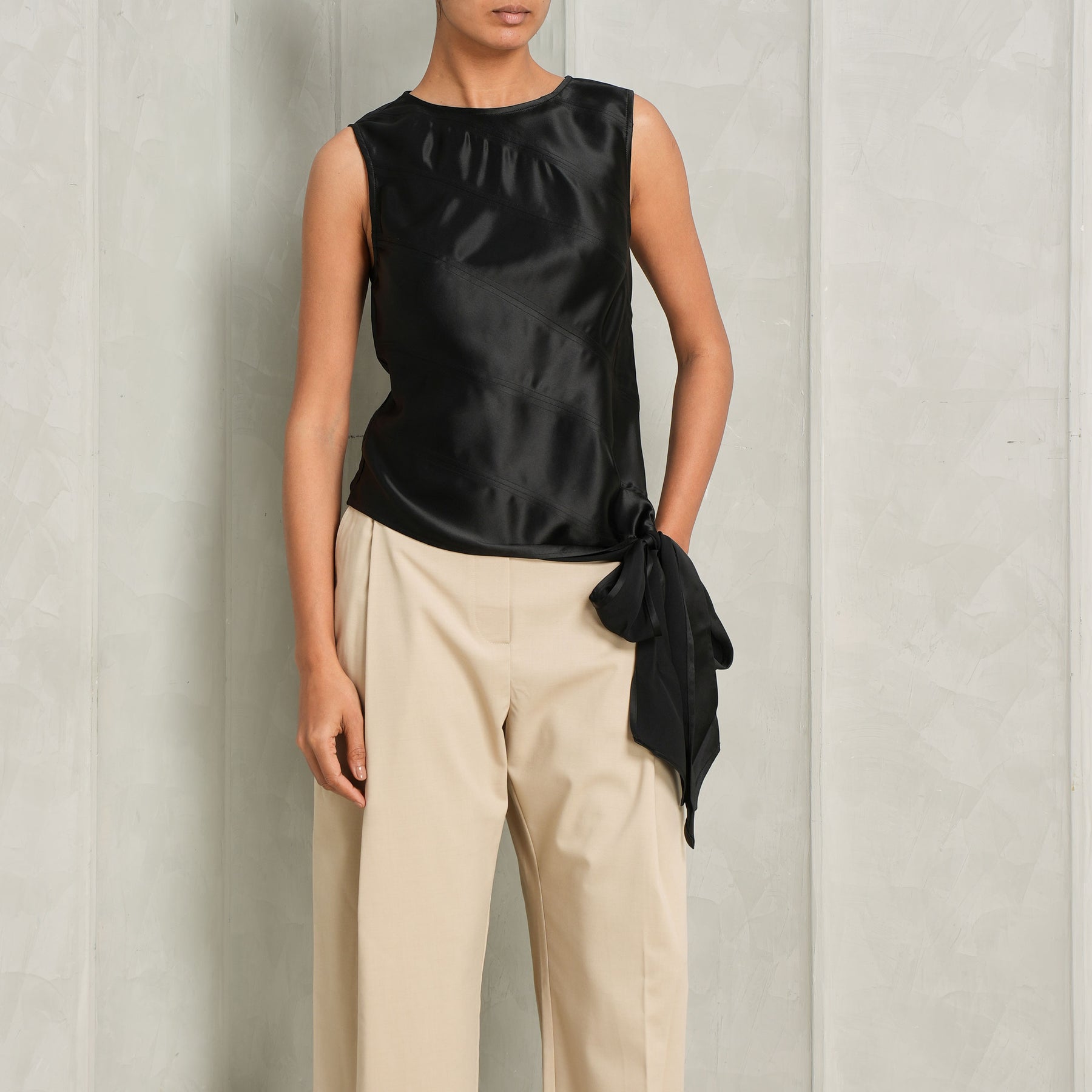 The Midton Top from Acler is a contemporary staple with a sculptural sensibility, crafted in lustrous woven satin that enhances its refined structure. This sleeveless silhouette features asymmetric panel detailing through the bodice and an elongated hem tie that adds movement and dimension. Finished with an invisible back zip for a clean, uninterrupted line, it brings modern polish to any wardrobe. Complete your look with Long Chiquito with buckle bag from Jacquemus and Franly Pant by Acler.