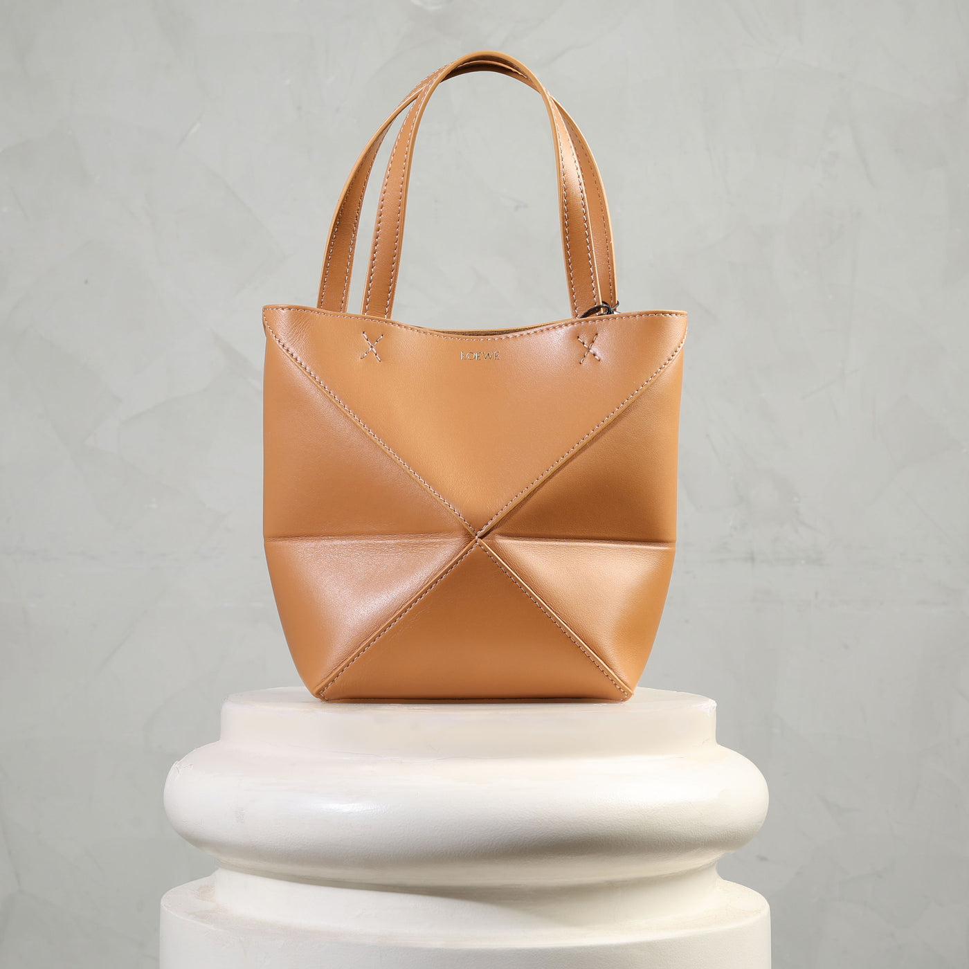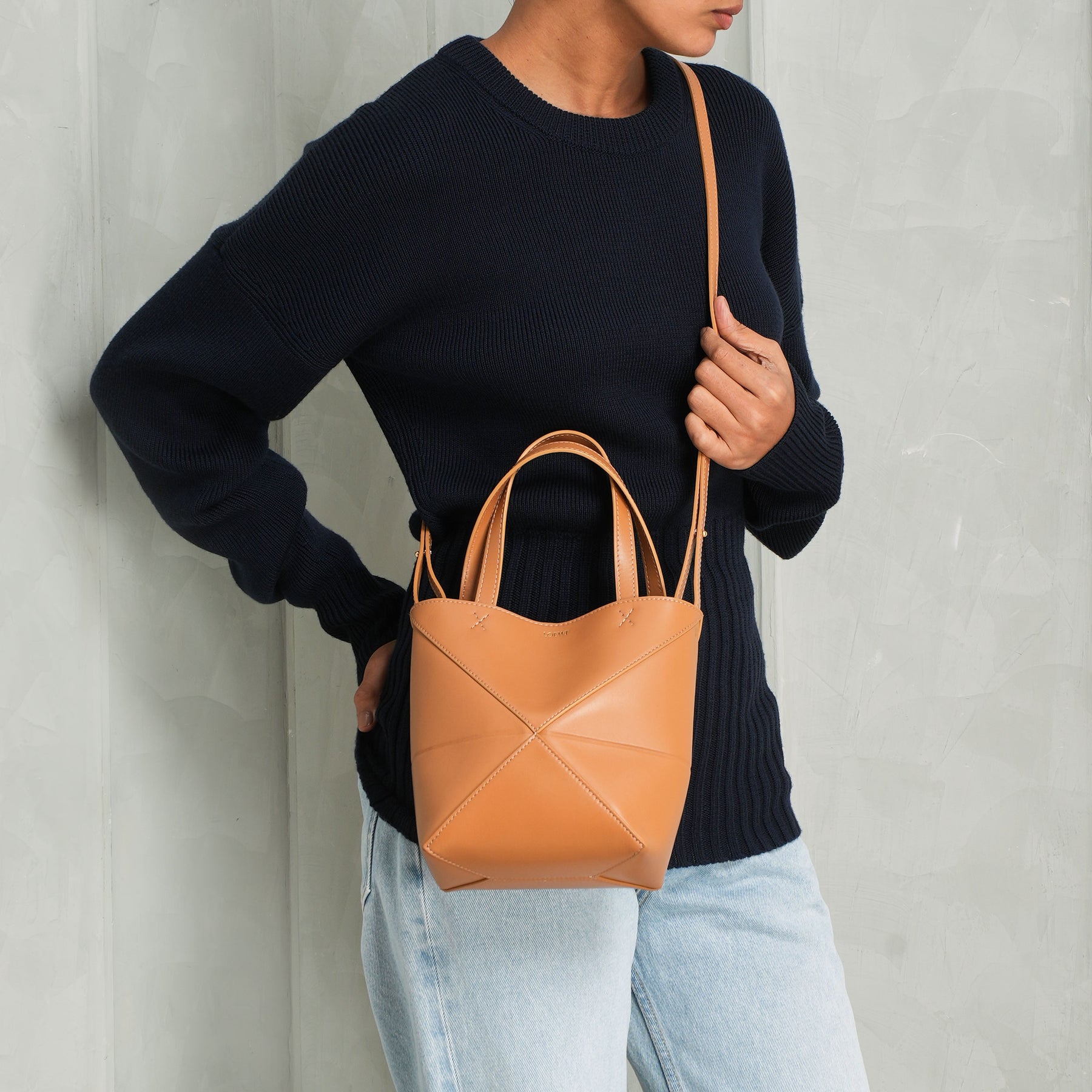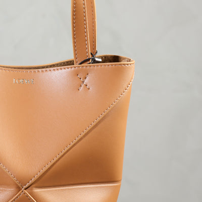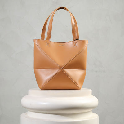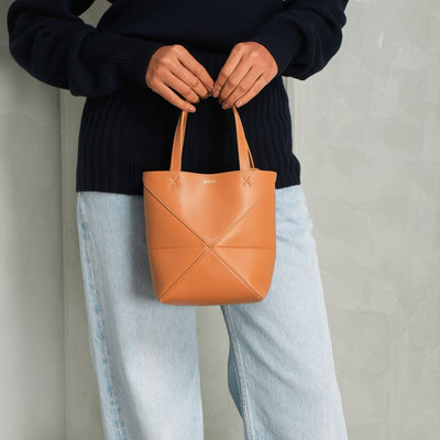Loewe's Mini Puzzle Fold Tote reinterprets signature geometric lines in a lightweight structure designed to fold completely flat, making it an ideal travel companion. This mini version, crafted in lustrous calfskin, carries the same architectural precision in a more compact silhouette. Versatile in function, it can be worn on the shoulder, across the body, or carried by hand with its detachable strap. The interior is finished with suede, while the Loewe signature is discreetly embossed.
