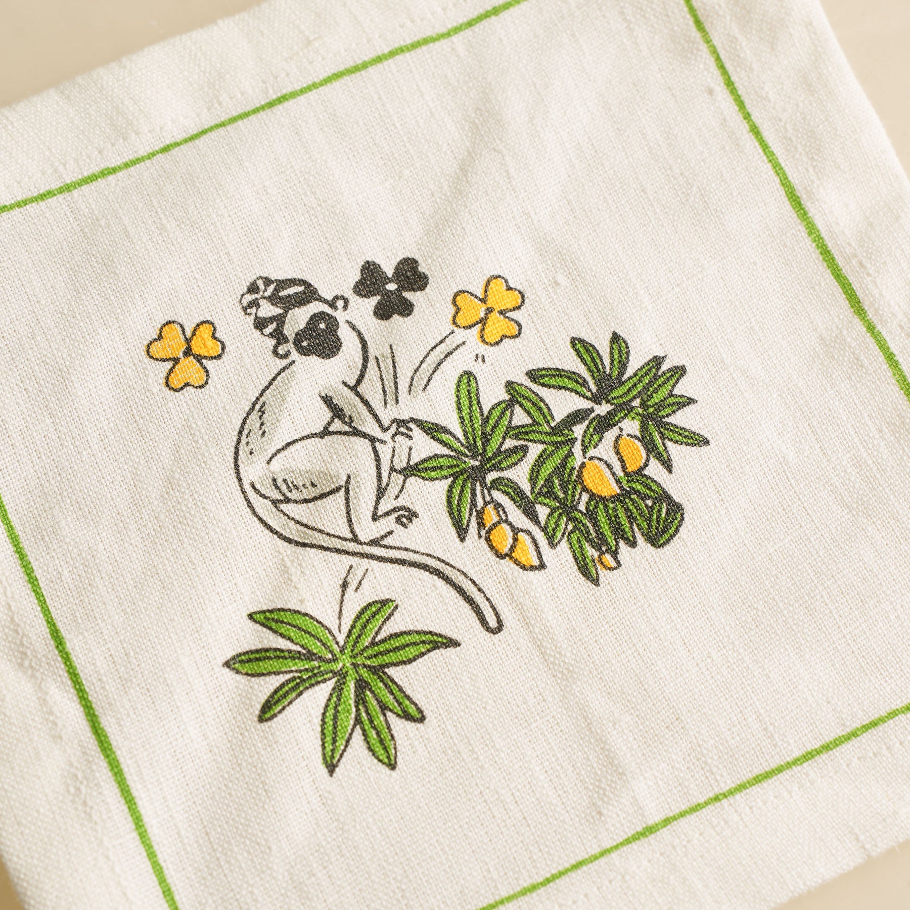 The Monkey on a Mango Tree Napkin set by Art-chives India is the Wild Indian Garden coming alive. Crafted from a pristine ivory-hued pure Irish Linen, this table linen set comprises 4 napkins, perfect to bring alive your tablescape. A line appears whimsically whispering, 'I...