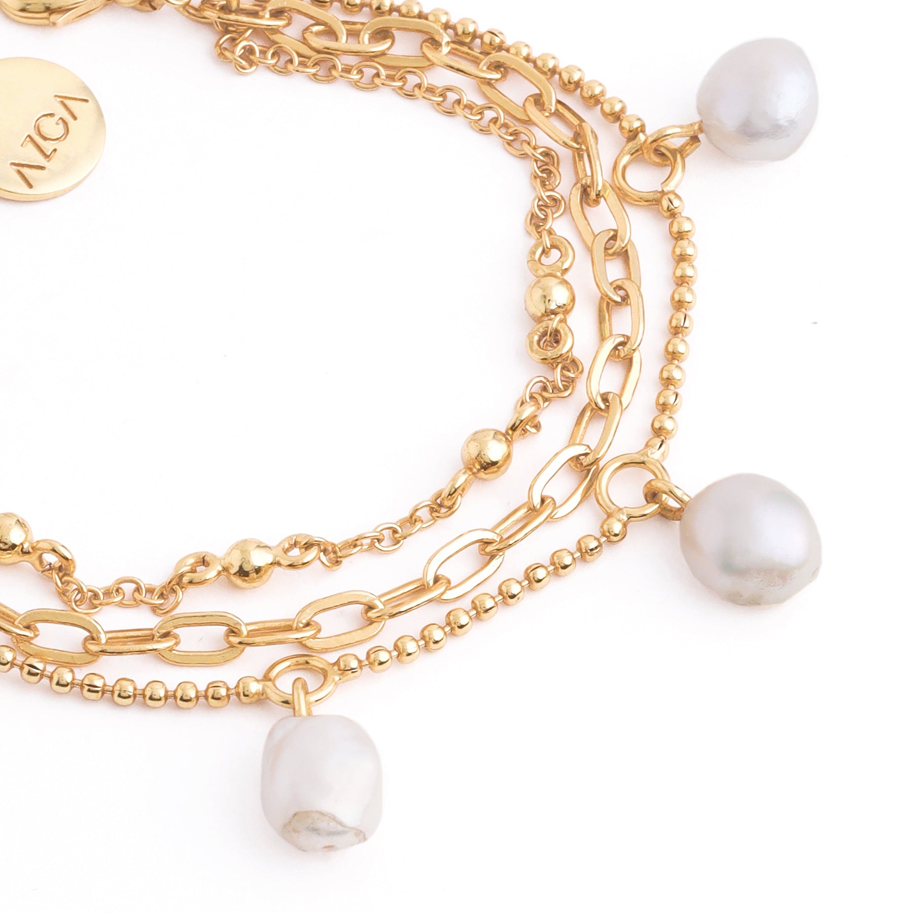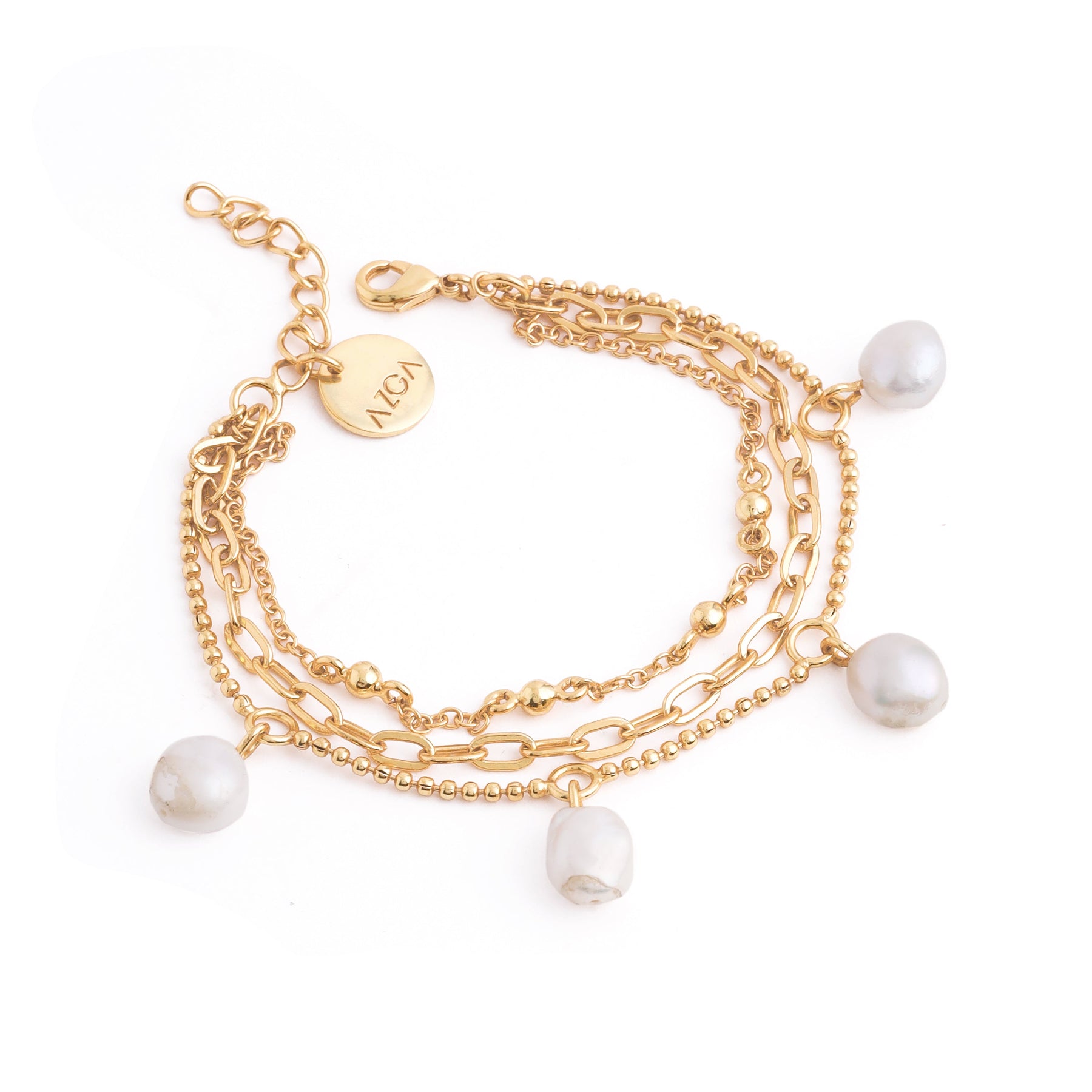 The Multi Layer Pearl Bracelet is a refined expression of handcrafted design, created in high-finish brass and plated with luminous gold. Delicately made by in-house artisans at AZGA, each piece is shaped and finished with thoughtful attention to detail, celebrating craftsmanship in its most elegant form.