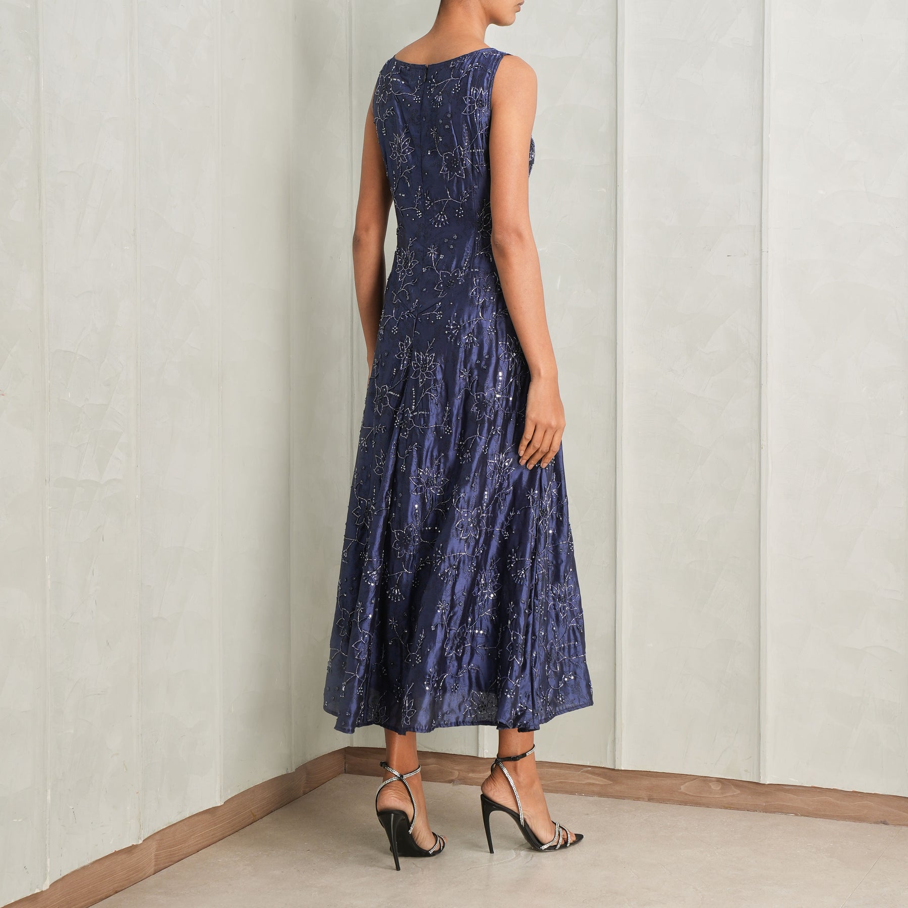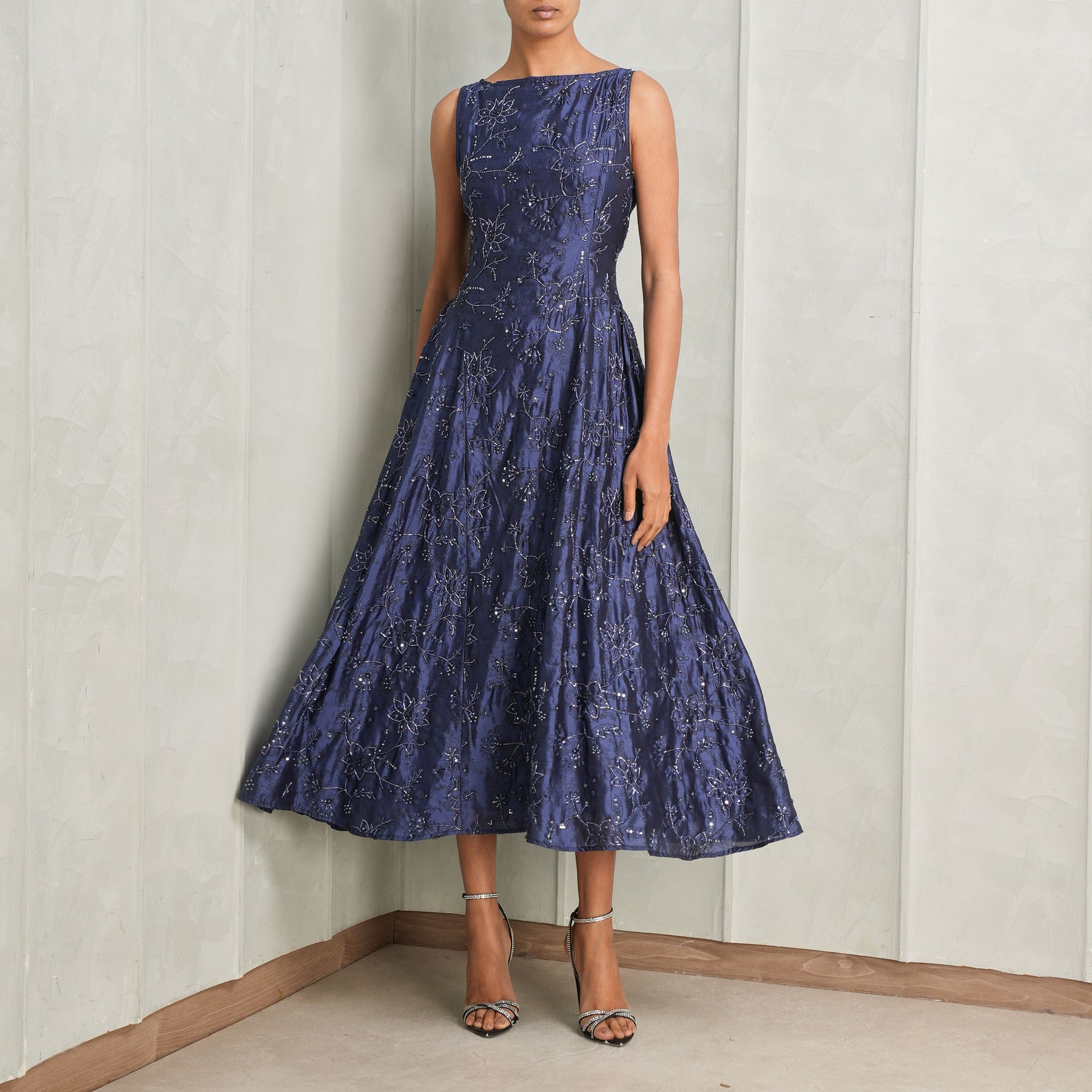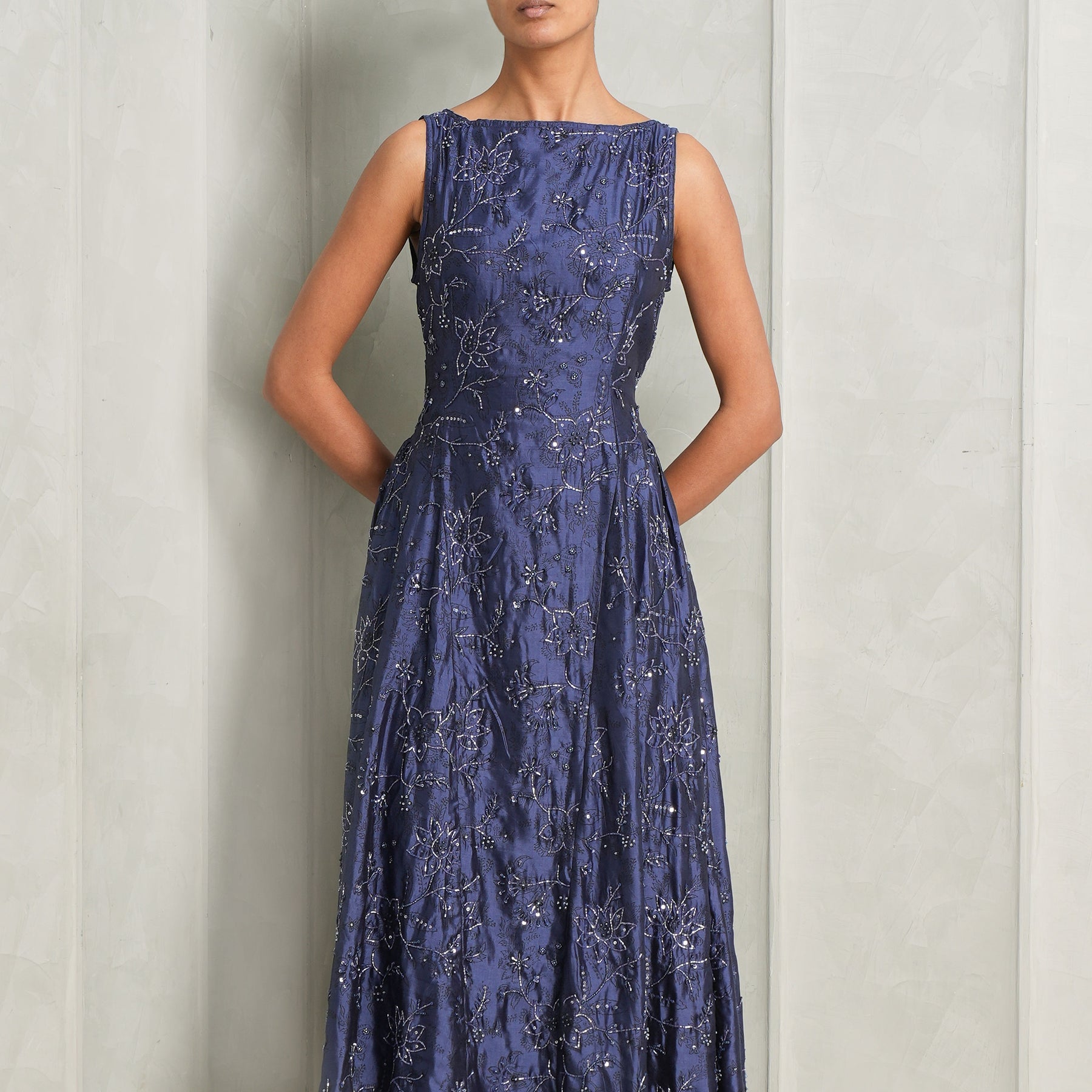 Crafted in hand block printed silk, the Naveli Dress from The PDKF Store celebrates quiet craftsmanship and considered detail. Delicate surface embellishments add a subtle glow, catching light without overpowering the silhouette. Designed with a clean boat neckline and a concealed back zip, it falls effortlessly on the body. Finished with a breathable muslin lining, the Naveli offers ease, comfort, and understated movement - made for moments that linger. Style this with...