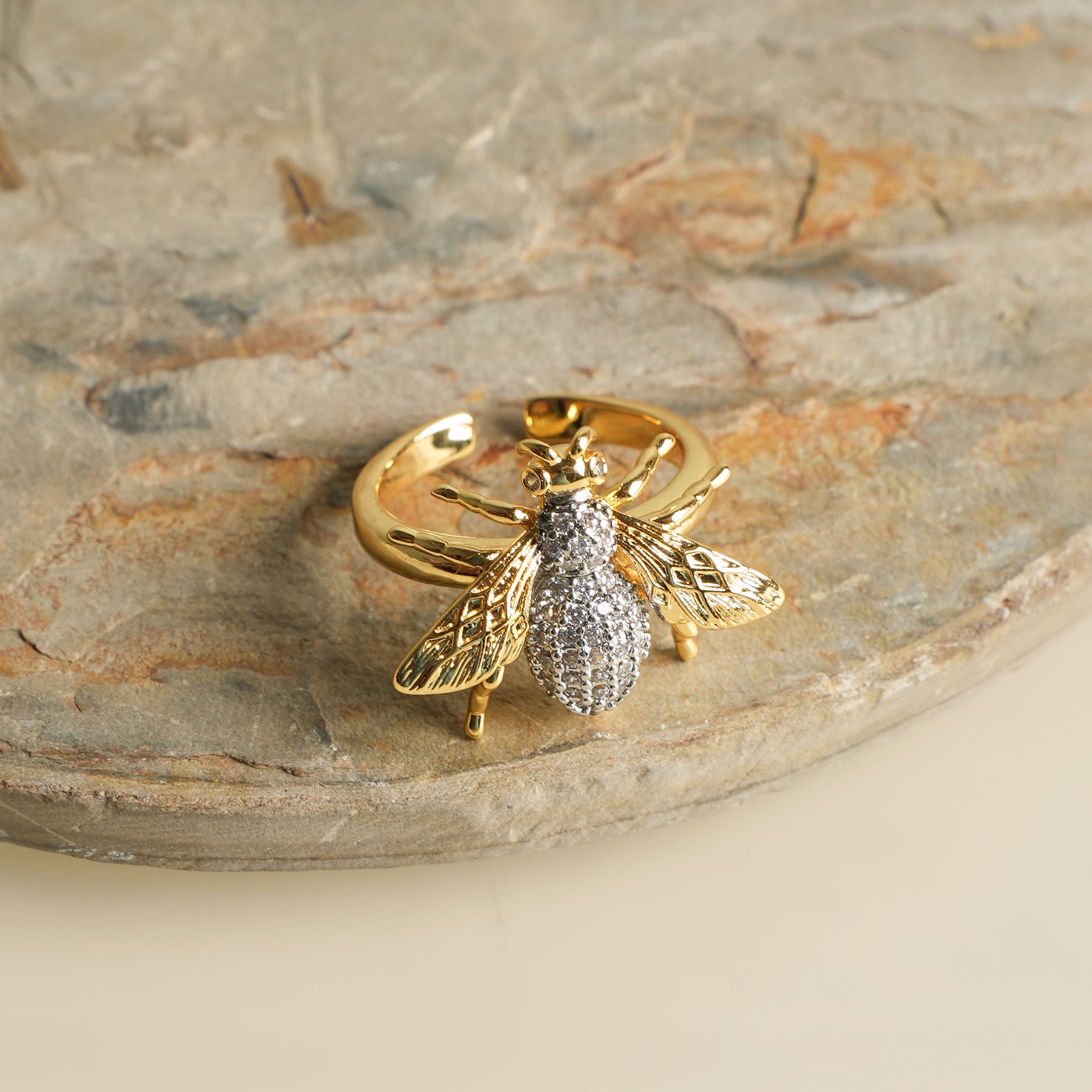 Embodying the industrious spirit of the bee, the Aarelle Nefertiti Bee Ring is a tribute to strength, grace, and perseverance. Crafted in brass with 18k gold and silver tones, it features an intricately detailed bee motif accented with a dazzling crystal at its center. A statement of quiet power and timeless beauty, refined yet full of purpose.