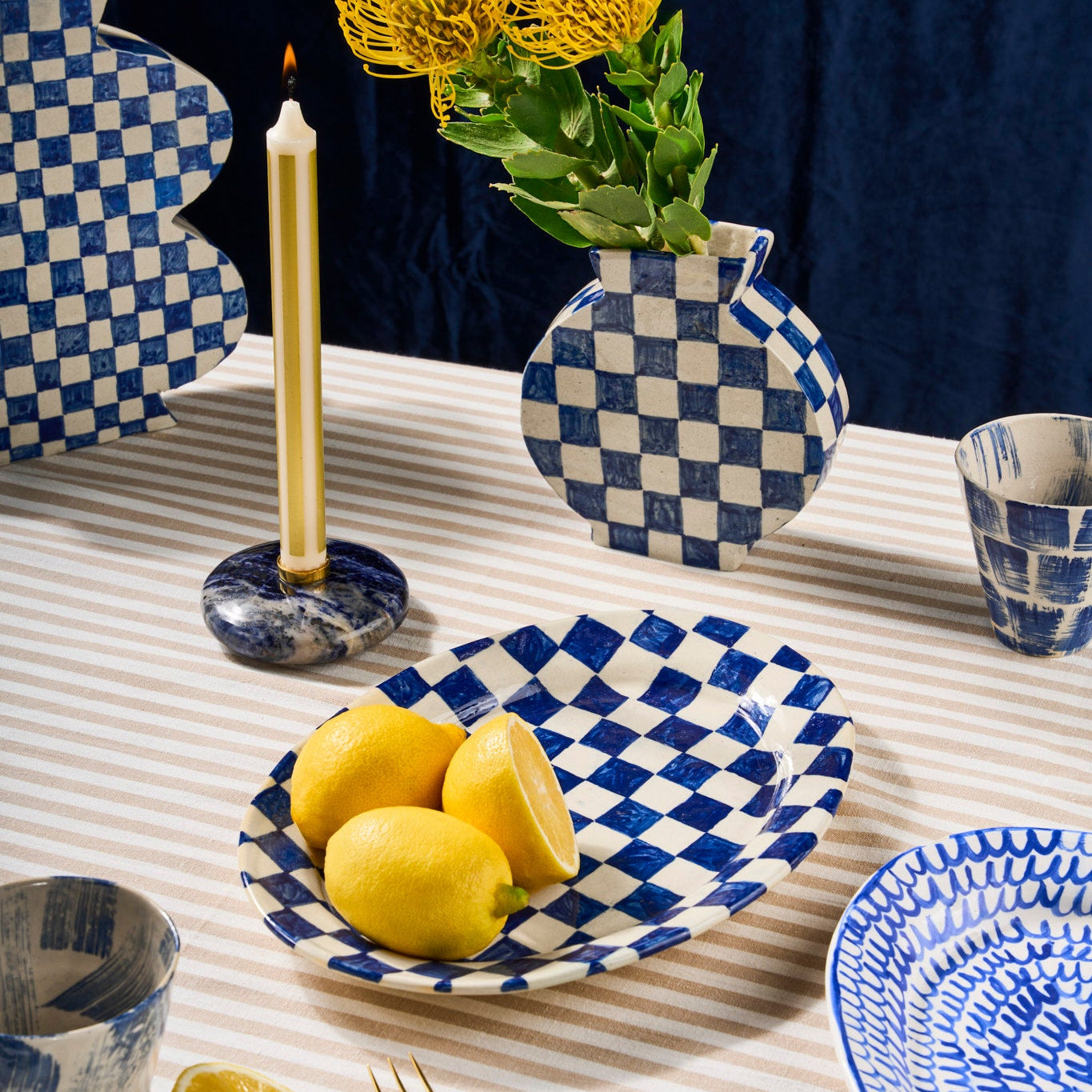 The Eeshaan Oval Check Party Platter is fresh, playful, and effortless. This hand-painted platter showcases blue check detailing, giving it a contemporary yet approachable feel. Ideal for gatherings, brunches, or intimate dinners, it adds personality to the table while remaining timeless in form and function.