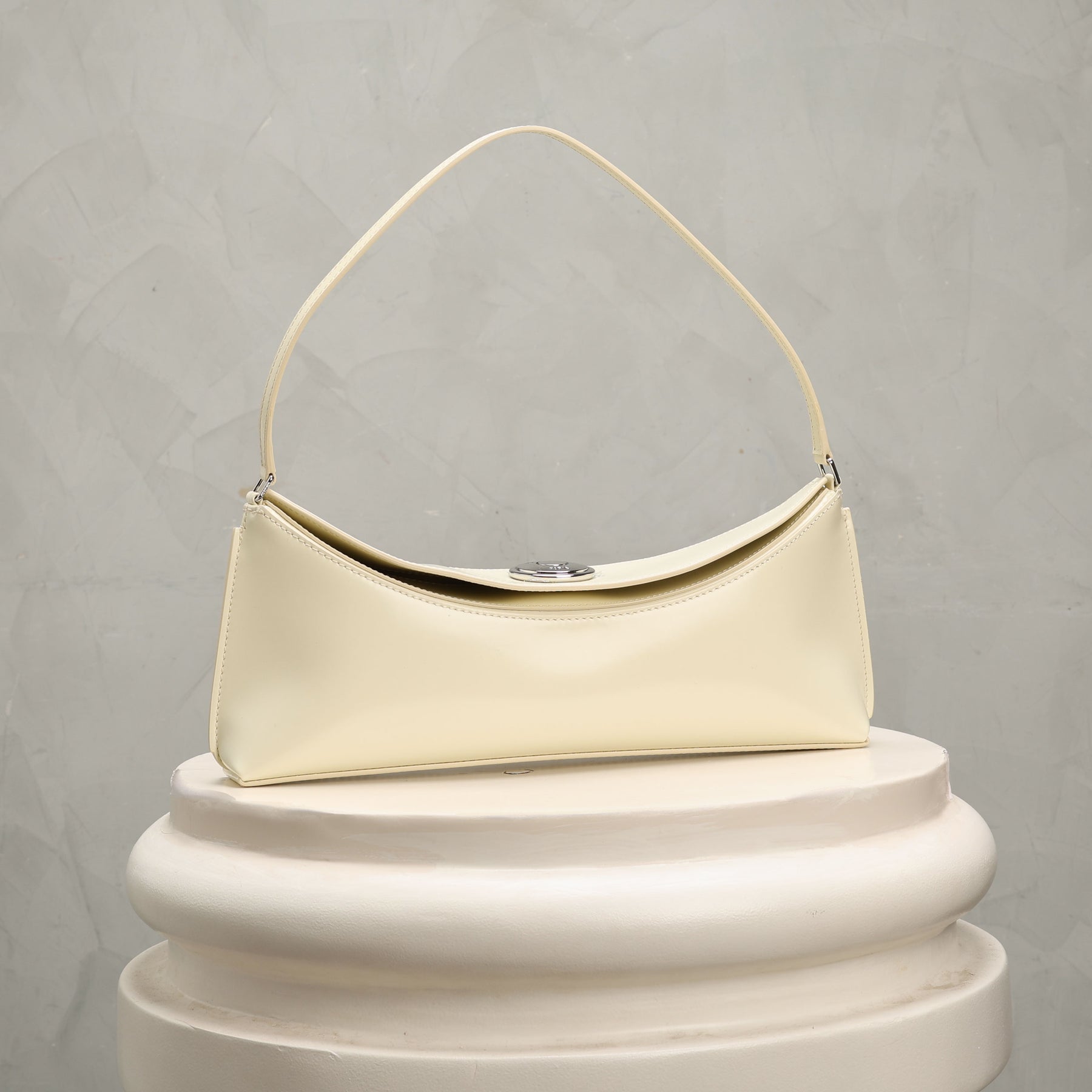 The Ovalo Clutch Shoulder Bag from Jacquemus is sleek and sculptural. This folded shoulder bag is crafted in glazed leather with a subtle sheen, and features a slim shoulder strap and a clean, folded silhouette that sits effortlessly under the arm. The magnetic flap is secured with a bold engraved snap fastener - a polished accent against the bag’s minimalist form. Inside, a fully lined cotton-yellow interior adds a quiet hint of warmth, balancing refinement with a touch of unexpected charm.