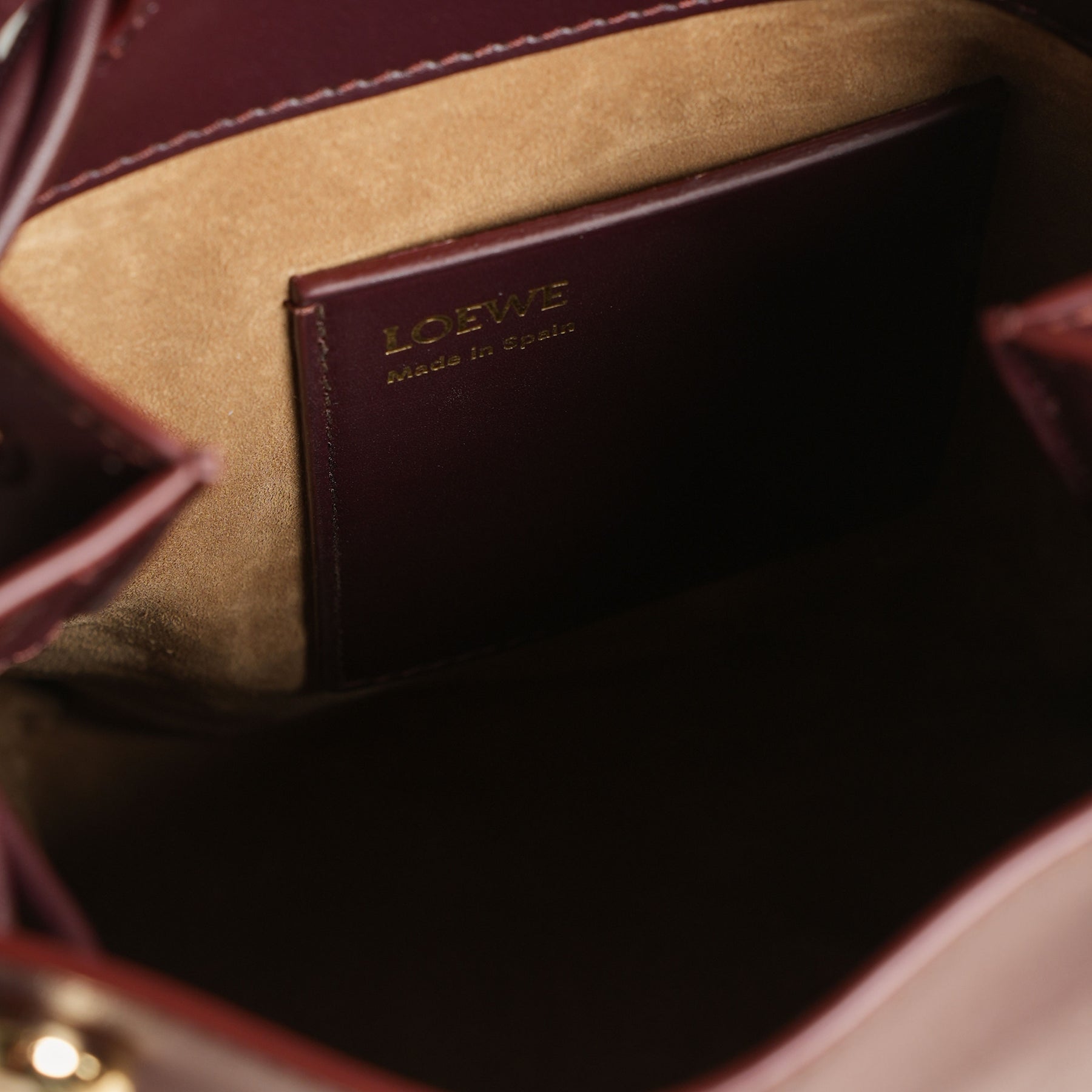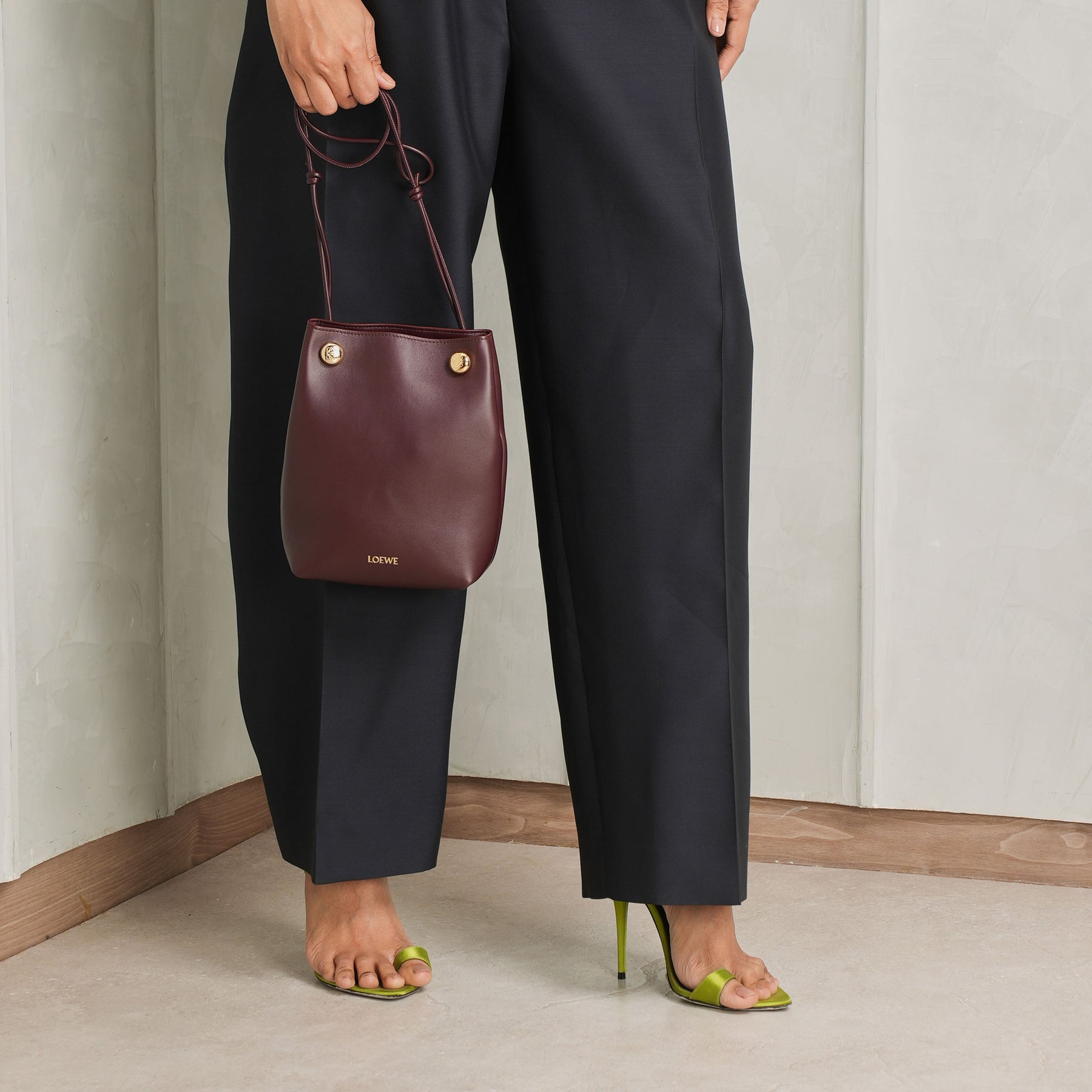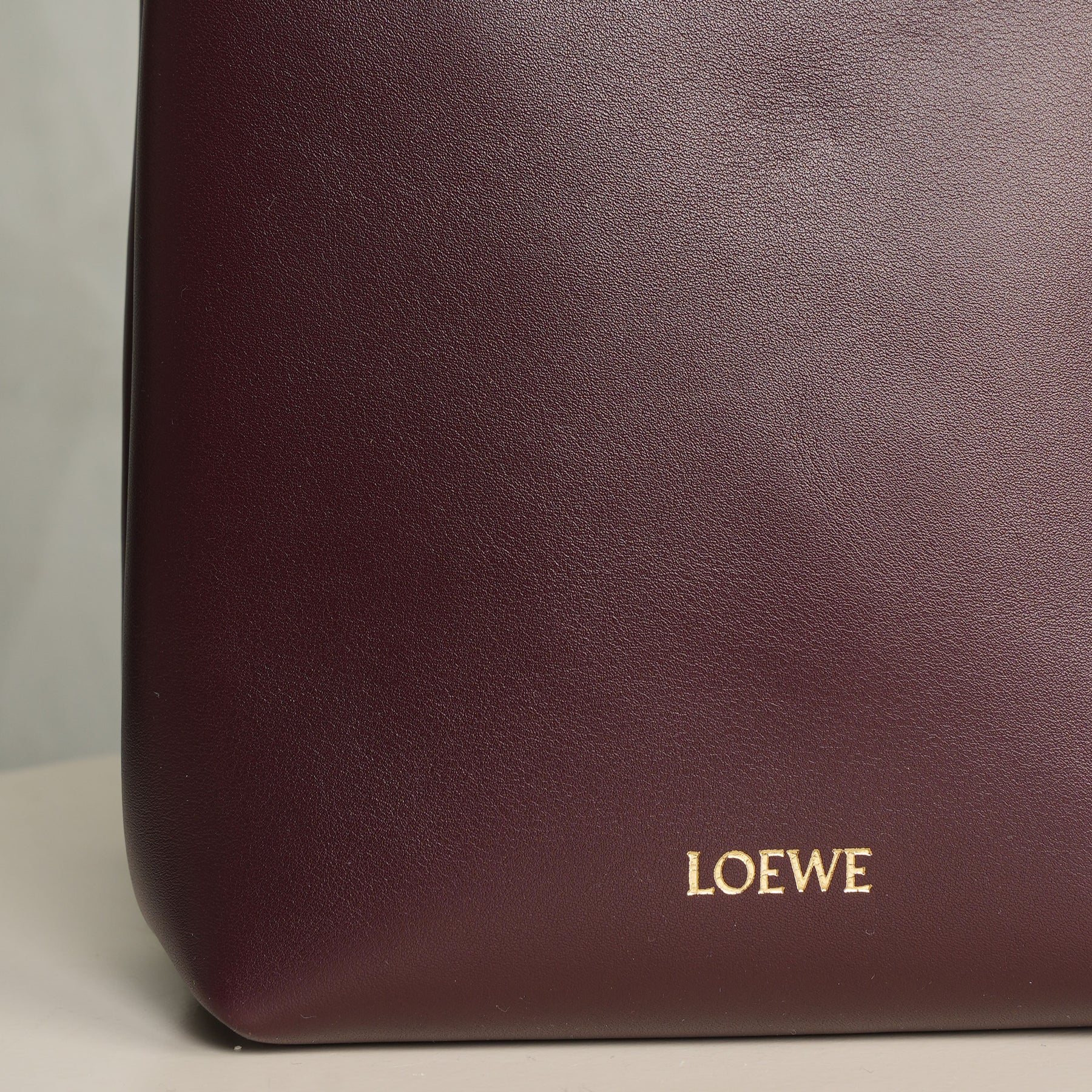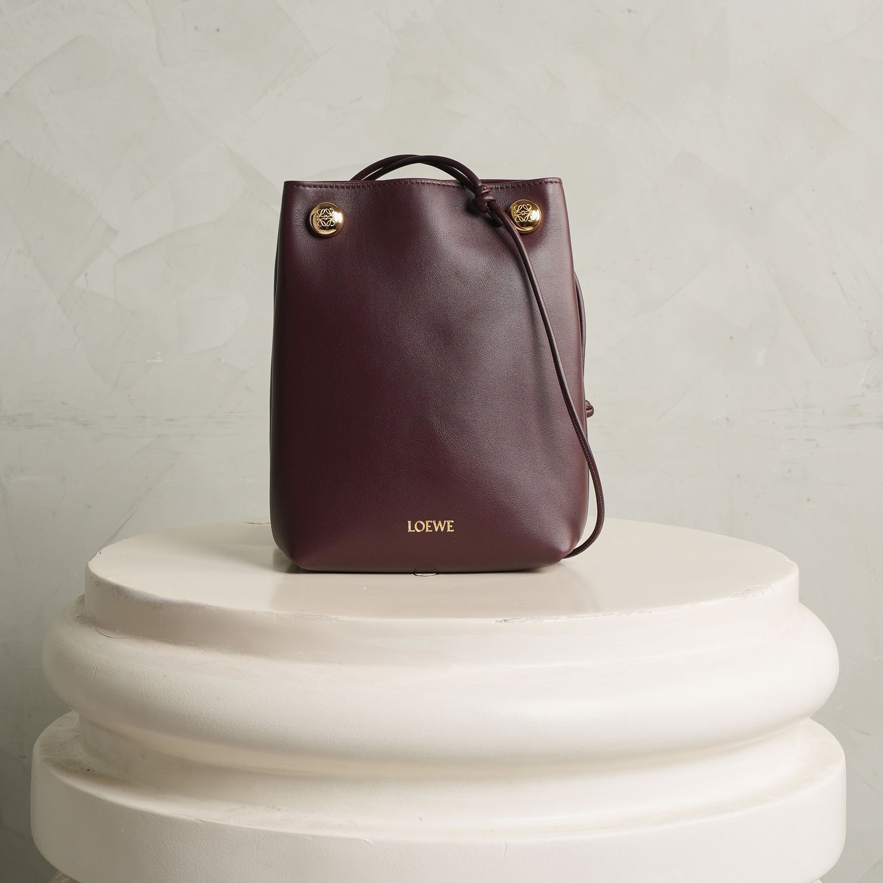 Discover Loewe's Pebble Pouch Bag. This bag features a clean, vertical silhouette, crafted in deep burgundy with a smooth, structured finish. The minimal form is punctuated by two subtle gold-tone studs at the top, adding a quiet point of contrast without disrupting its simplicity. Designed to sit close to the body, it features a slender strap for effortless crossbody wear, keeping essentials within easy reach.