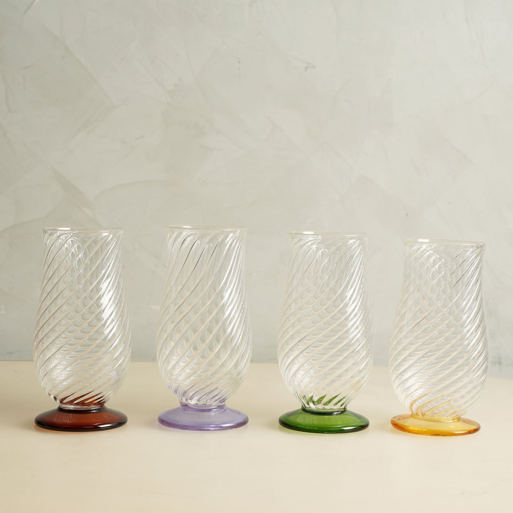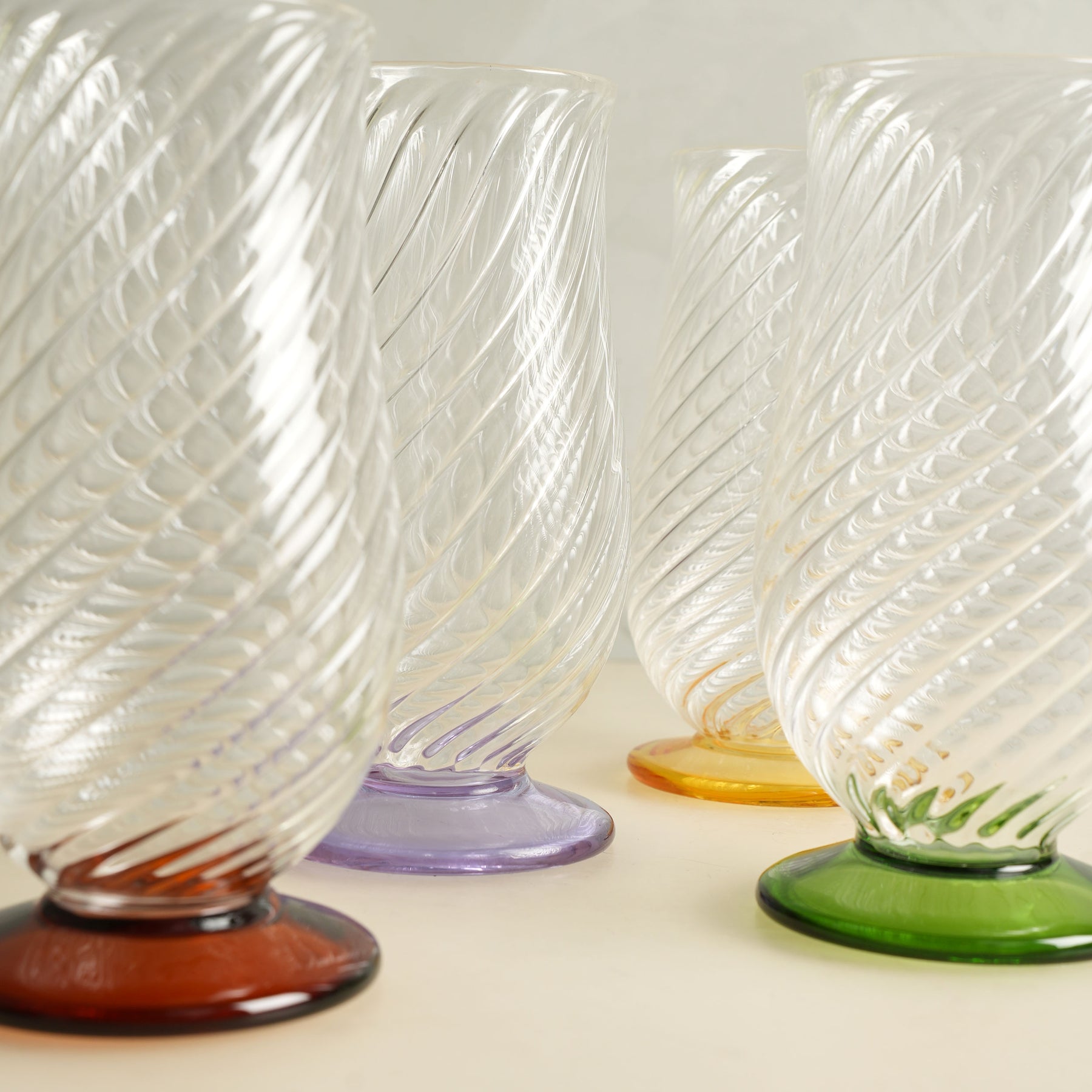 The Pop Twist Glass Set combines four handblown borosilicate glasses, each in a different vibrant hue. Perfect for mixing at the table or bar, they turn every sip into a statement.