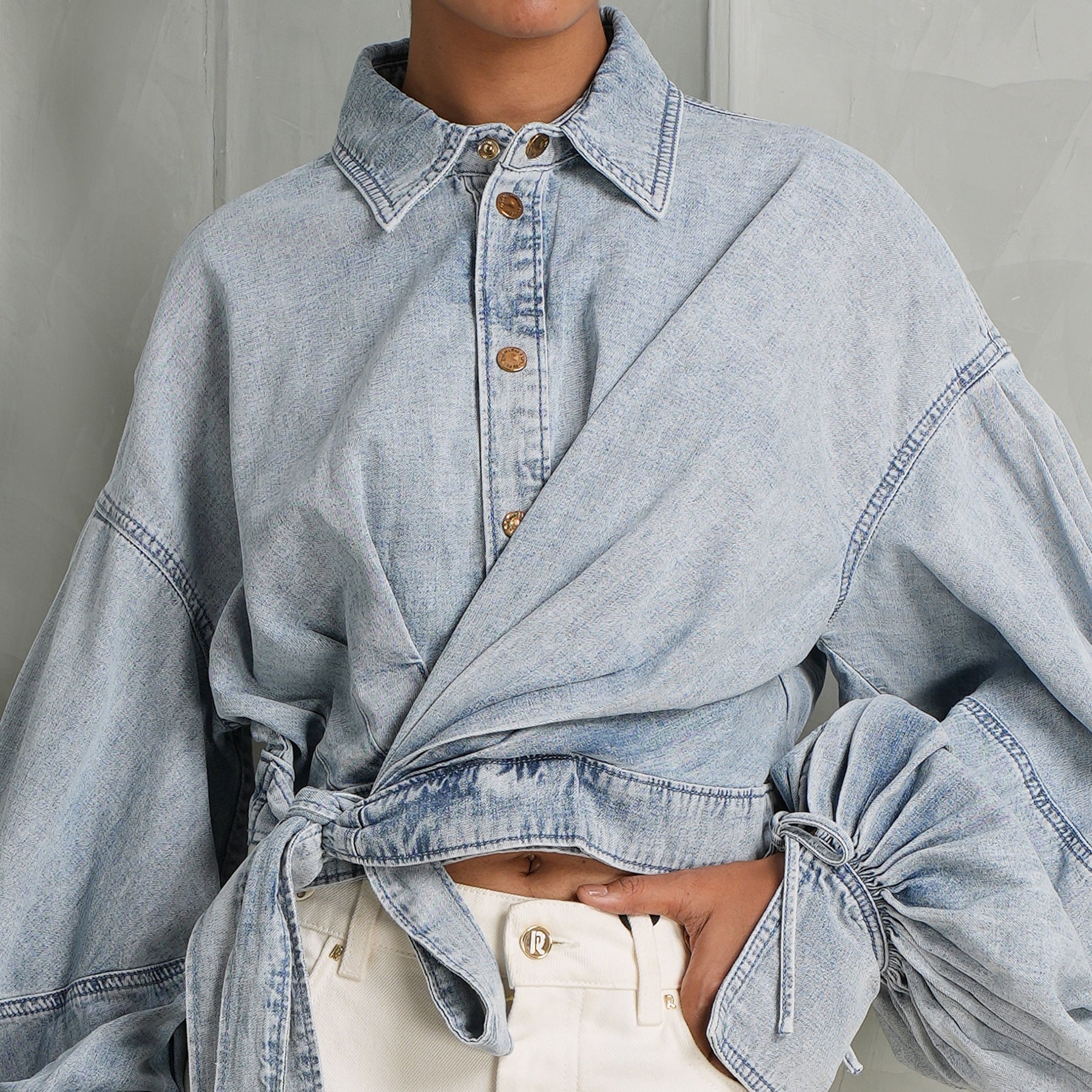 The Rebellion Denim Wrap Top from Zimmermann is a cropped denim silhouette, featuring a classic collar, gold snap buttons and dramatic billow sleeves with exaggerated cuffs. Finished with a wrap waist and self-tie belt to sculpt the shape, it blends romantic volume with a modern edge. Style this effortless piece with...