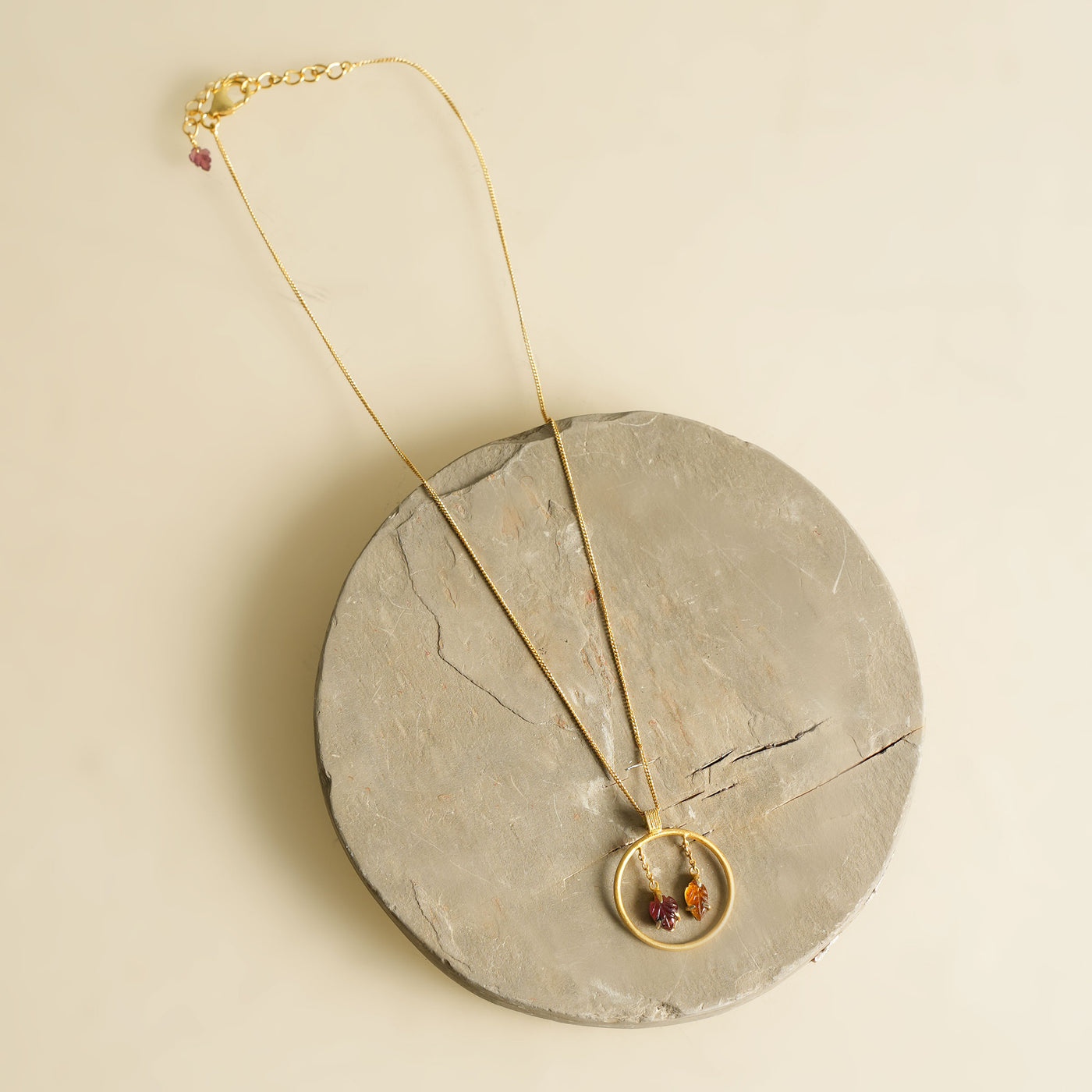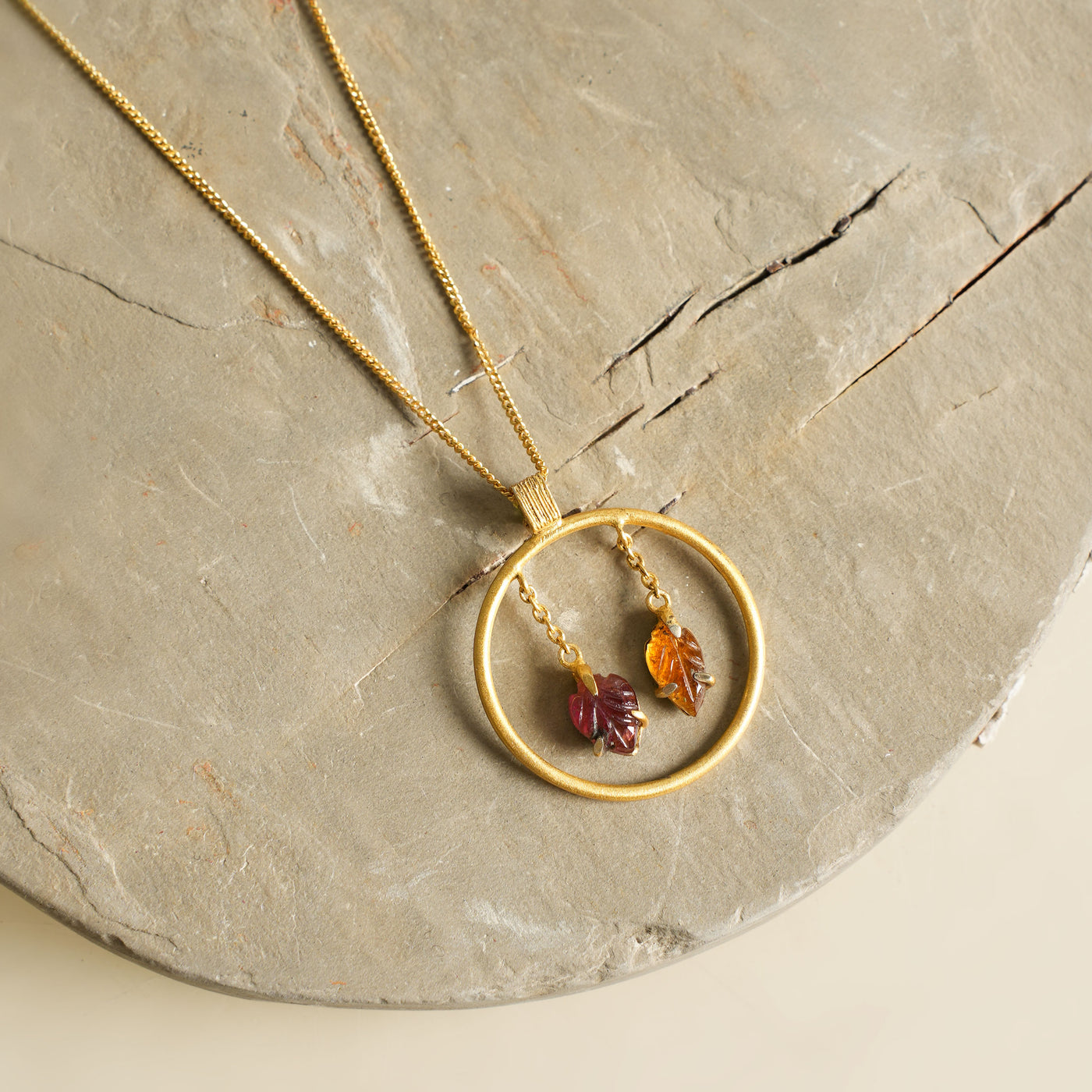 A celebration of nature's shifting palette, this Reversible Round Branch Pendant from Akansha Sethi captures two seasons in one design. Hand-carved tourmalines in fresh green tones evoke the vitality of spring, while the reverse features autumn's warmth in rich, earthy hues. Set in 18K gold vermeil and suspended from a fine chain, it offers versatile styling - two moods, countless ways to wear.