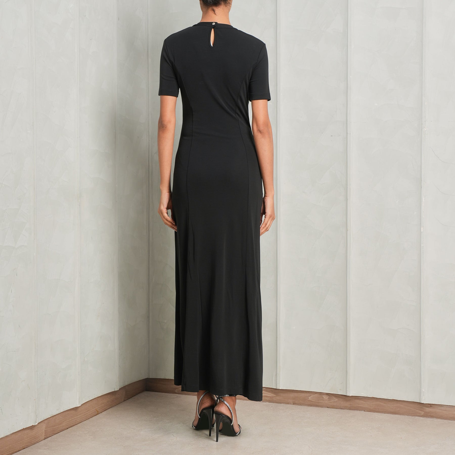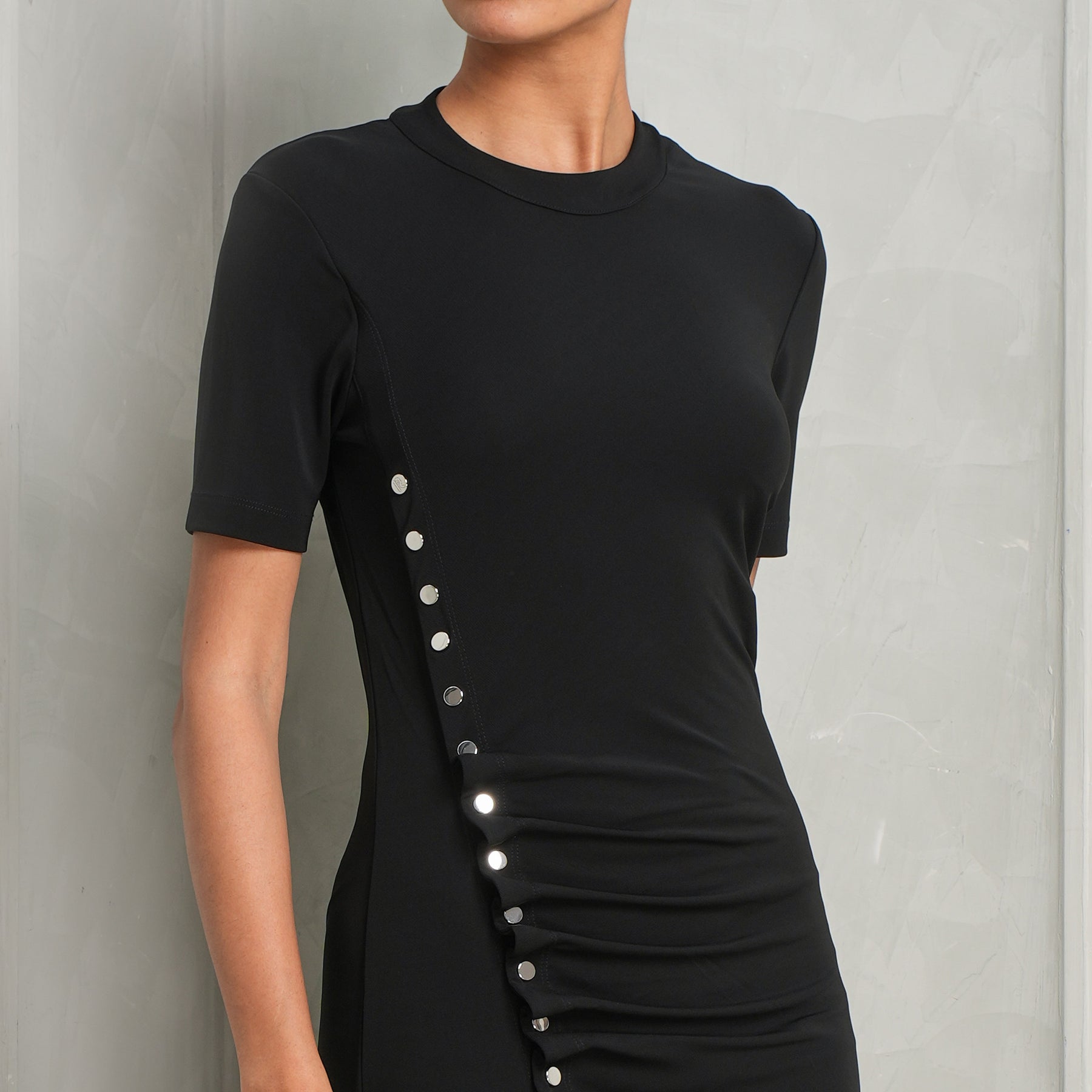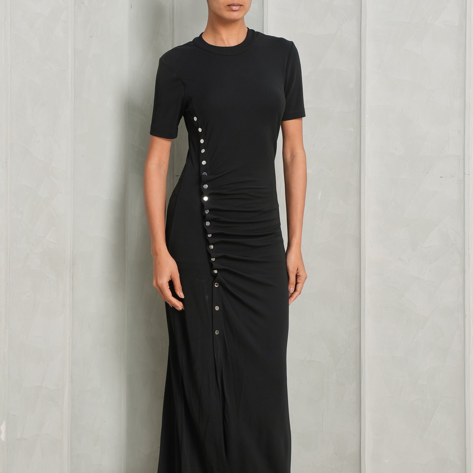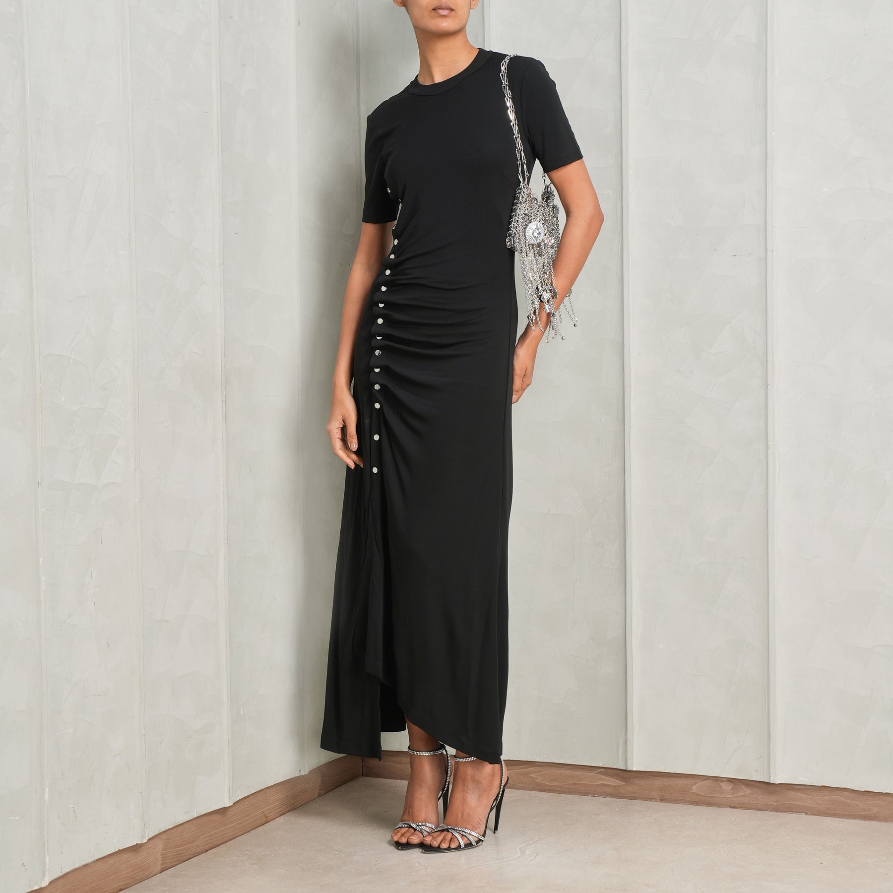 The Robe Long Dress from Rabanne is a sleek, body-skimming dress designed to contour with precision. Cut with a high neckline and short sleeves, it features soft draping through the waist, accentuated by a line of metallic button detailing that draws the eye along the silhouette. The asymmetrical gathering adds movement and dimension, balancing structure with fluidity. Minimal yet striking, it’s a refined statement for both day and evening. Style it with...