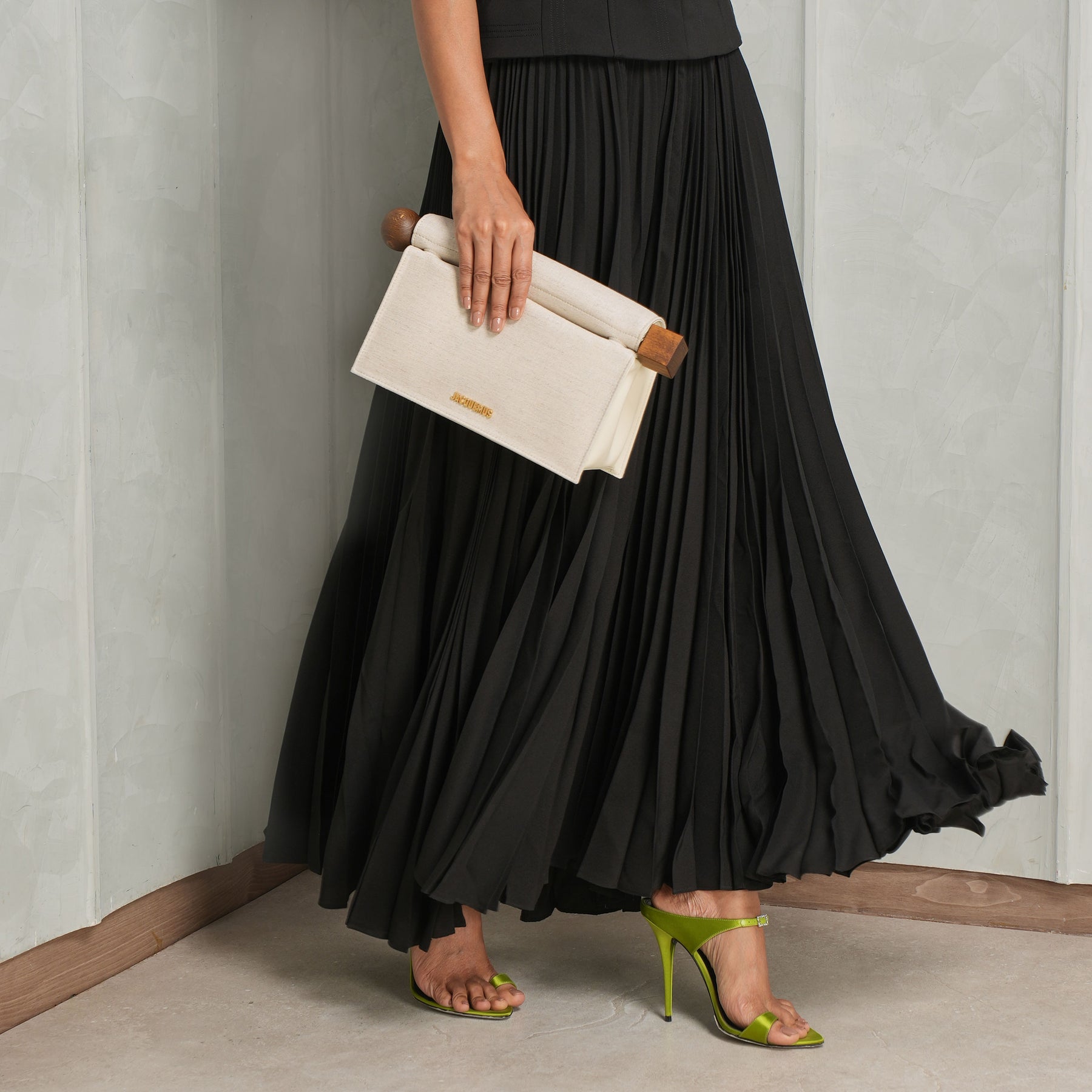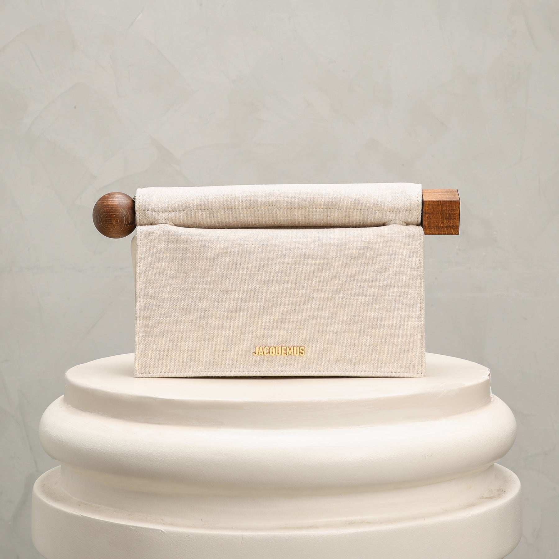 Introducing the Jacquemus Rond Carré Clutch - a study in playful geometry. This clutch is crafted in folded linen with a smooth lambskin leather trim. The silhouette boasts a gentle roll that reveals the interior, secured by a magnetic closure and finished with oversized wooden circle and square accents. Fully lined in cotton with an interior card pocket and gold metal hardware, it’s a tactile, modern statement piece that balances function with unexpected form.