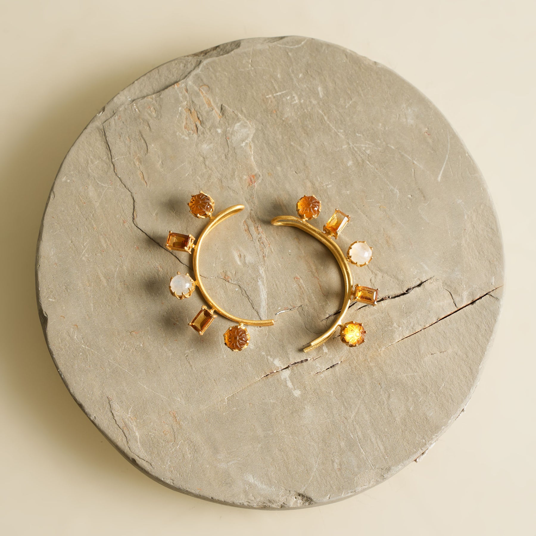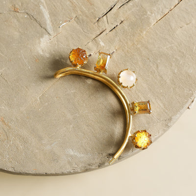 Effortless and striking, the Roshni Ear Climbers from Akansha Sethi are designed for ear stacking - no extra piercings required. They glide seamlessly along the curve of the ear and are crafted to remain whisper-light while making a striking impression. Adorned with luminous moonstones and citrines, these earrings boast golden tones that capture the shifting play of light with every movement.