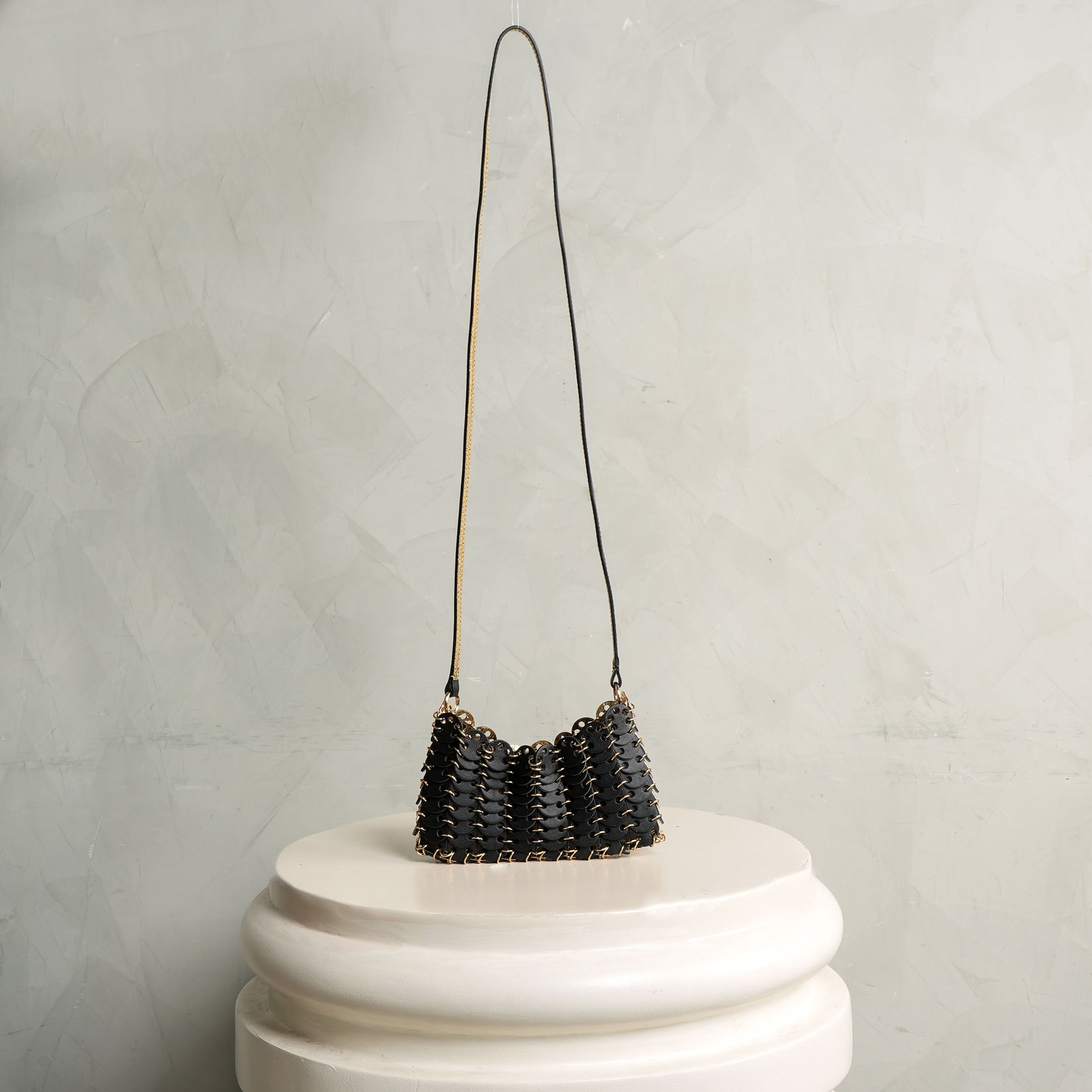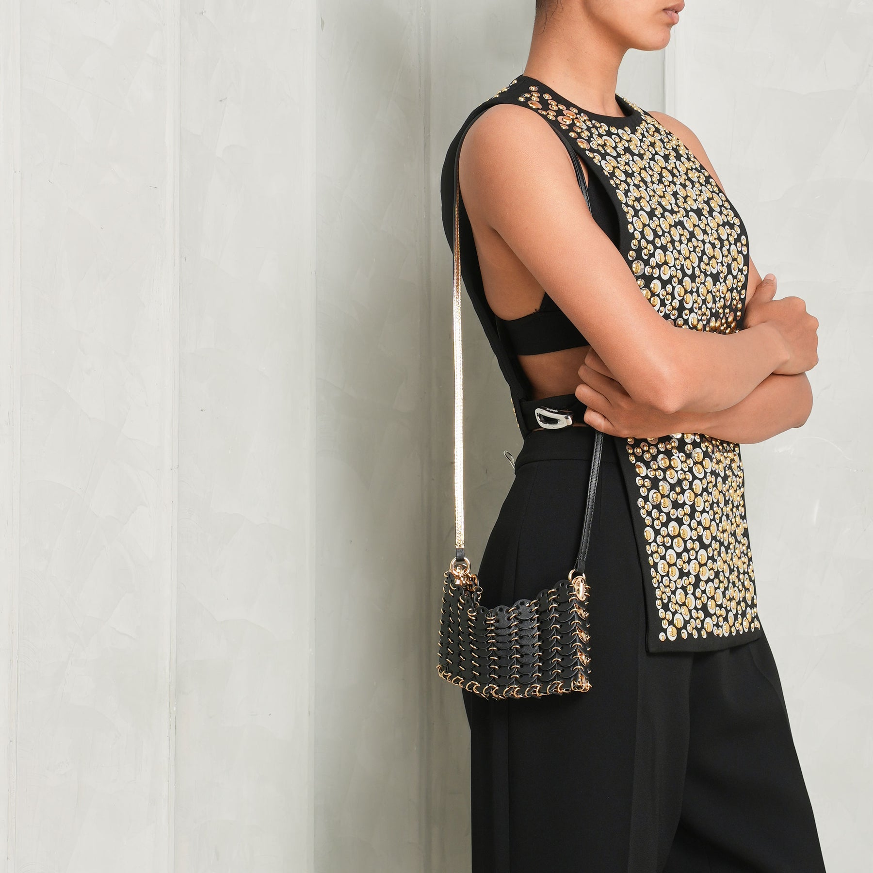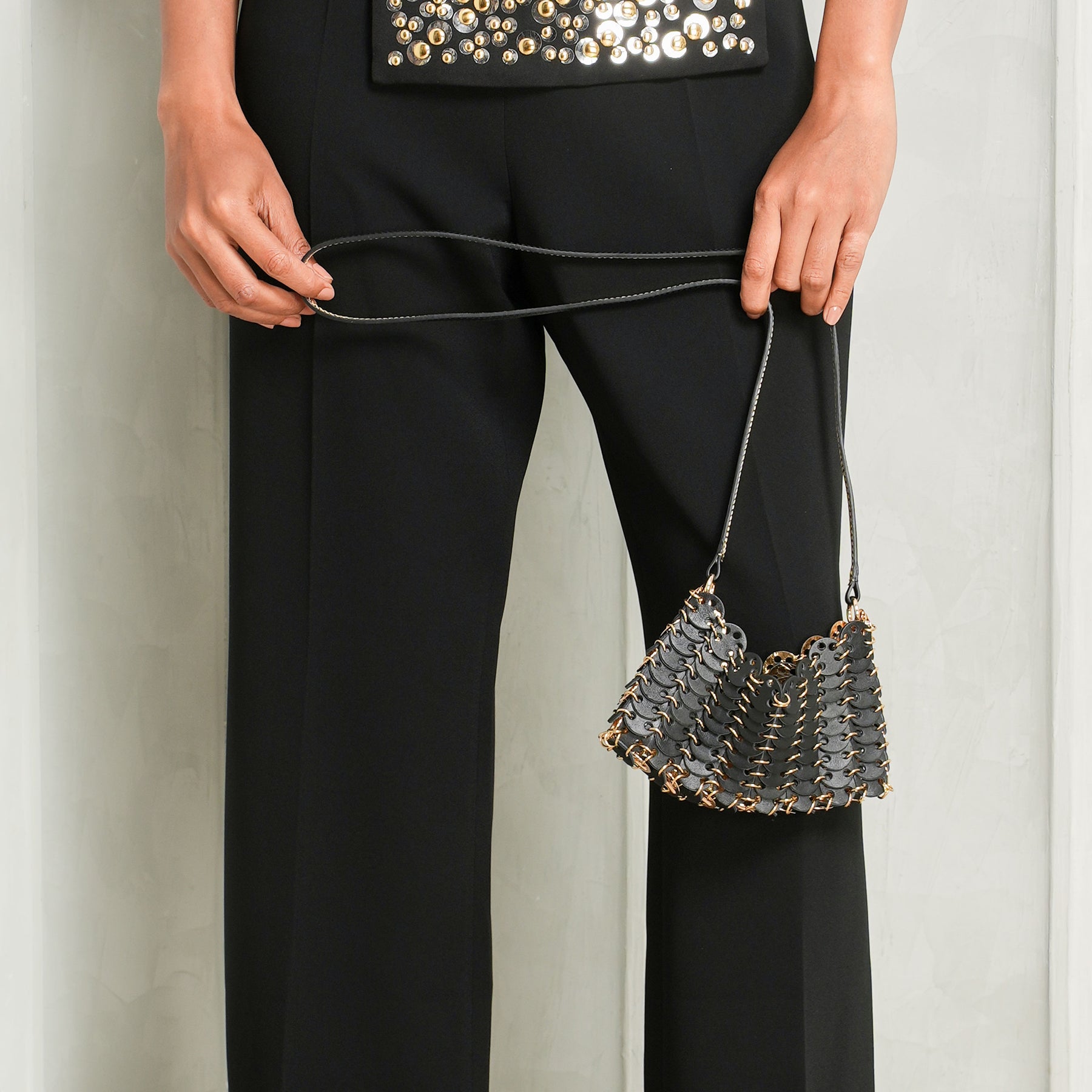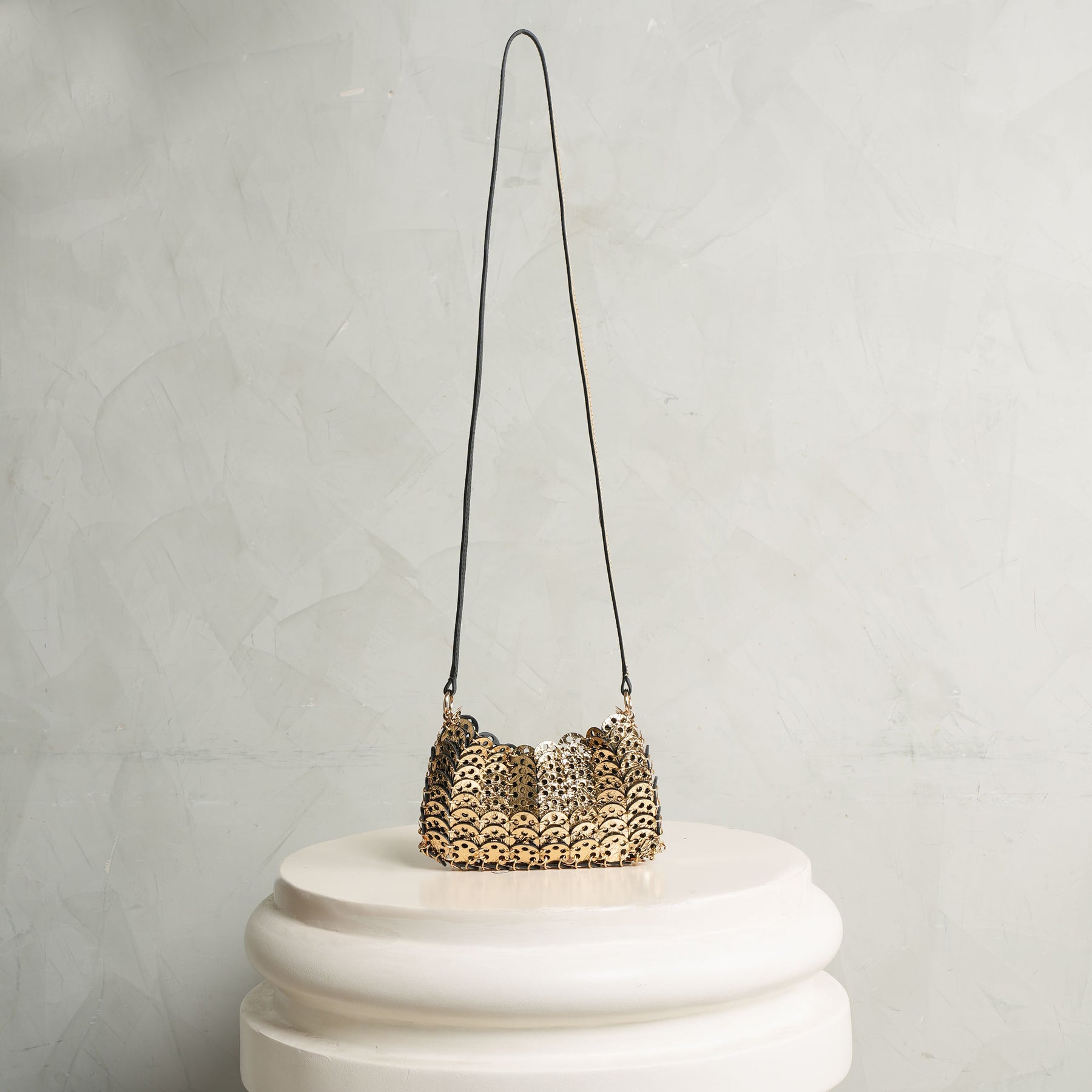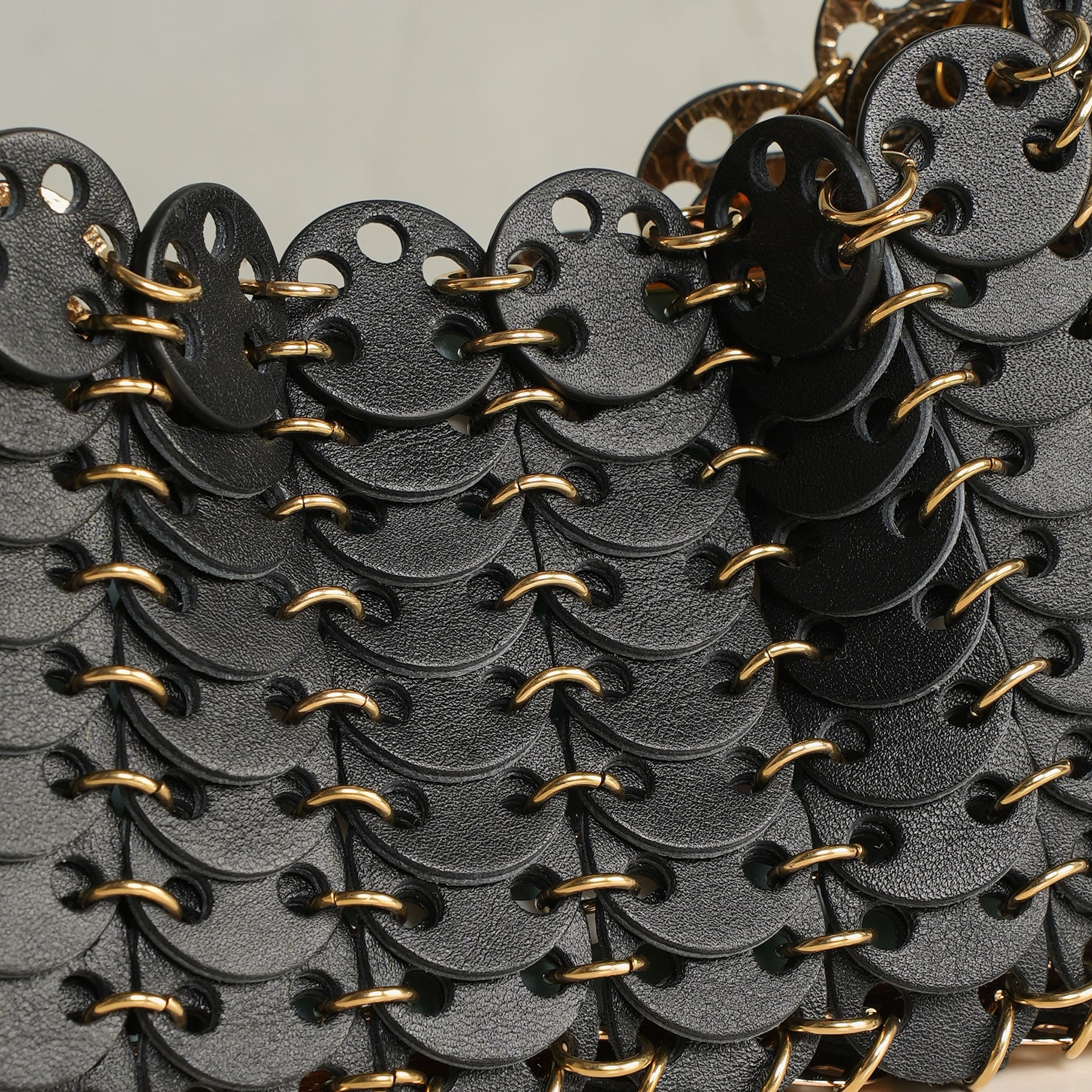 The Rabanne Nano Teardrop Evening Bag is a true cult classic of the house. Crafted in a mini-sized interpretation of the iconic clutch, it is handmade from fuchsia discs with an iridescent sheen that catches the light with every movement. Finished with the signature logo chain, the design offers versatile wearm- carried by hand, over the shoulder, or crossbody, while remaining unmistakably Rabanne.