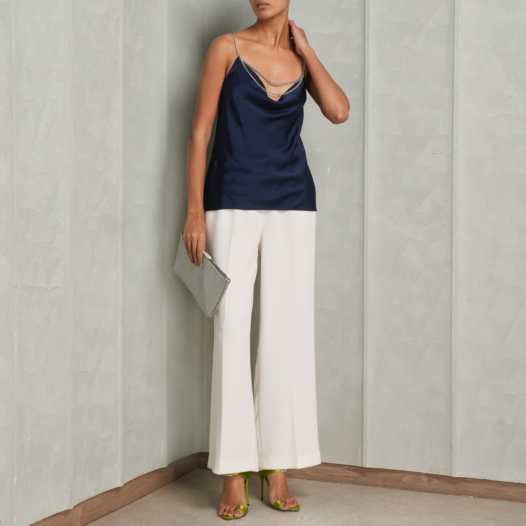 Meet Rabanne's Satin Tank Top, crafted in a signature navy blue hue. This sleeveless tank top features a softly draped cowl neckline that adds a touch of effortlessness. The silver chain detail at the neckline introduces a delicate yet striking contrast, embodying contemporary edge. Designed for versatility, this top is perfect for casual styling with a refined edge. Complete this look with Silver Mesh Pouch from Rabanne and Cillion Straight Pants from Simkhai.