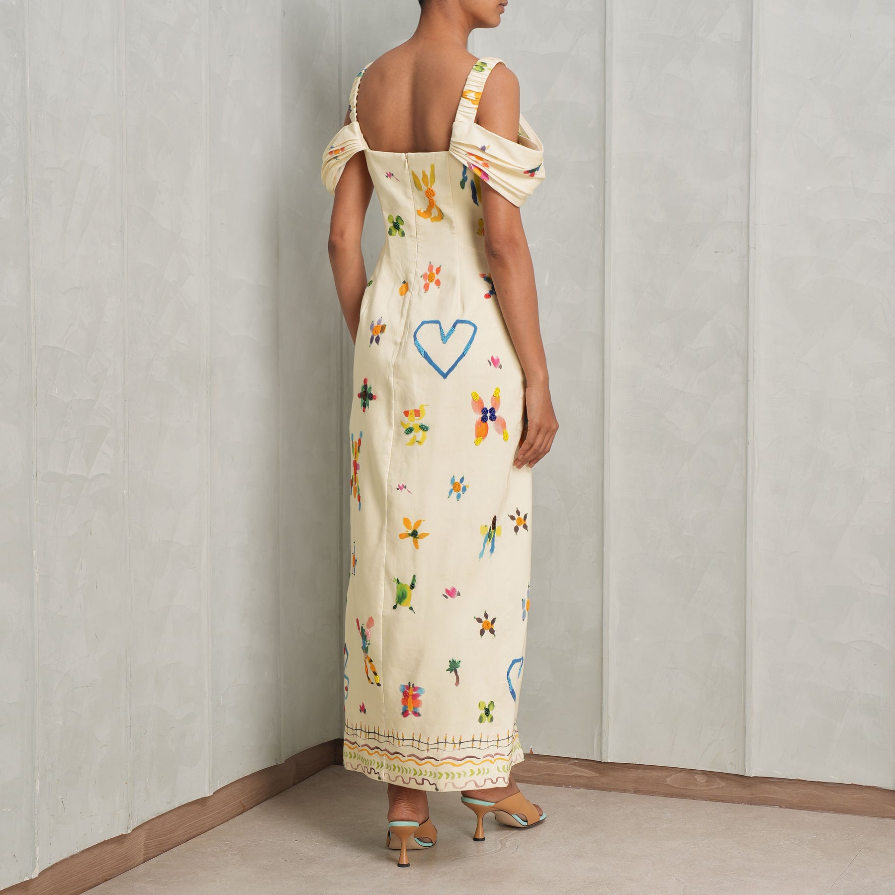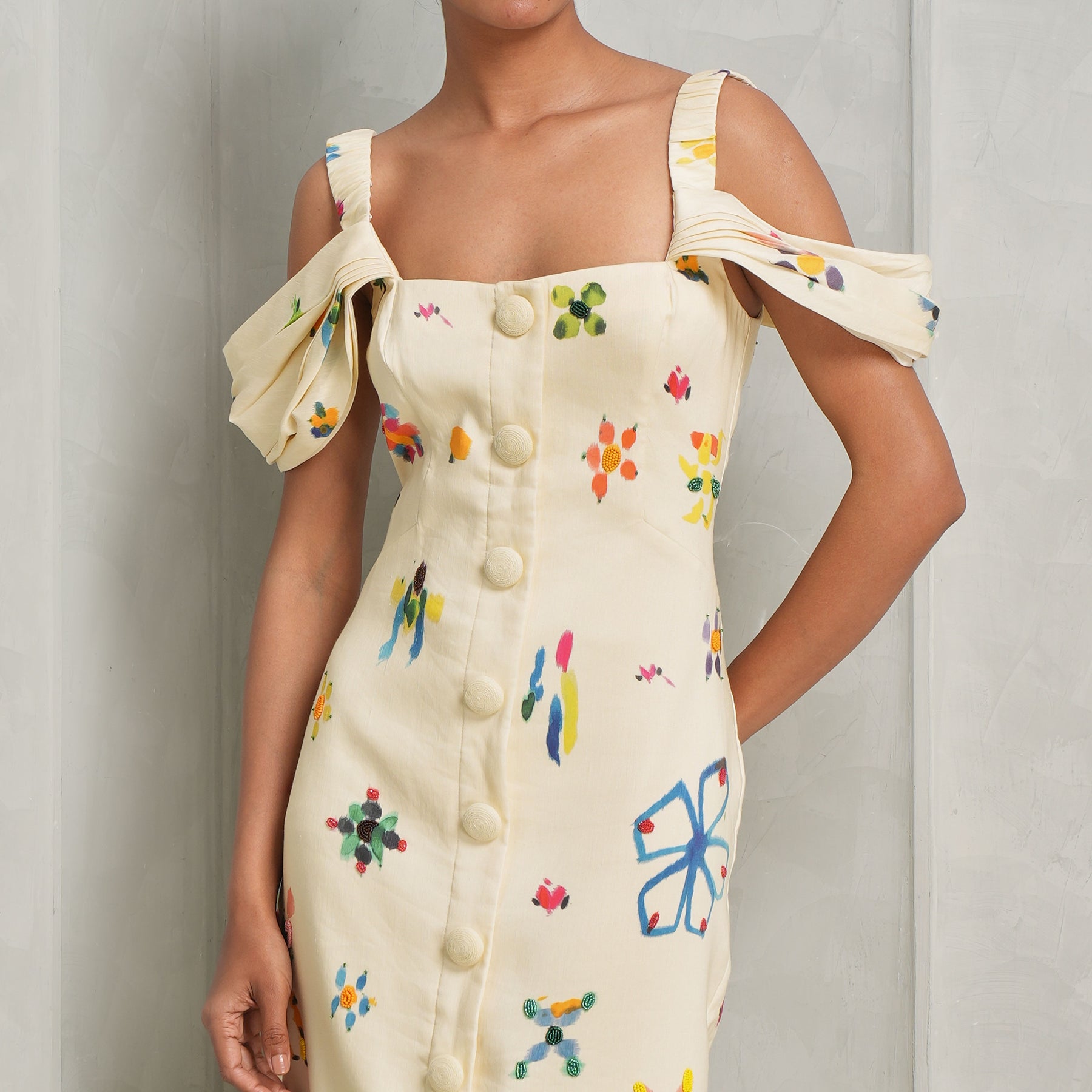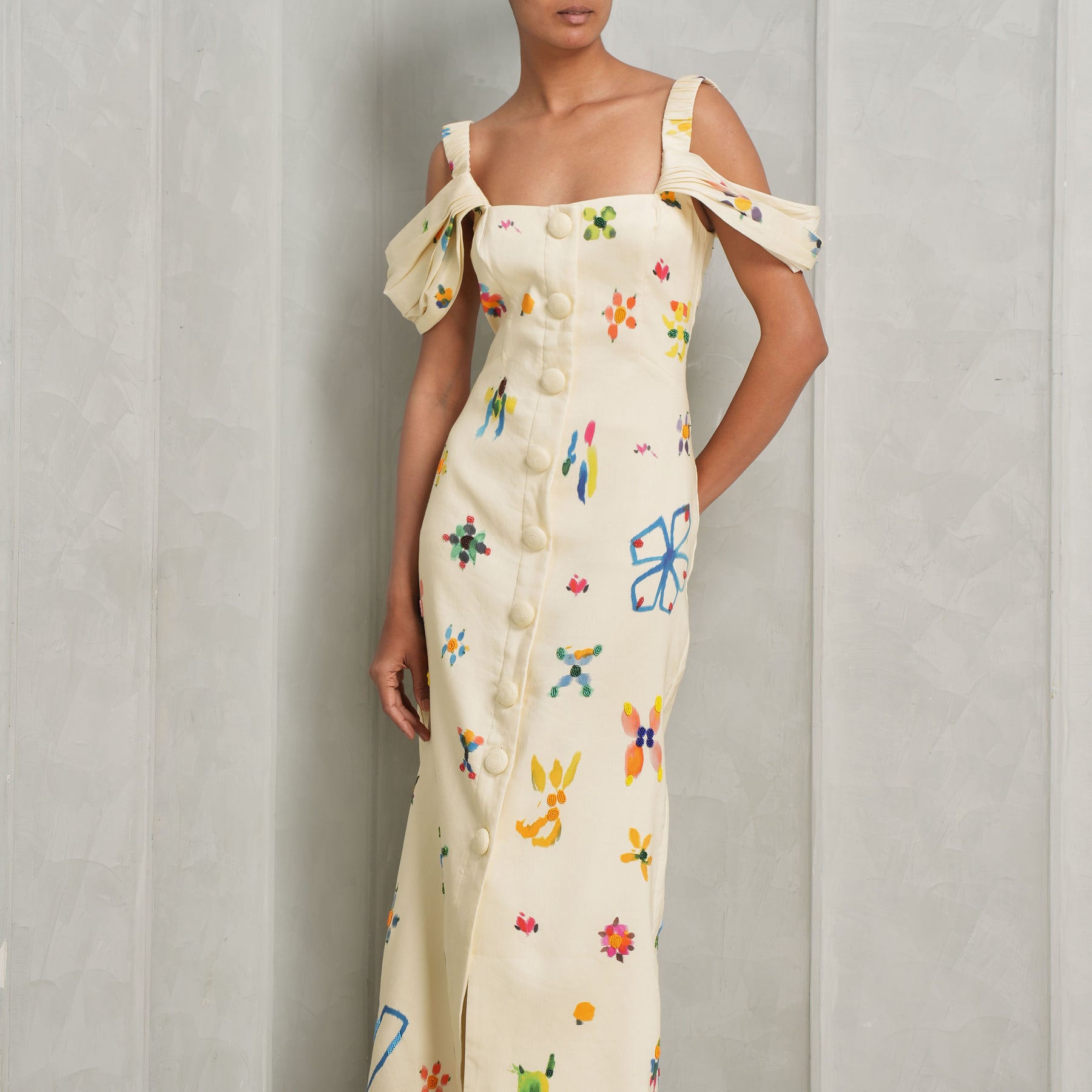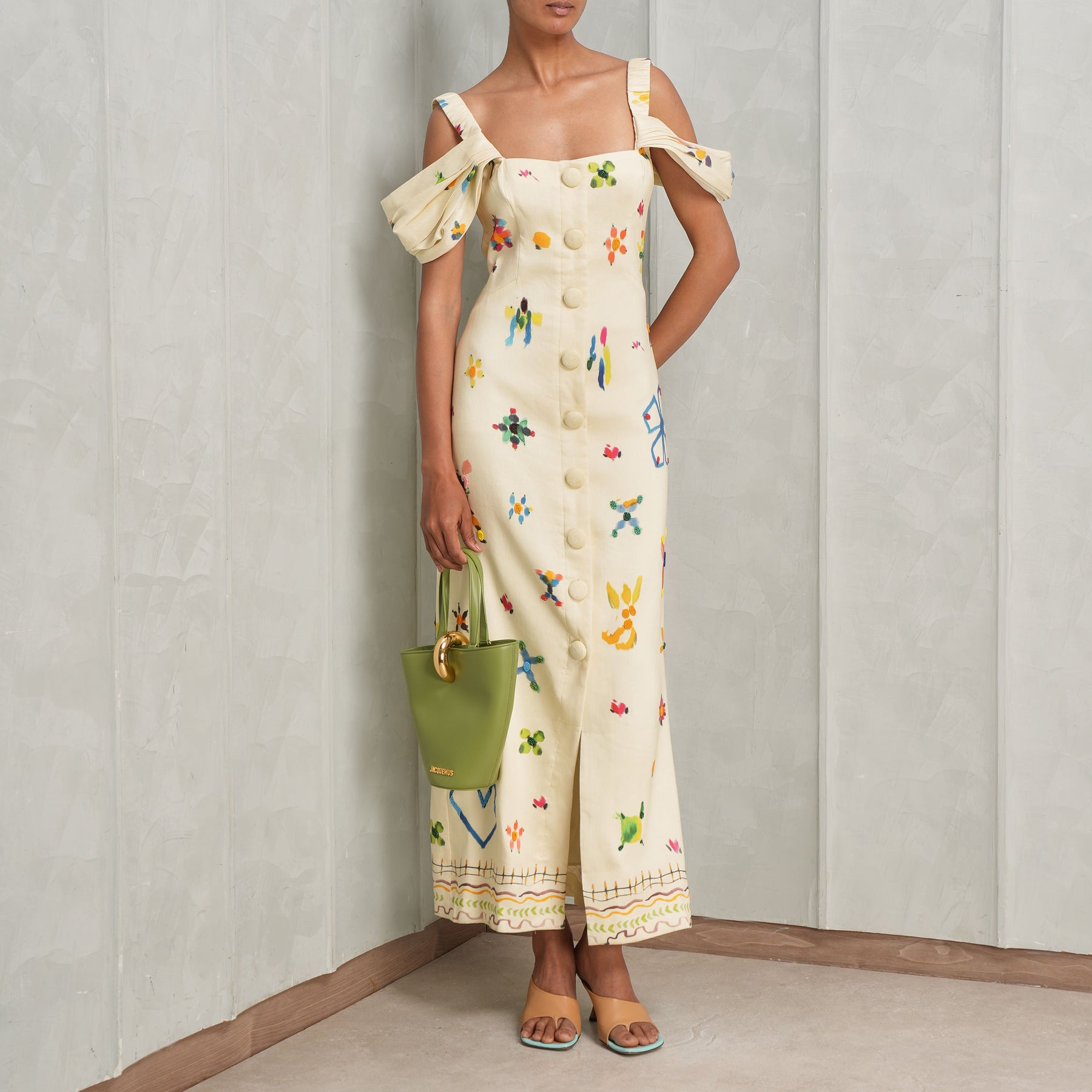 The Sidi Midi Dress from Alemais features a fitted midi silhouette with a structured square neckline. Off-the-shoulder gathered layered sleeves add soft volume and movement, balancing femininity with a modern, sculpted shape. Style this with Bambola bag from Jacquemus.